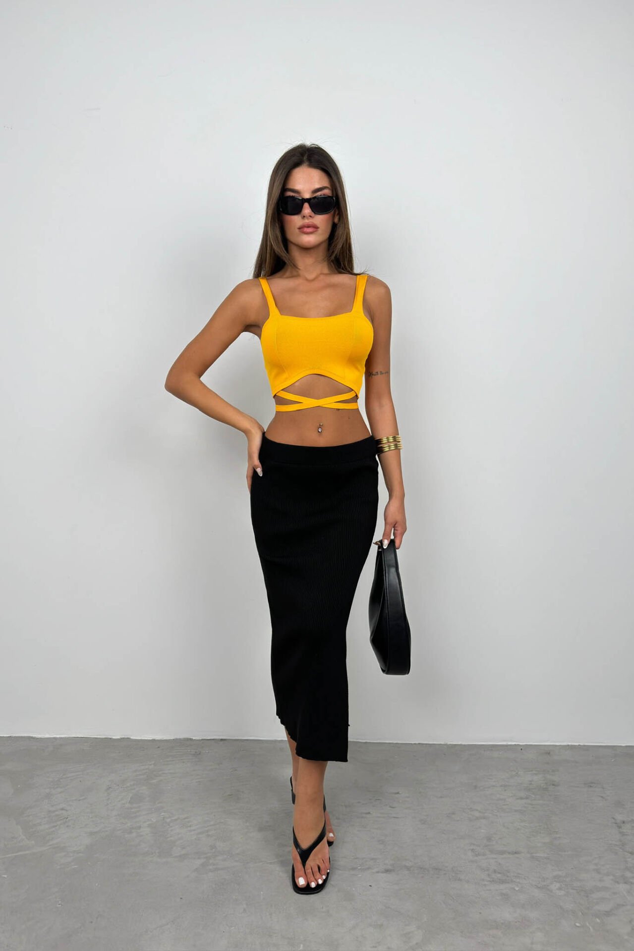 بلوزة تريكو قصيرة مع ربطة خصر، تفاصيل دانتيل غير متماثلة، حزام سميك، رقبة مربعة، لمسة نهائية مثلثة