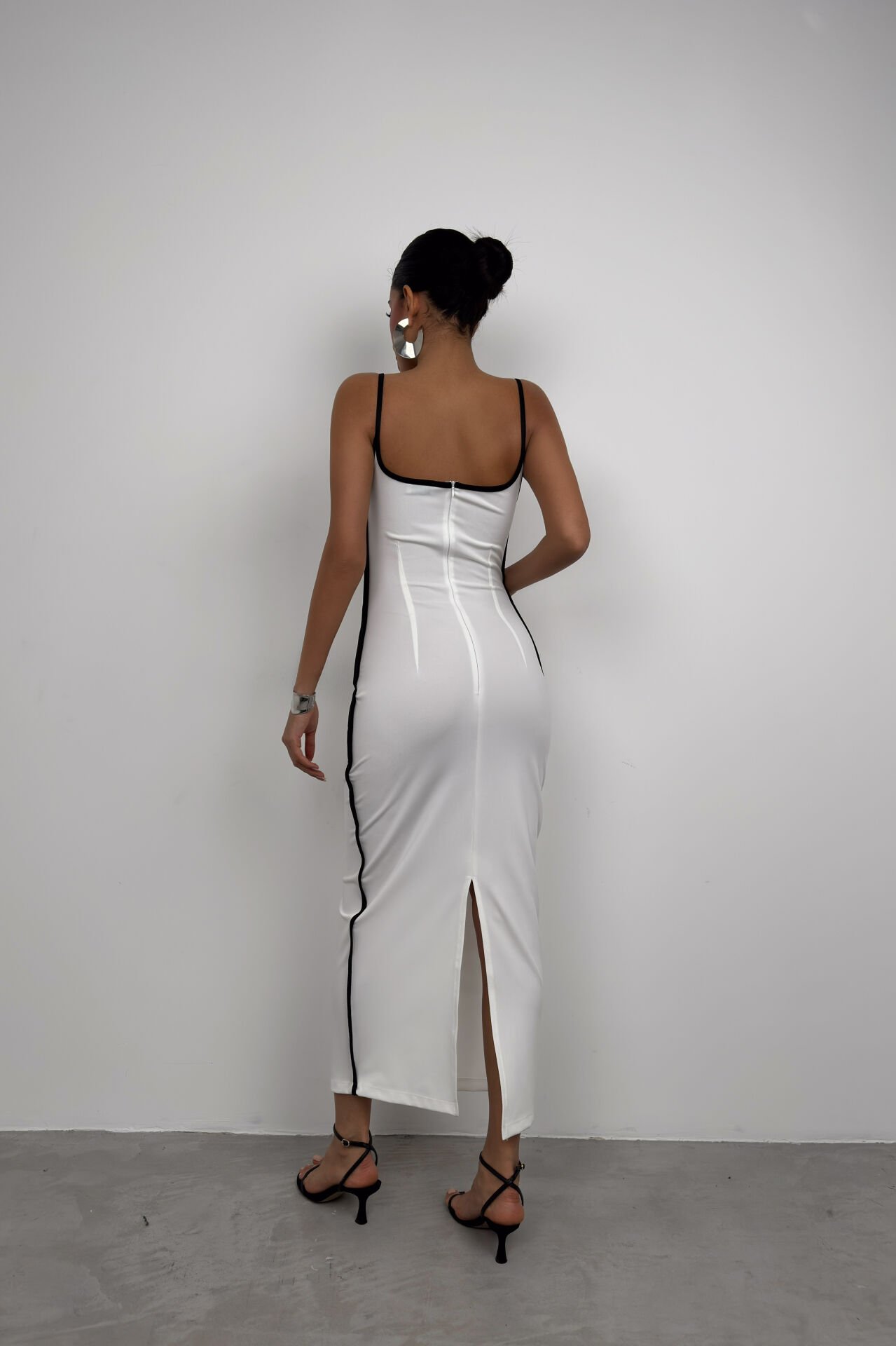 Toptan Biye Detay Askılı Kalp Yaka Beyaz Elbise