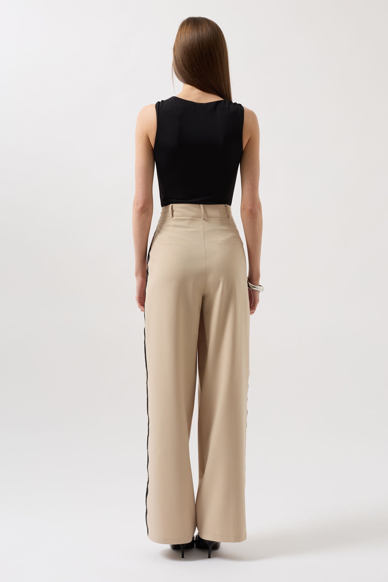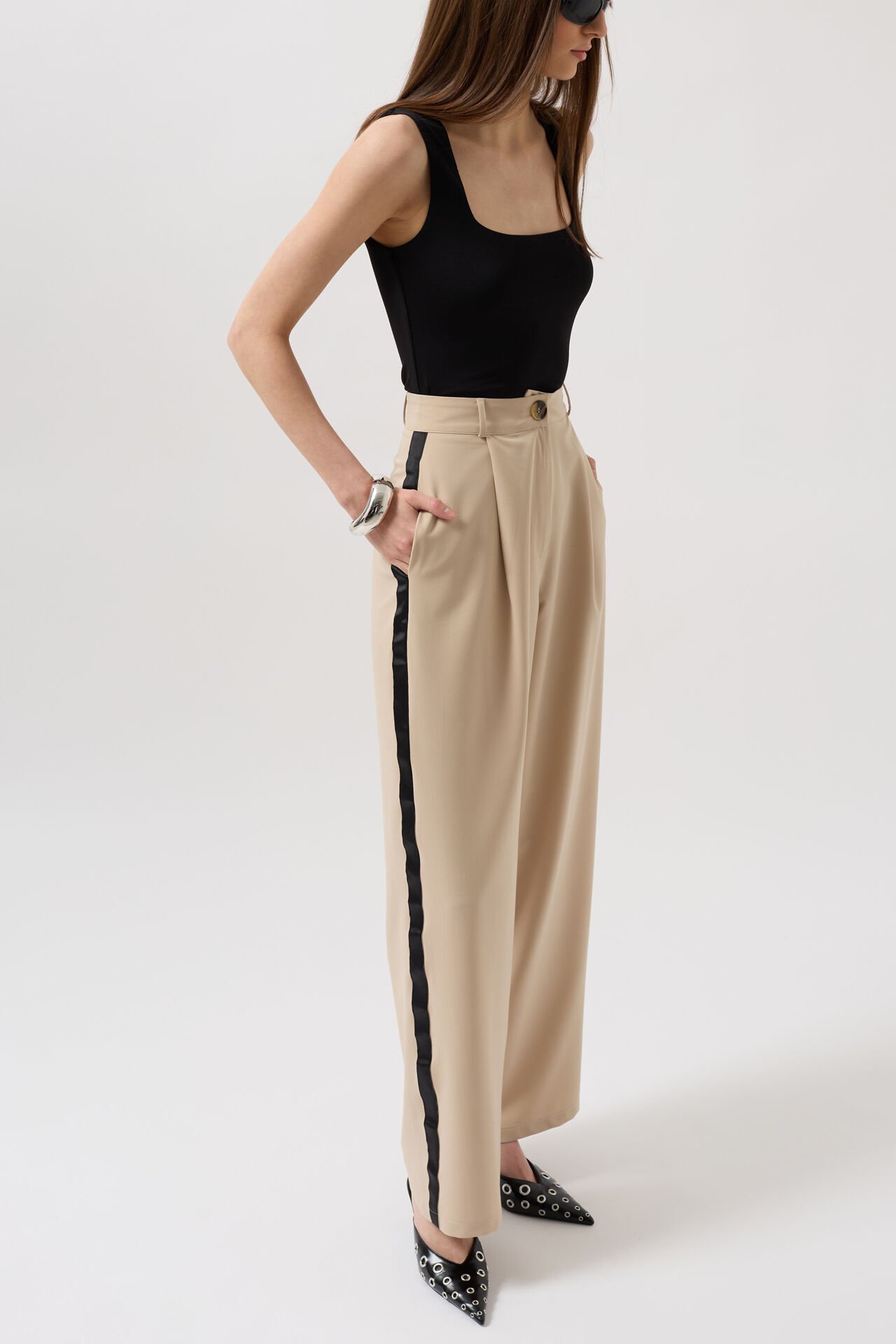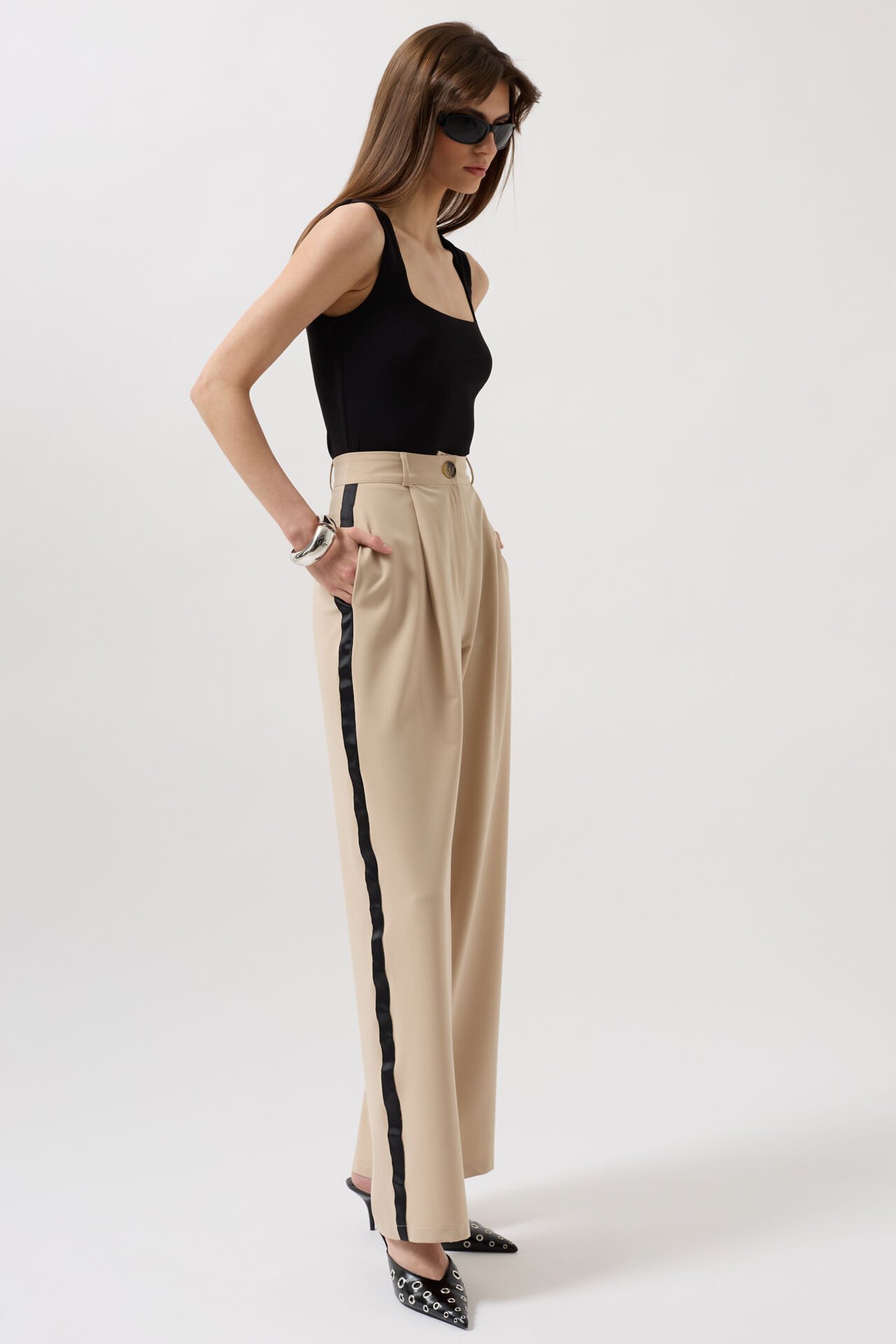 بنطلون بقصّة مستقيمة مع جيوب جانبية مزدوجة، وغطاء جيب خلفي وهمي، وطيّات مزدوجة، وسحاب وزر واحد، وتفاصيل خطوط متباينة على الجانبين