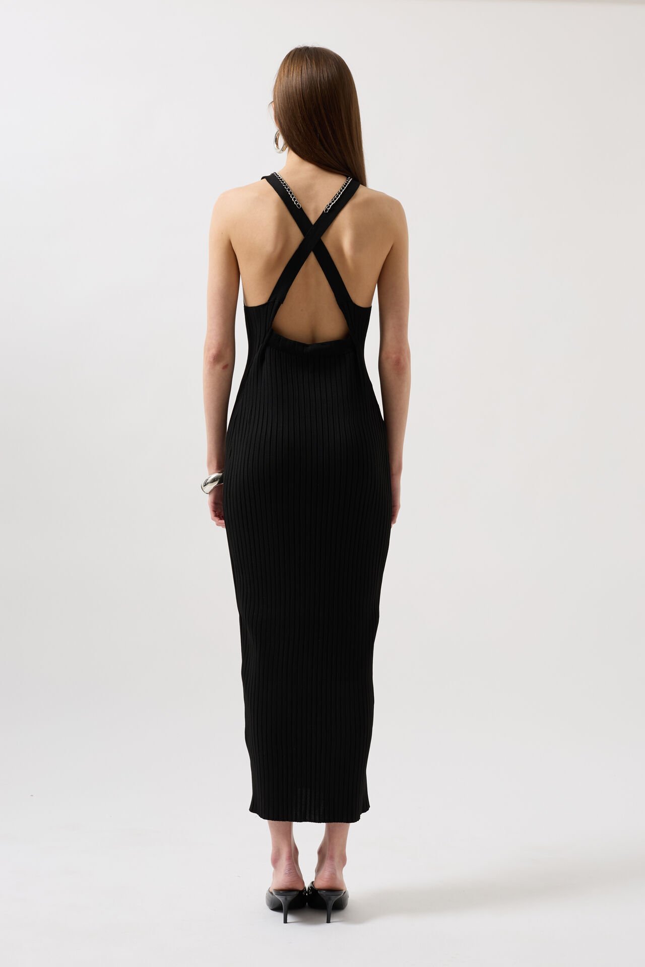 Toptan Halter Yaka Zincir Aksesuarlı Çapraz Askılı Siyah Elbise