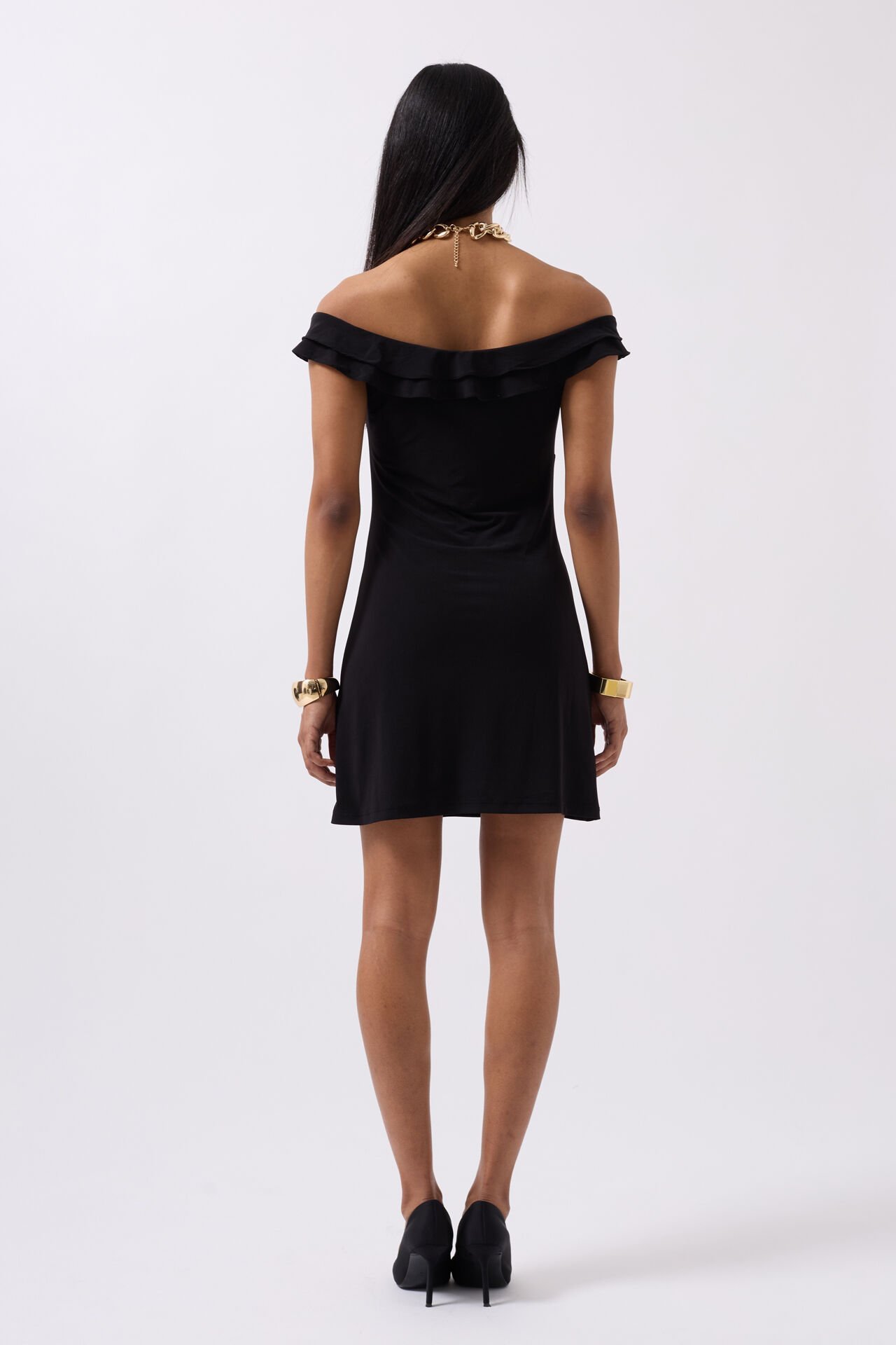 فستان قصير بتفاصيل تجميع أمامية، مكشوف الكتفين، مصنوع من الليكرا وقماش مرن