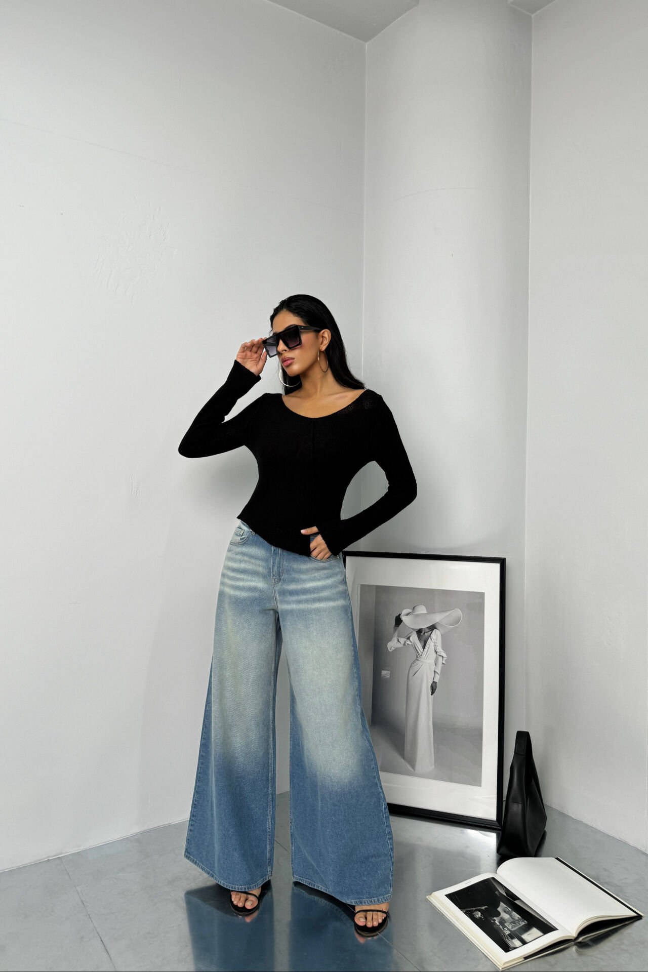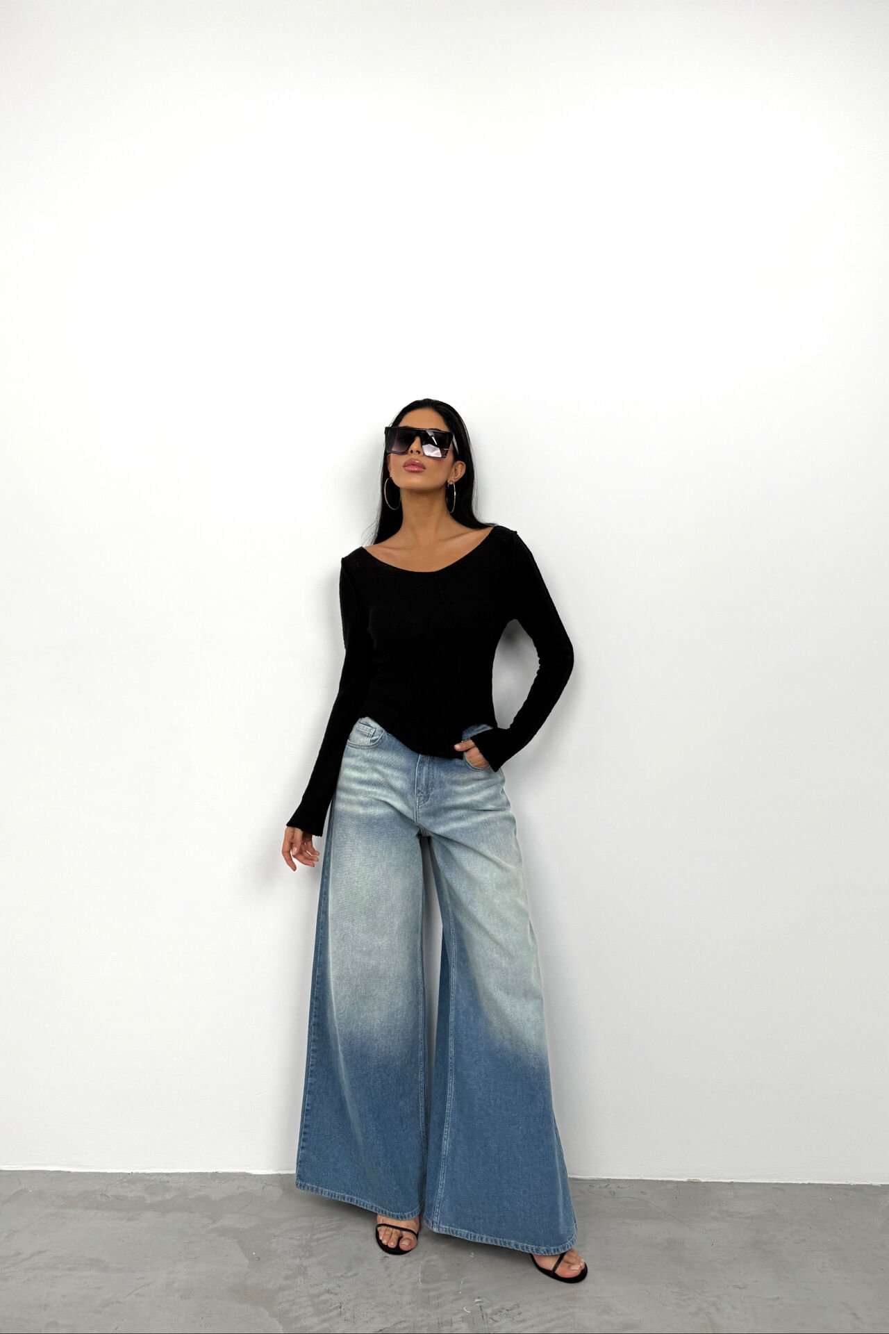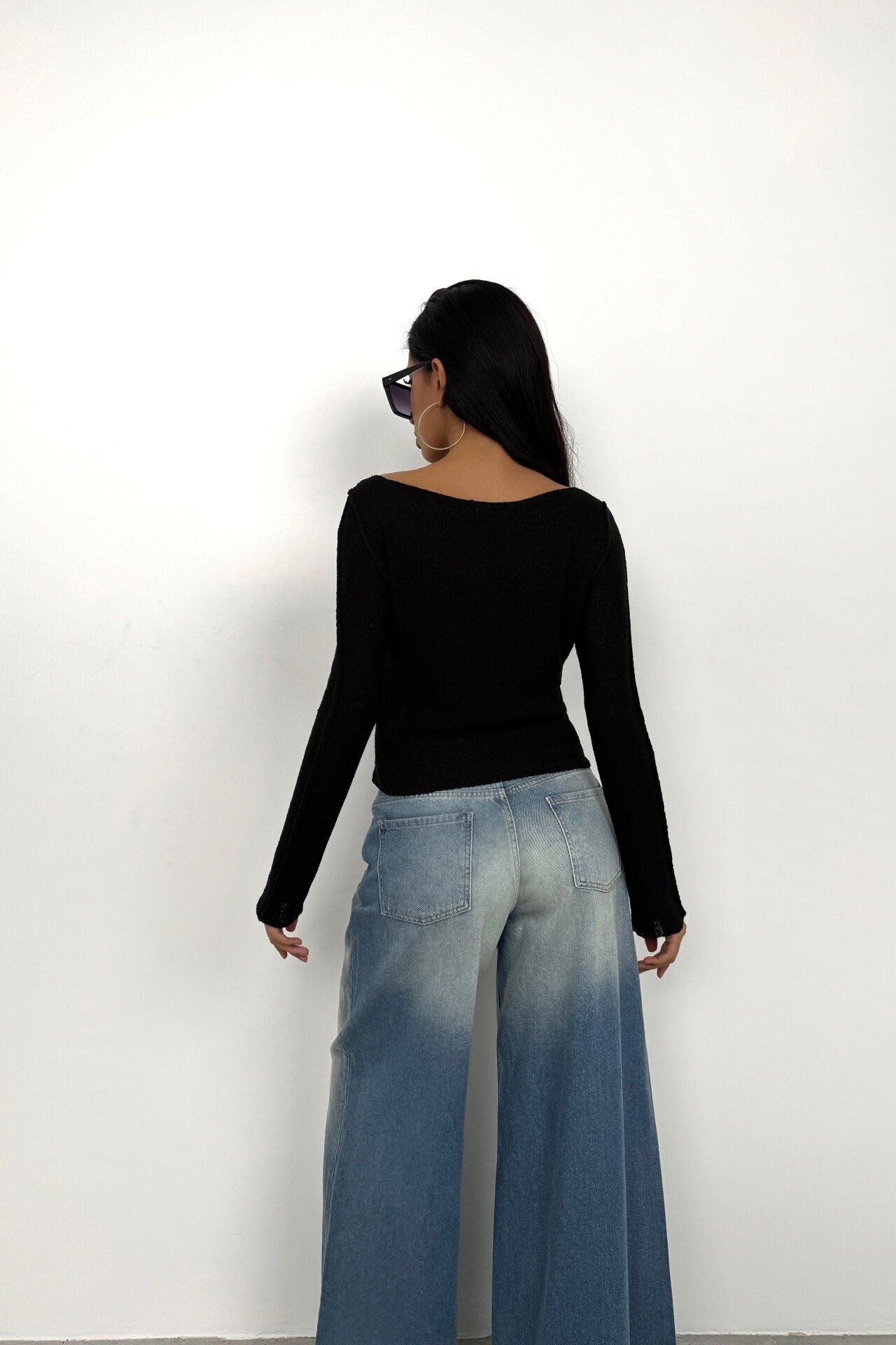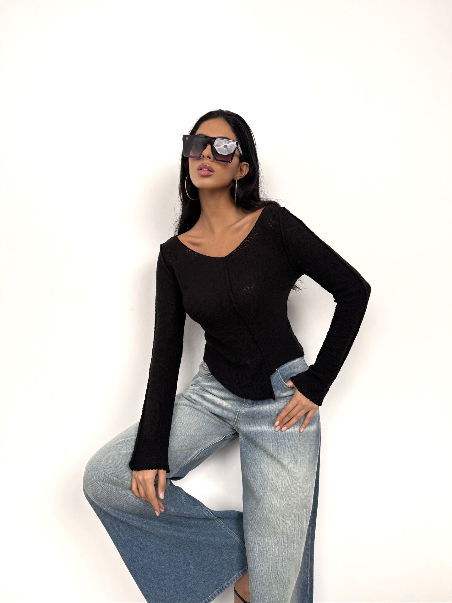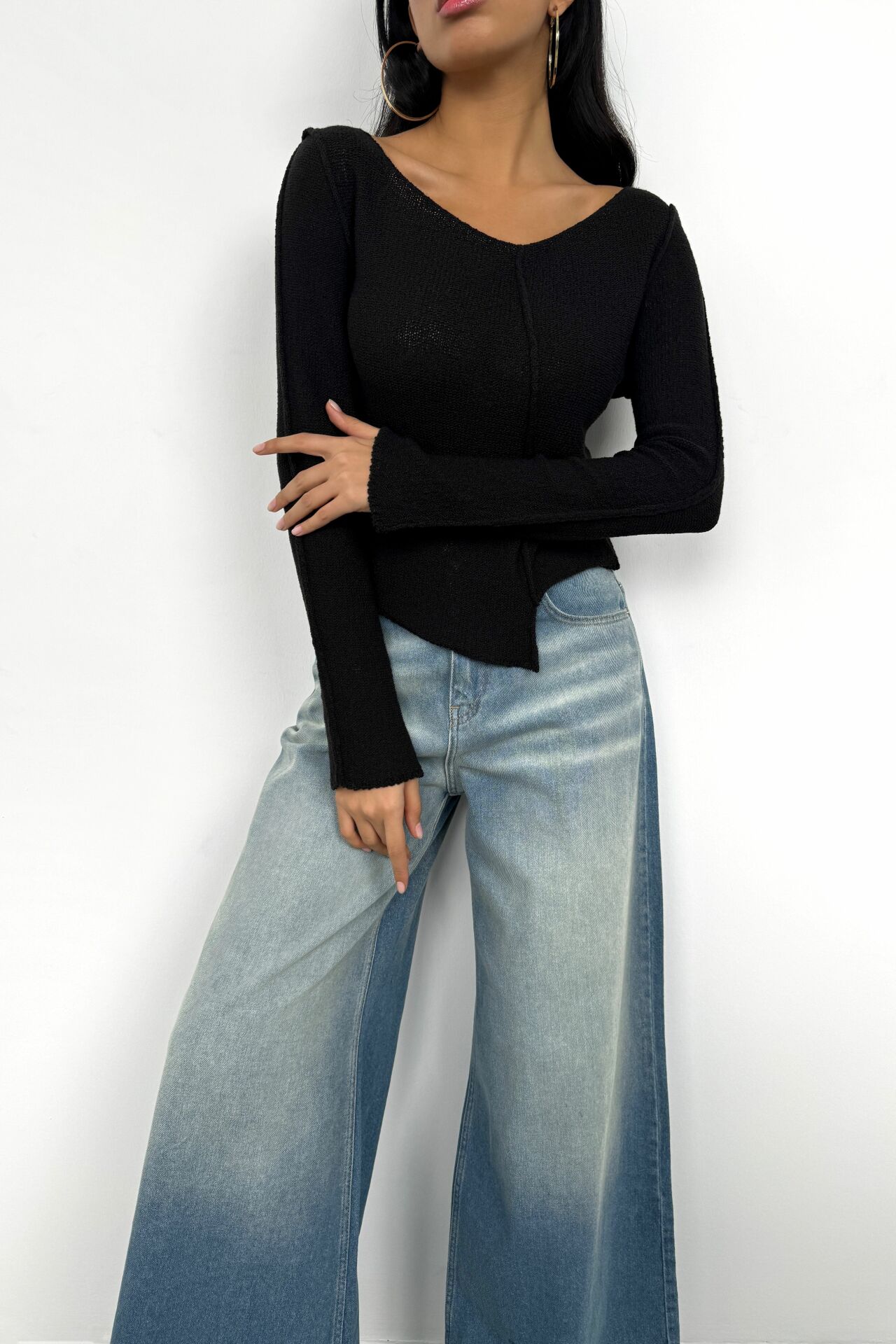 Toptan Ters Dikiş Detay Siyah Triko Bluz