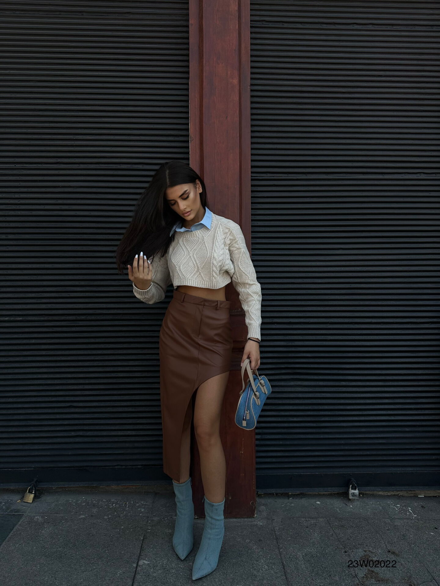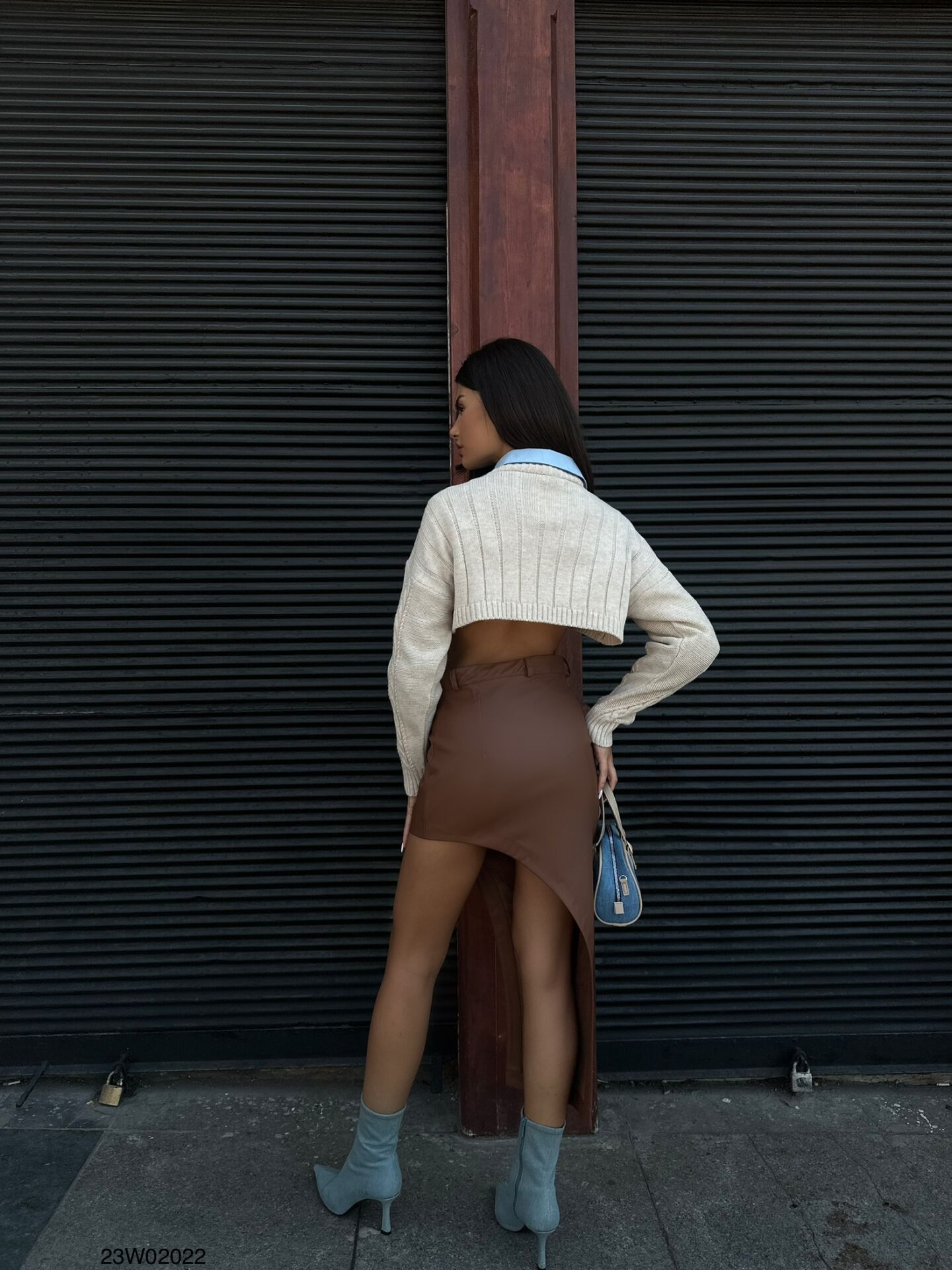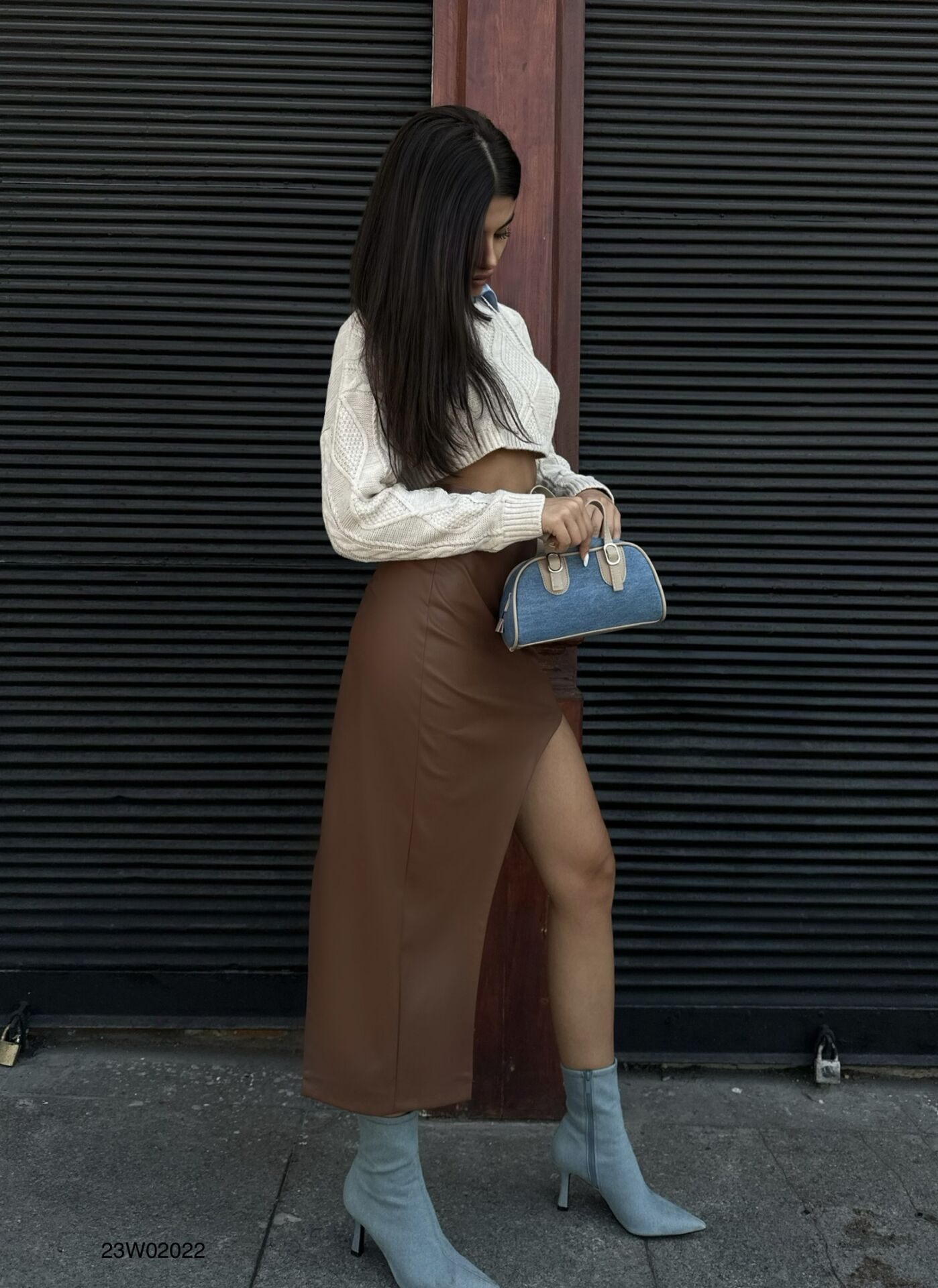 Toptan Yırtmaç Detay Kahverengi Deri Etek
