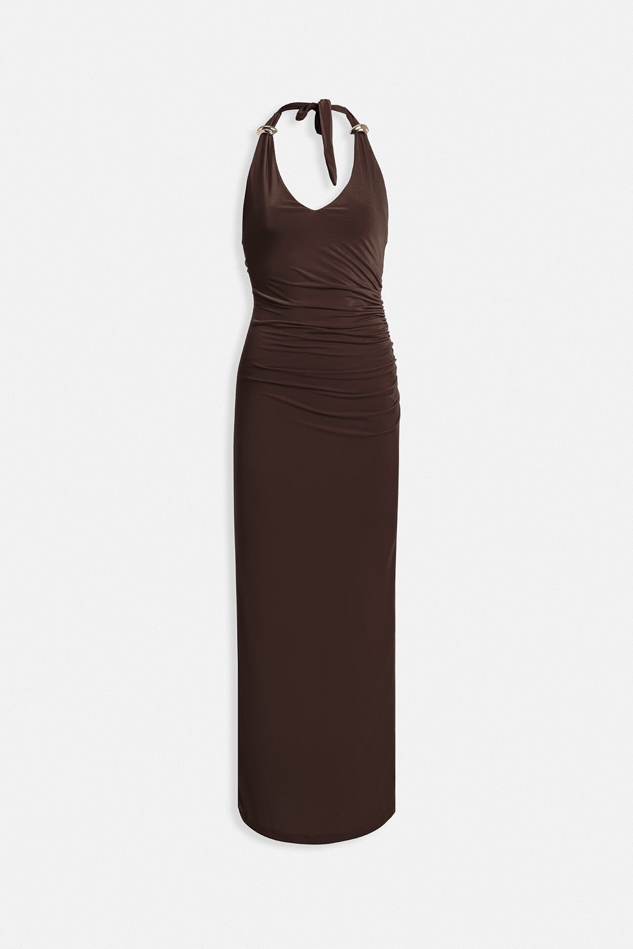 Toptan Aksesuar Detay Maxi Kahverengi Elbise