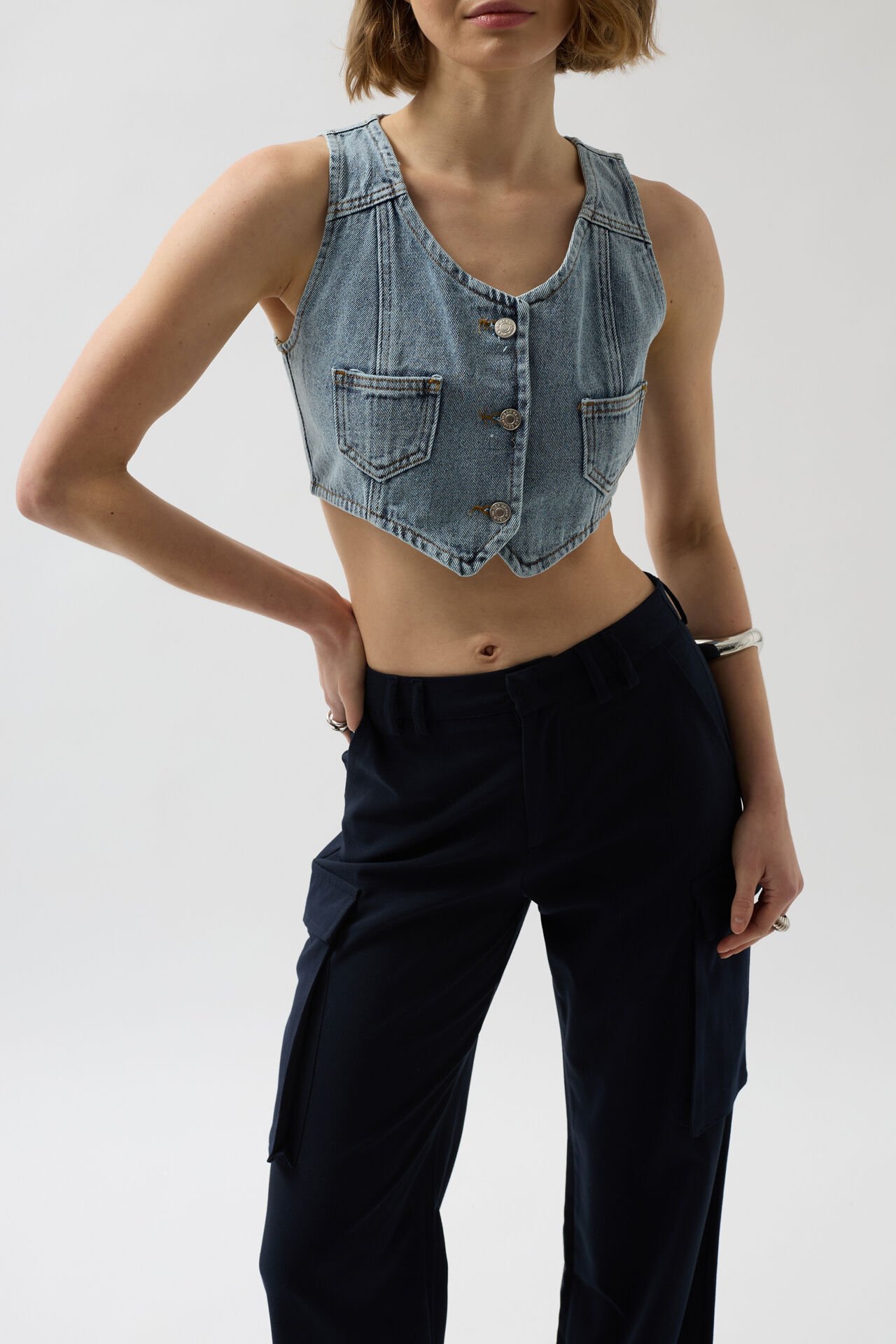 Pocket, Denim, Metal Button, Oval Cut, Vest