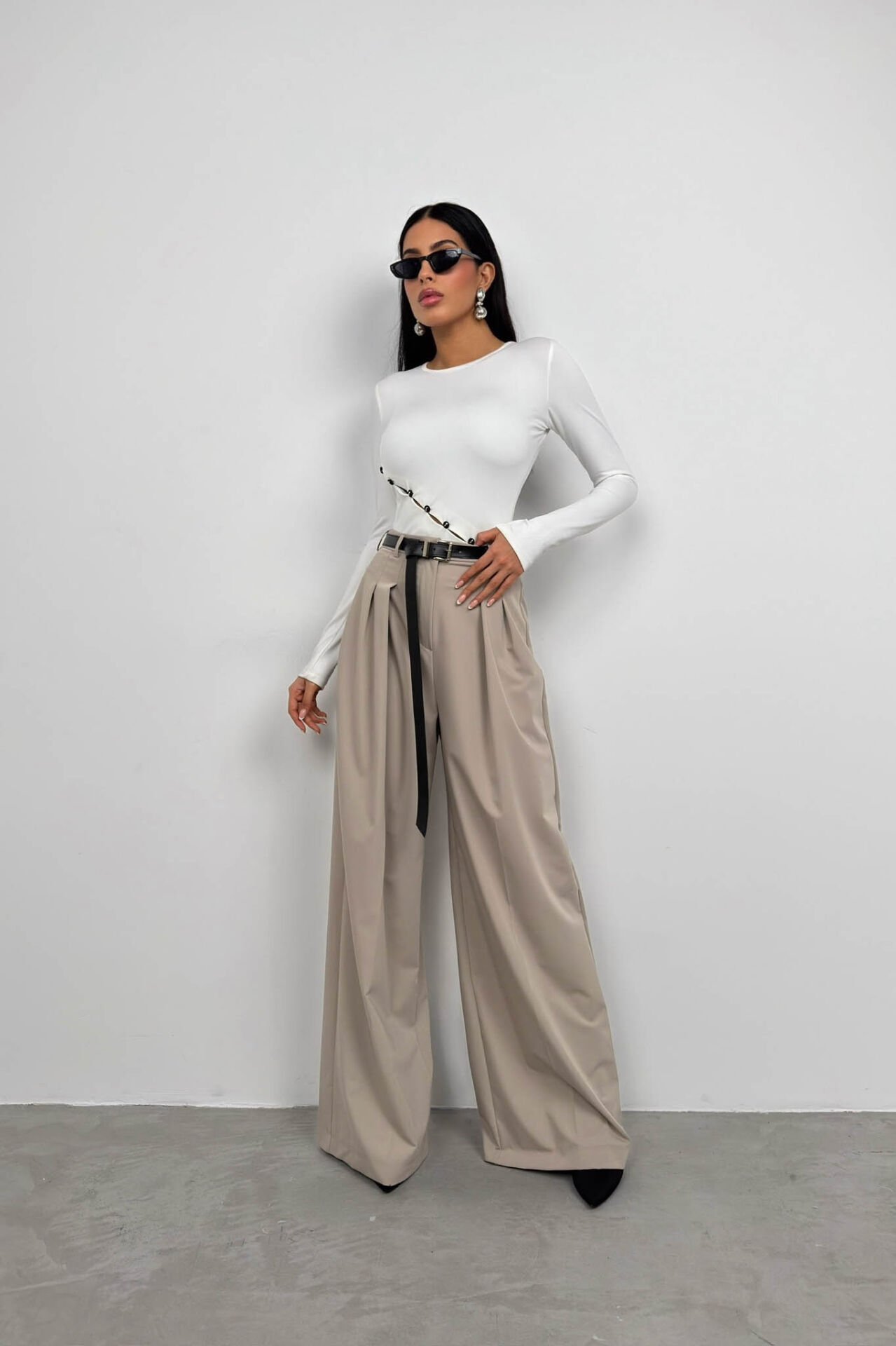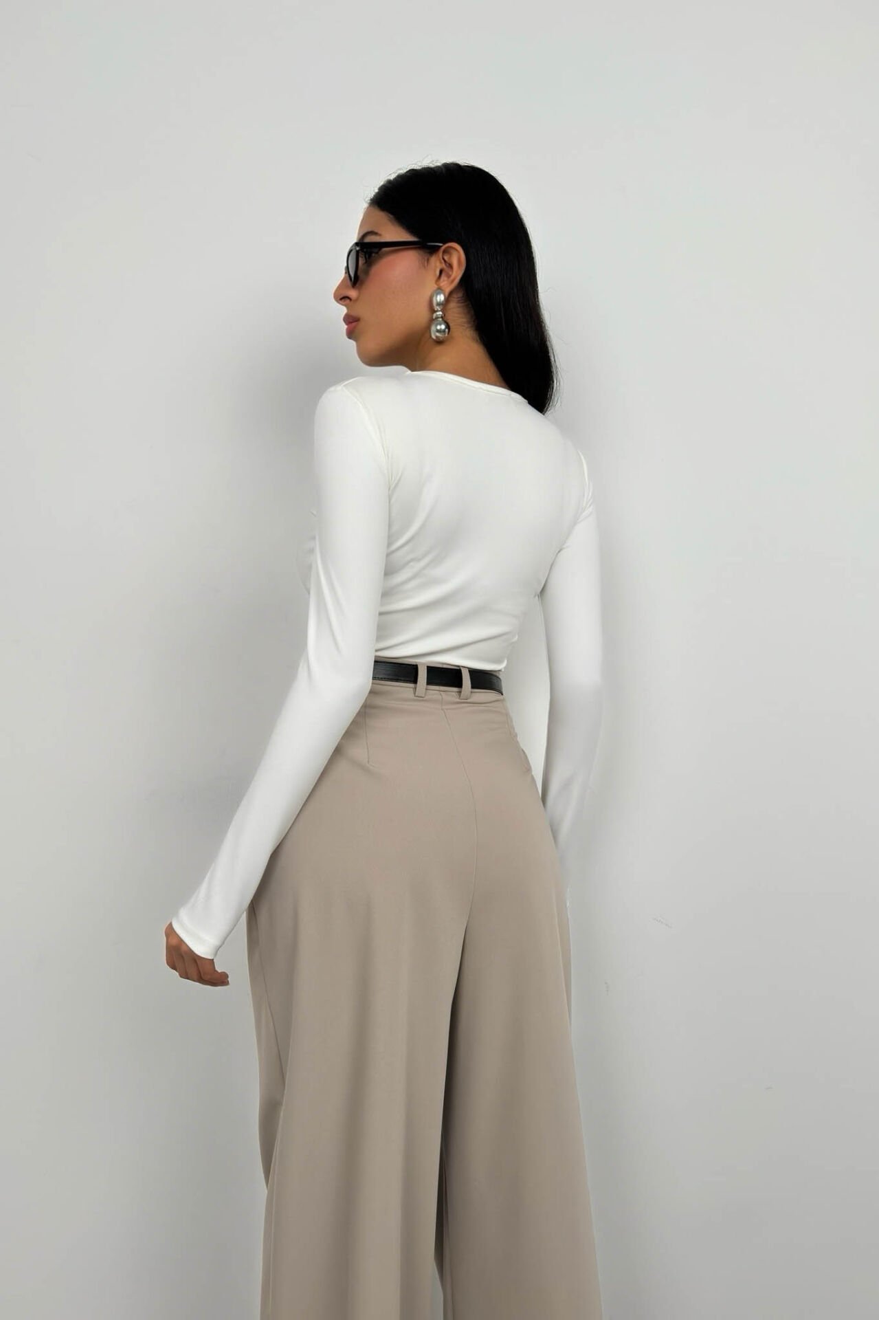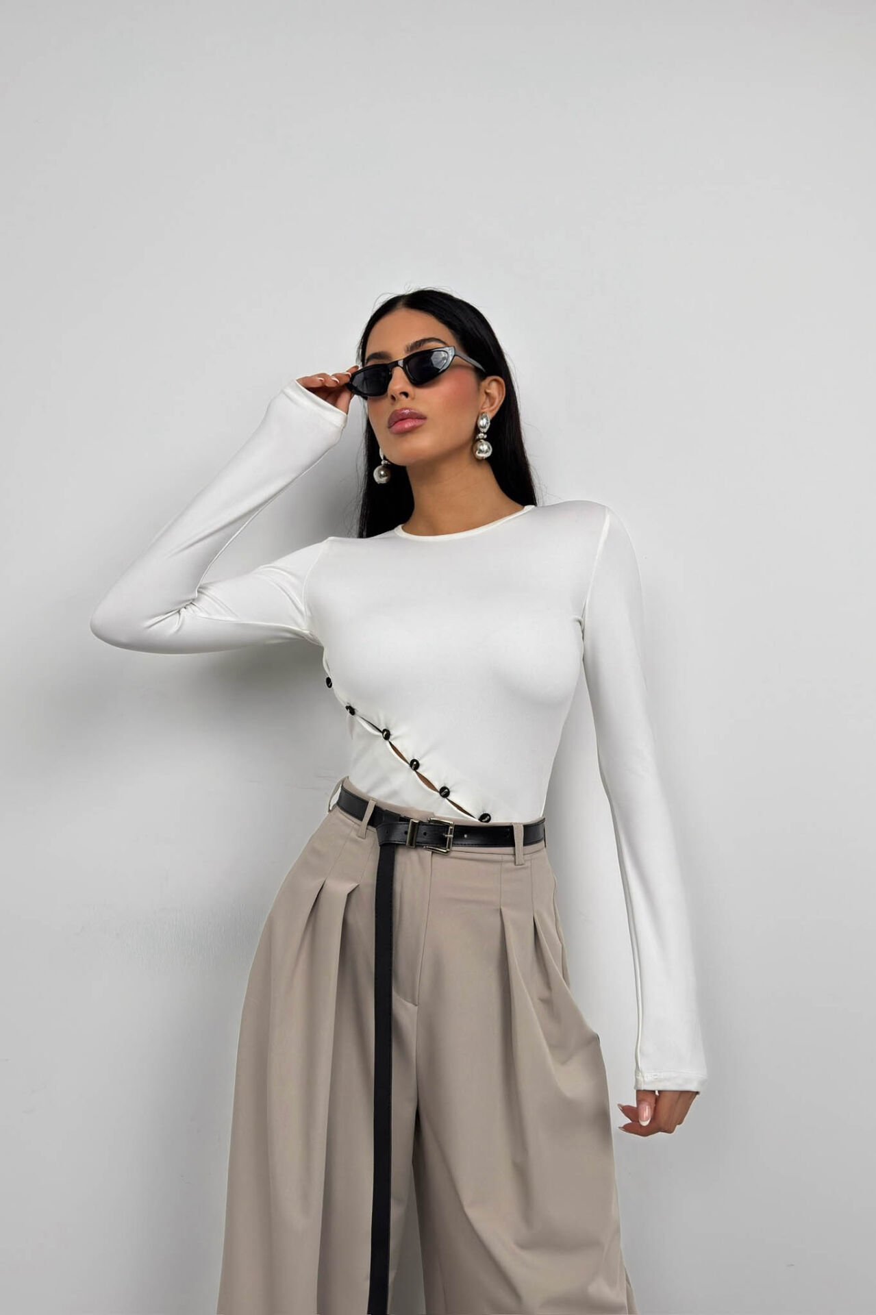 Toptan Asimetrik Düğme Detay Uzun Kollu Beyaz Bluz