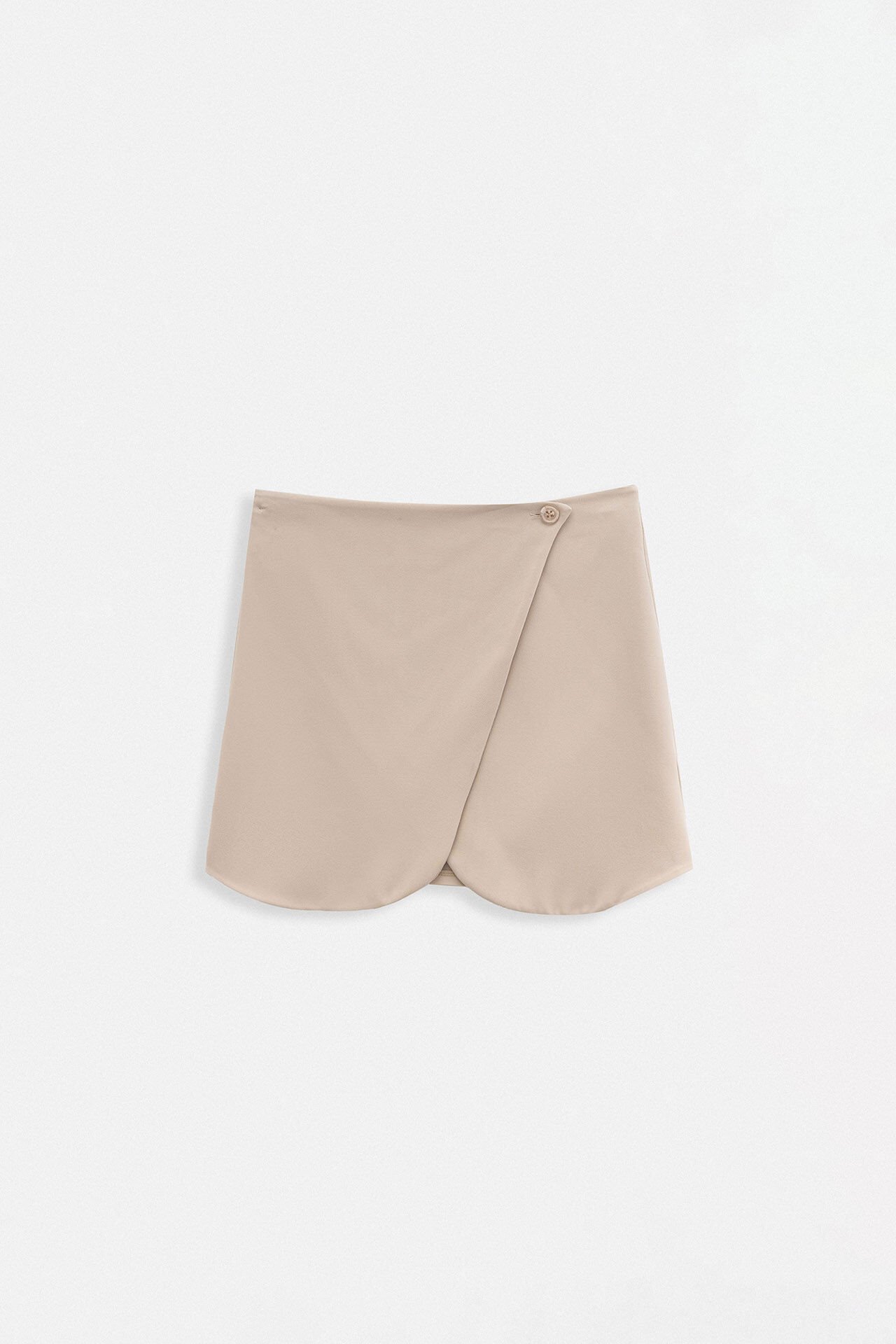Застежка на пуговицы сбоку, застежка на запах, мини-юбка овального покроя