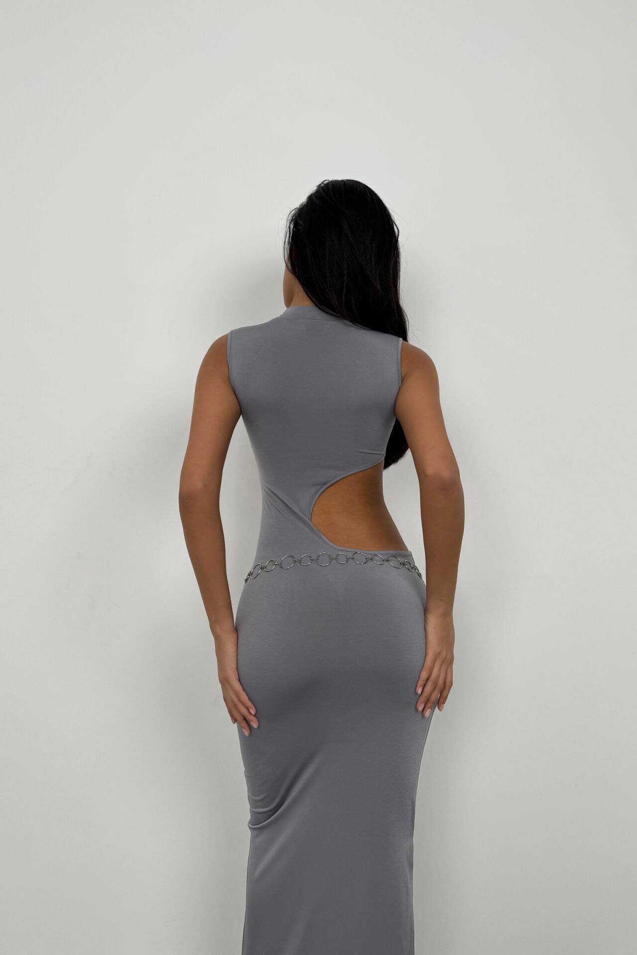 Toptan Asimetrik Bel Kemerli Gri Uzun Elbise