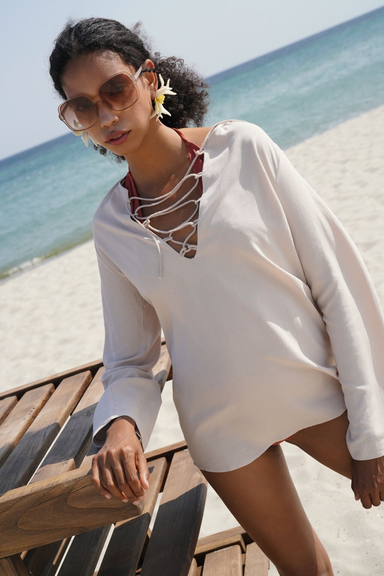 V Yaka, Uzun Kollu, Bağcıklı, Keten Bluz, Uzun Kollu, İspanyol Kol, Normal Boy