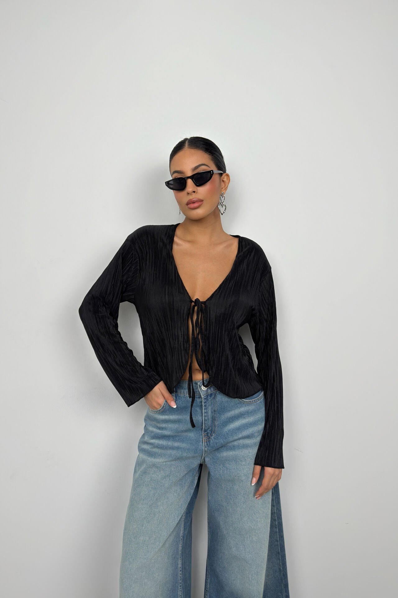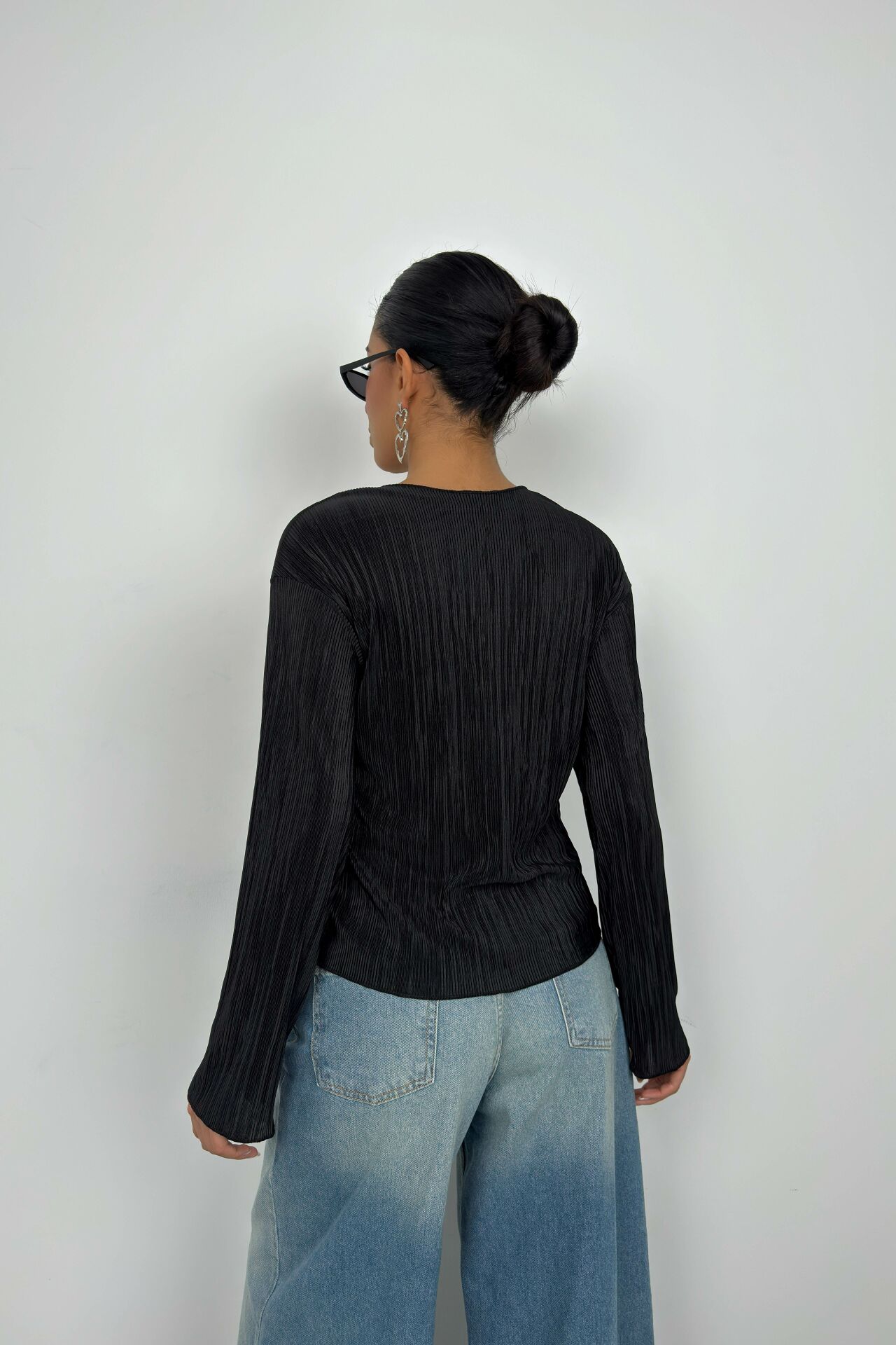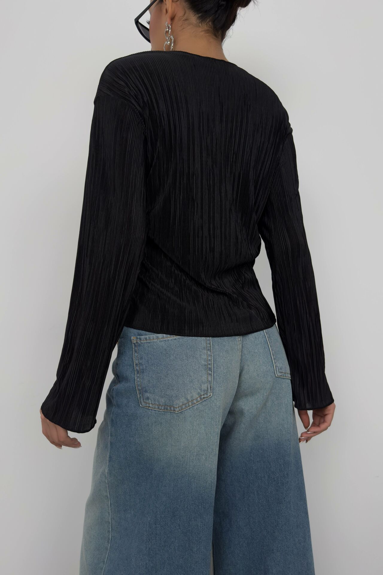 Toptan Bağlama Detay Dokulu Siyah Bluz