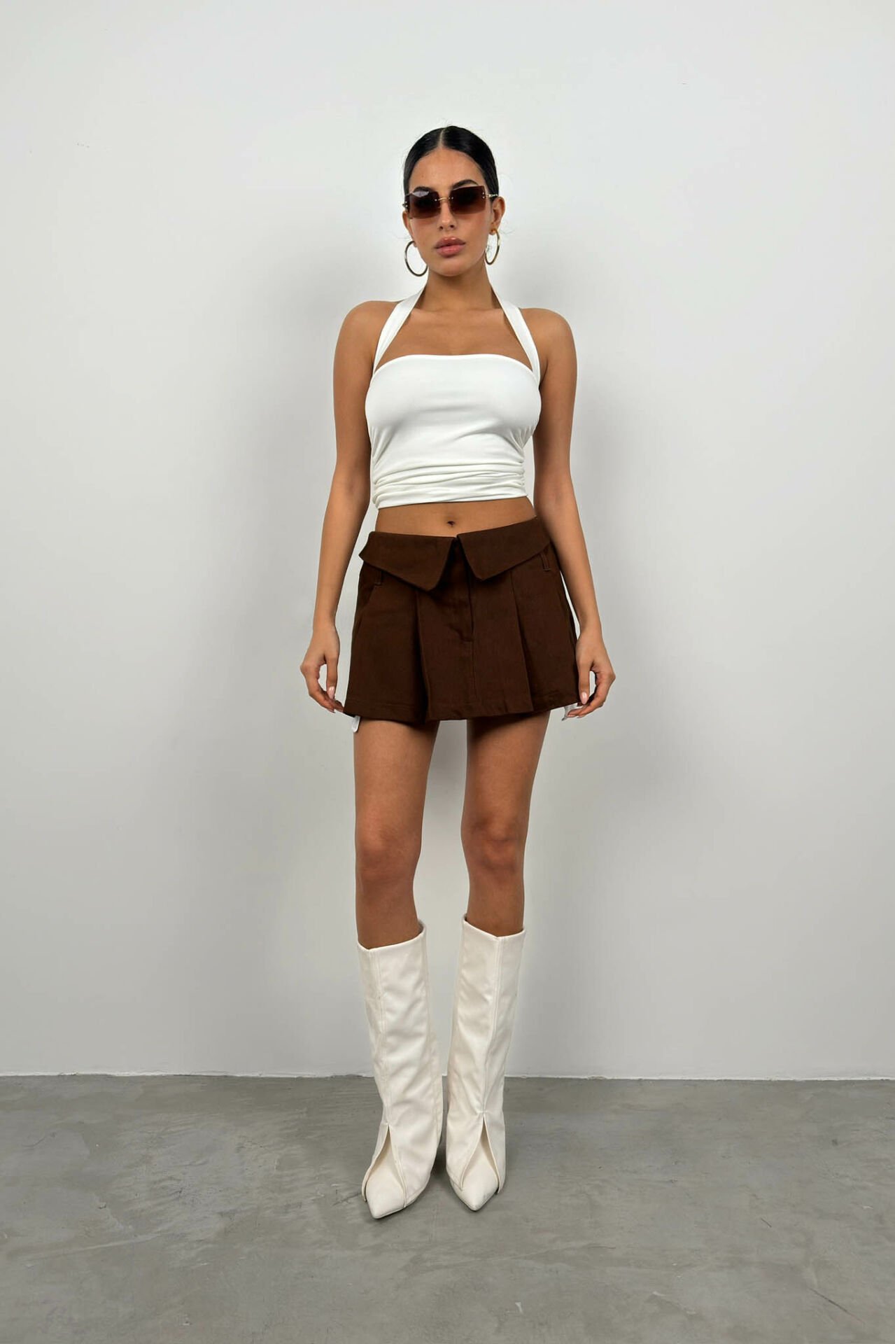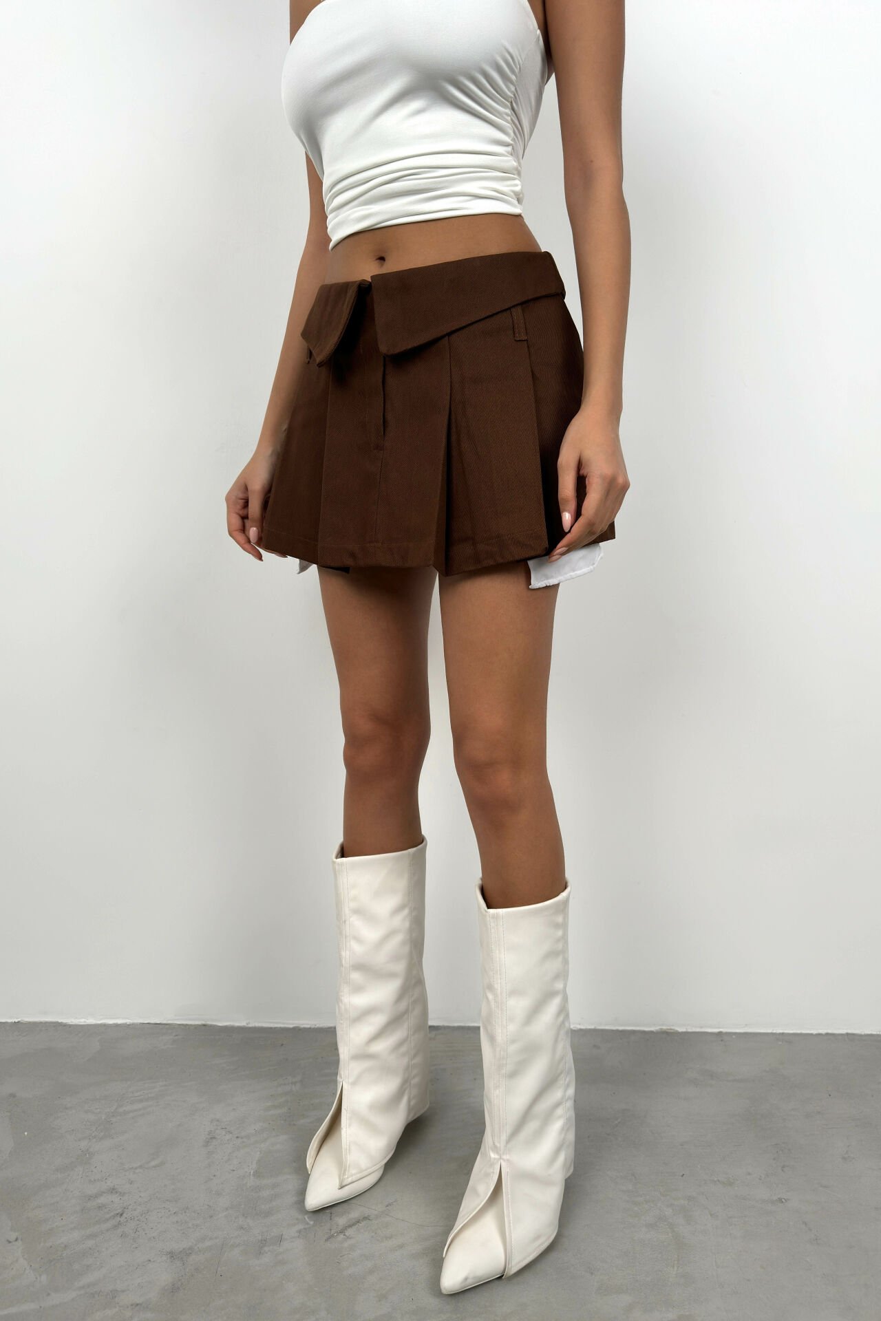 Toptan Bel Katlamalı Pileli Kahverengi Mini Etek