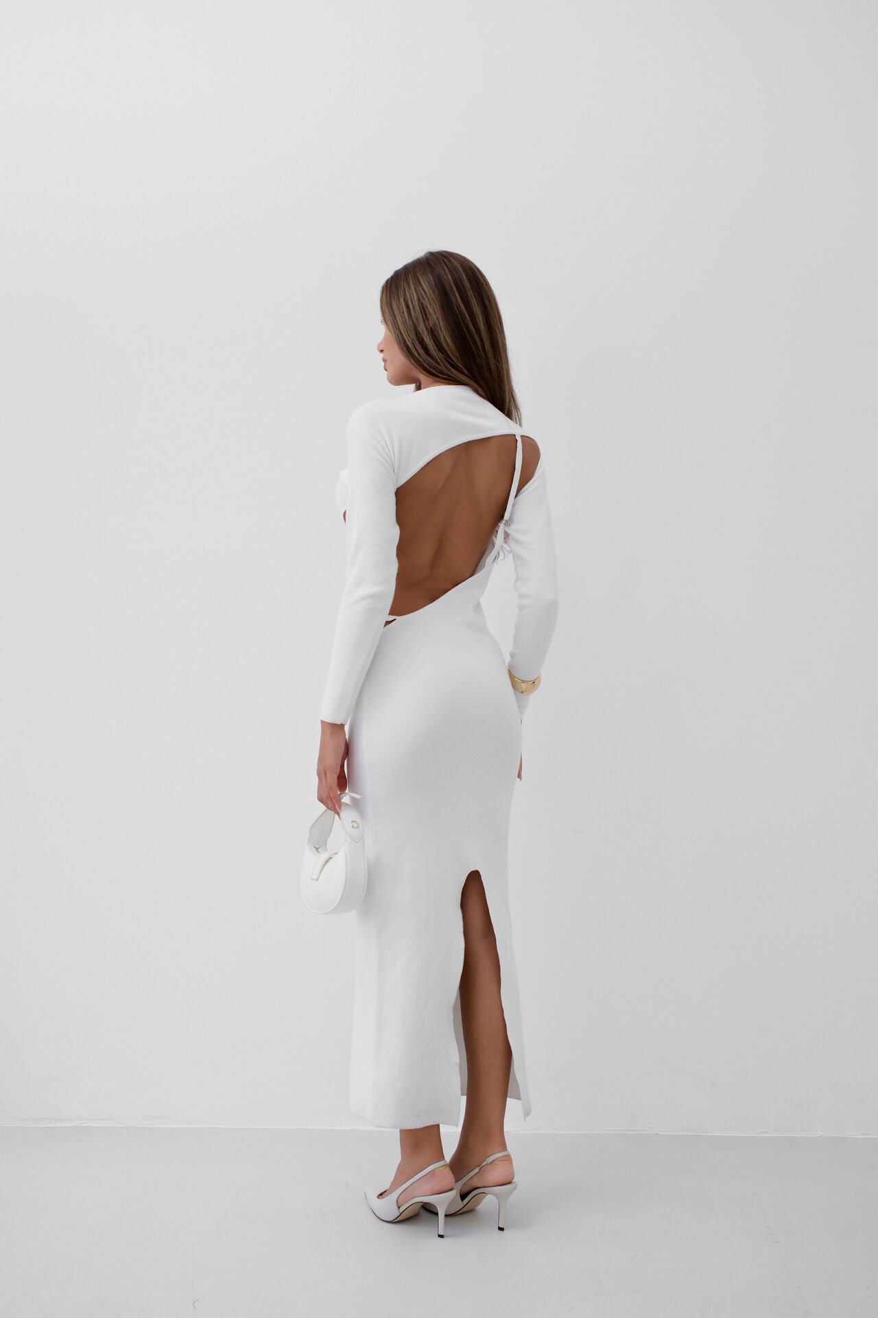 Bisiklet Yaka, Derin Sırt Dekolteli, Uzun Kollu, Vücuda Yapışan, Midi Boy, Elbise