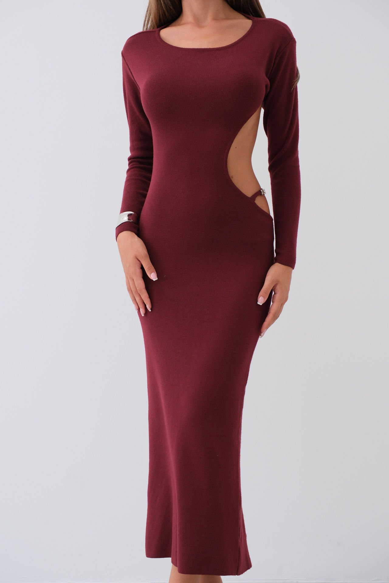 Toptan Bisiklet Yaka Sırt Dekolteli Bordo Elbise