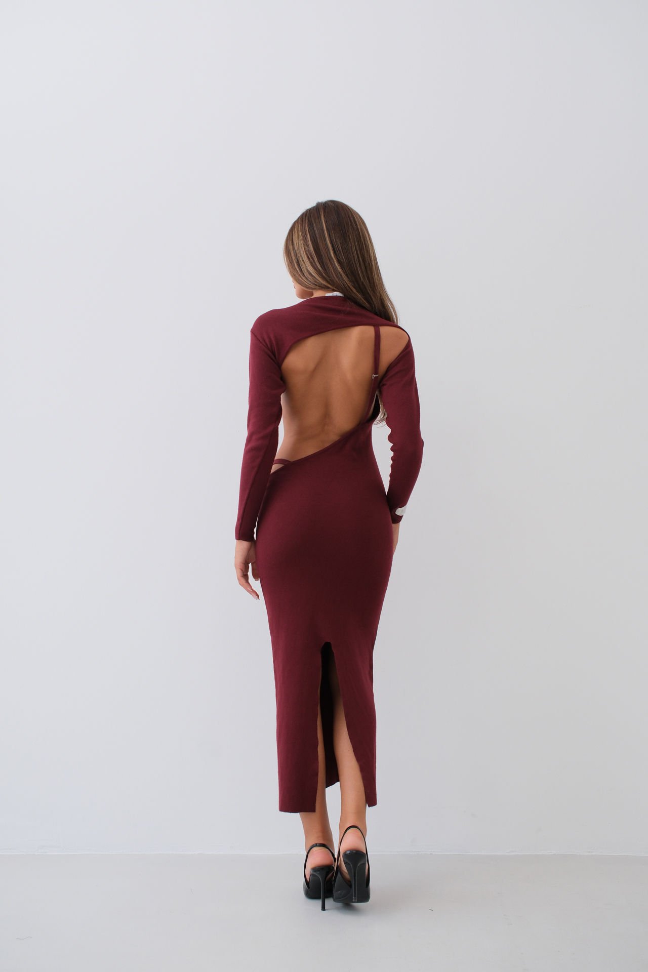 Bisiklet Yaka, Derin Sırt Dekolteli, Uzun Kollu, Vücuda Yapışan, Midi Boy, Elbise