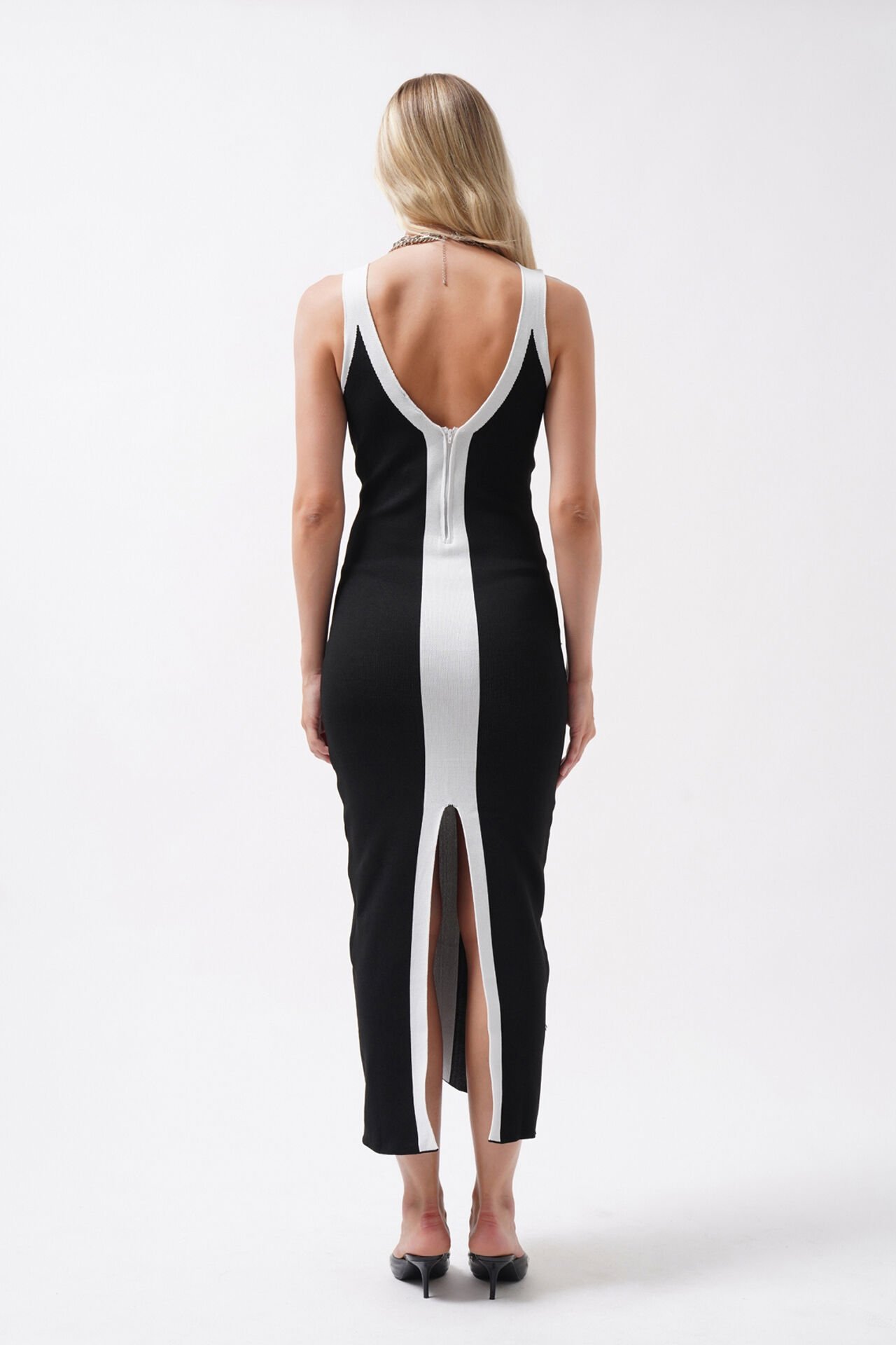 Toptan Çift Renk Yırtmaç Detay Siyah Beyaz Elbise