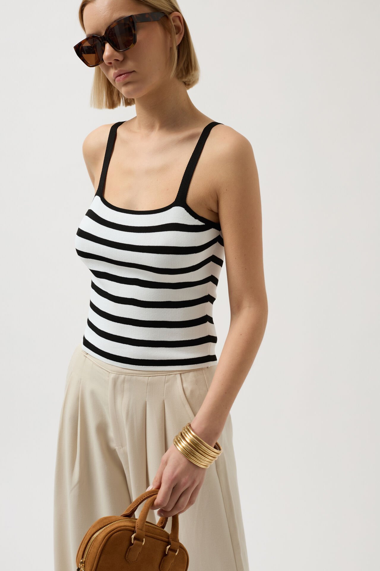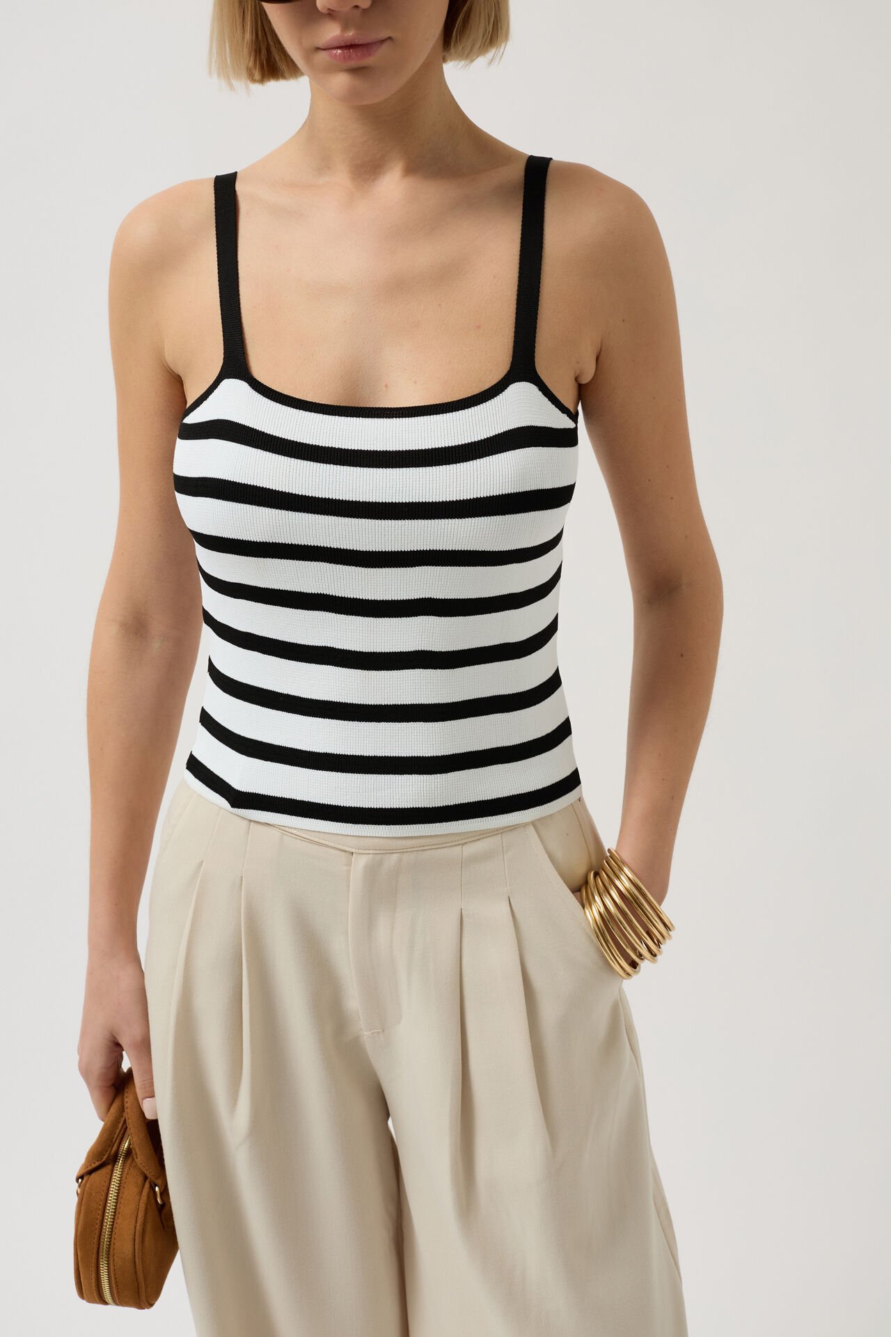 Kontrast Şeritli, Askılı Örgü Triko Bluz
