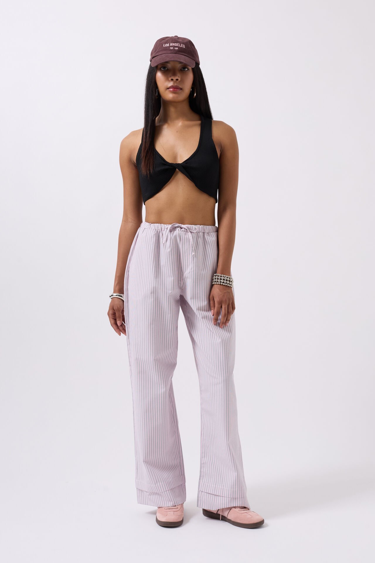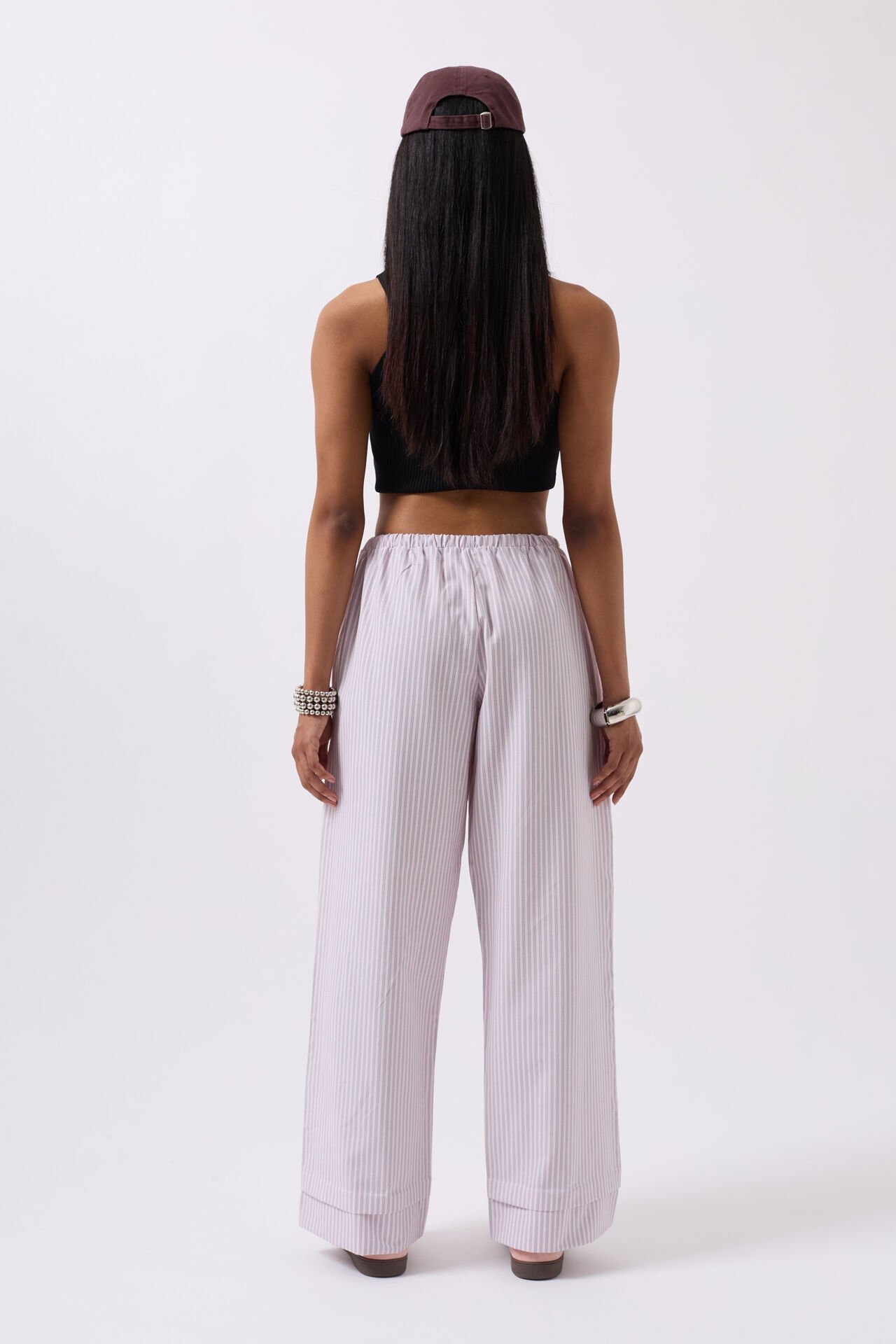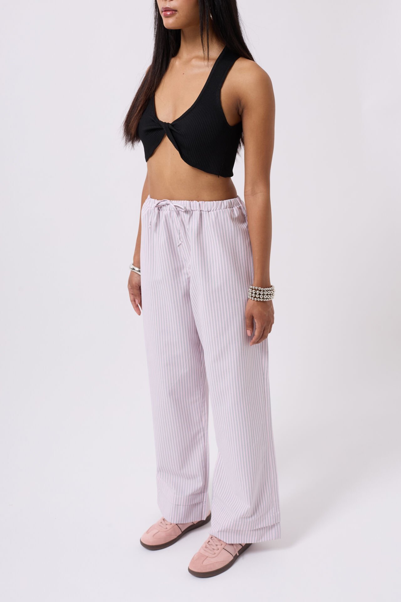 Toptan Çizgili Bel Lastikli Pembe Pantolon