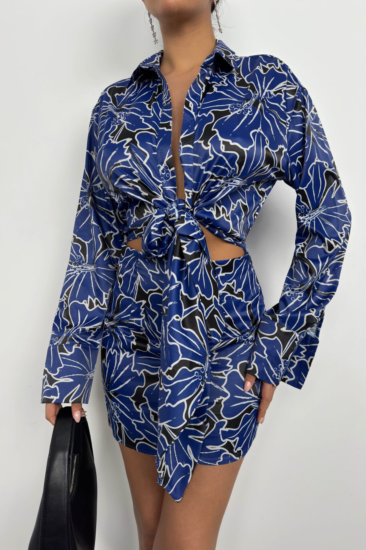 Toptan Desenli Bağlamalı Mavi Mini Elbise