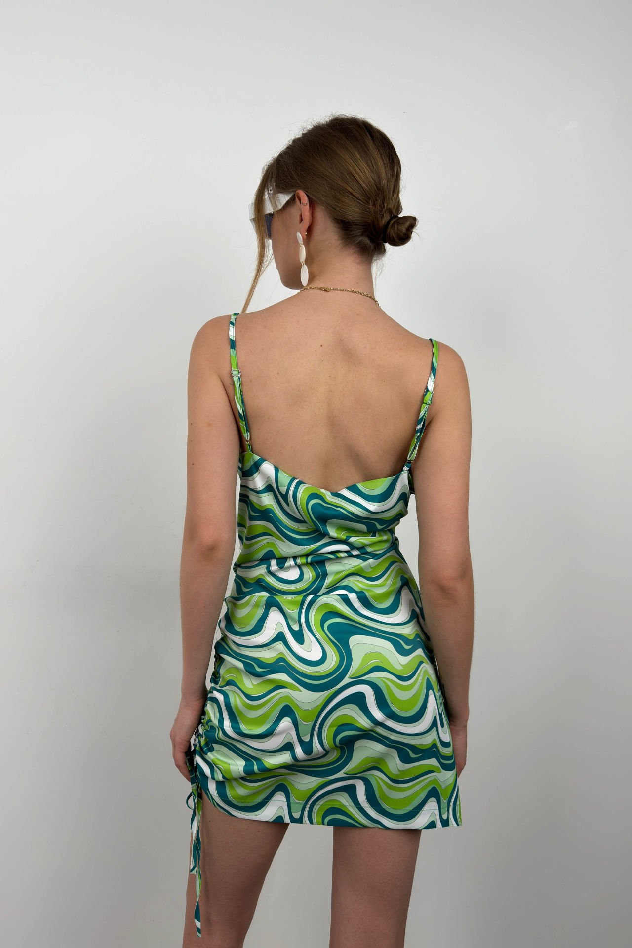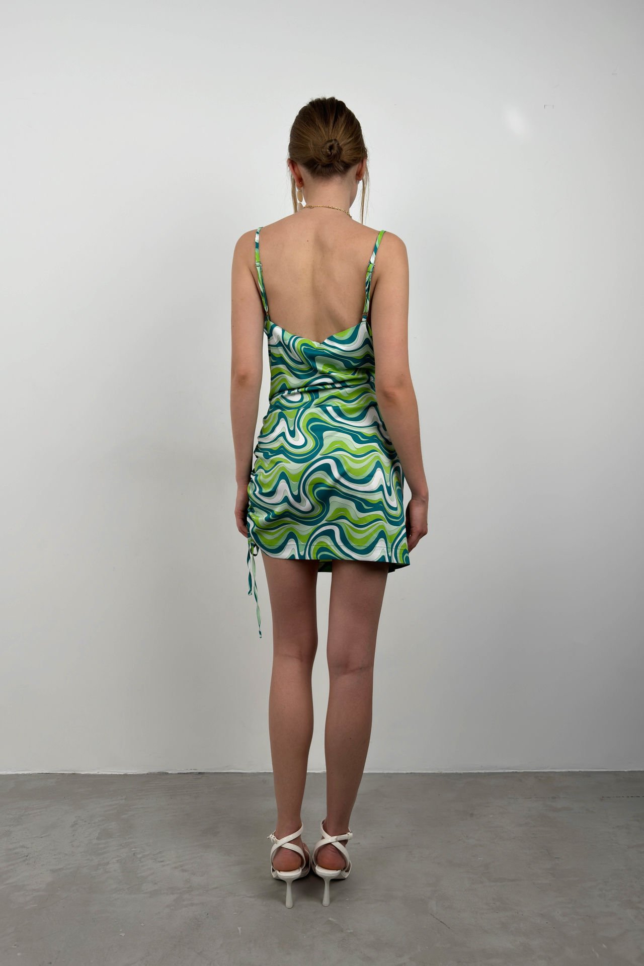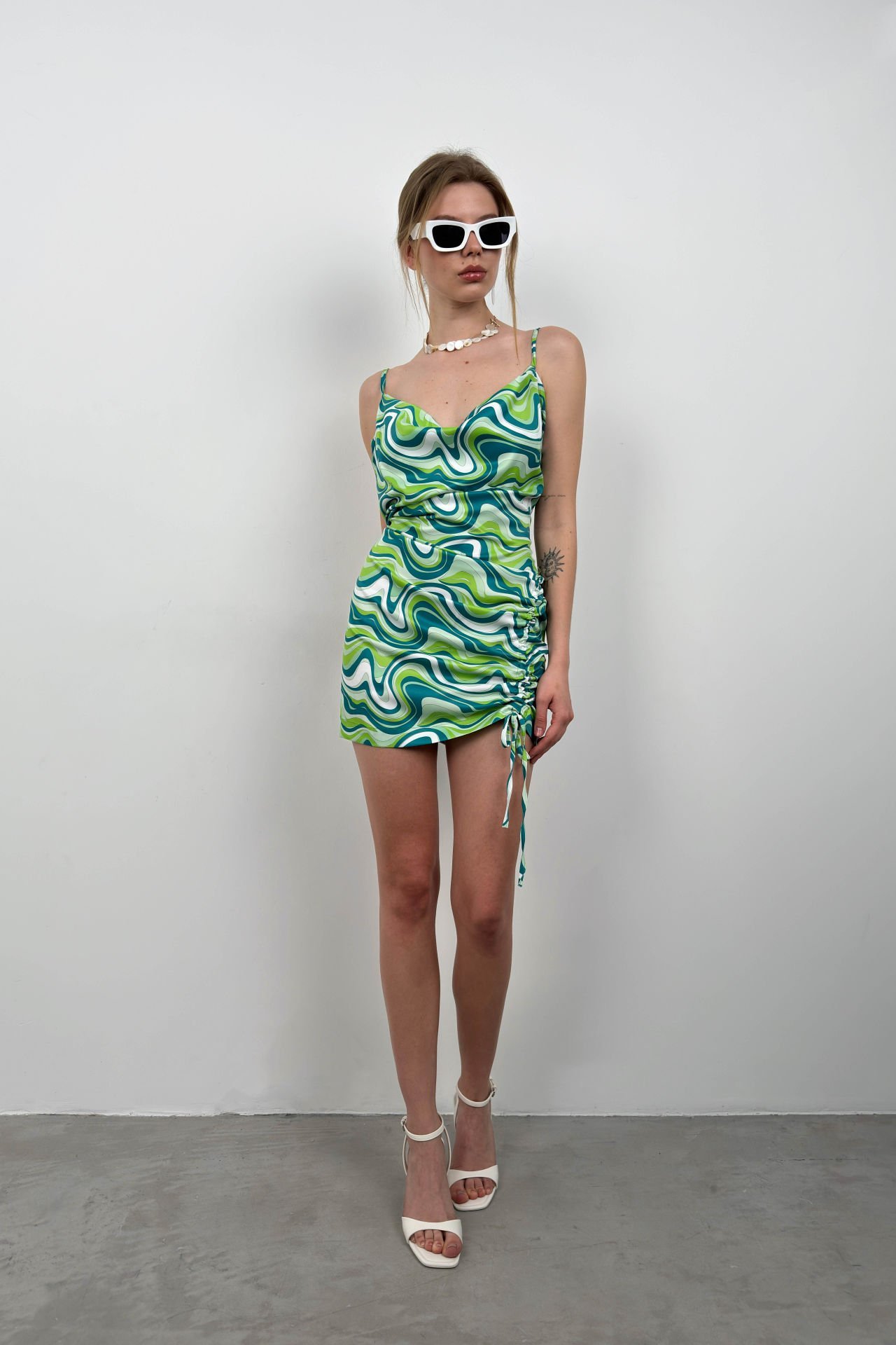Toptan Desenli Büzgülü Yeşil Mini Elbise