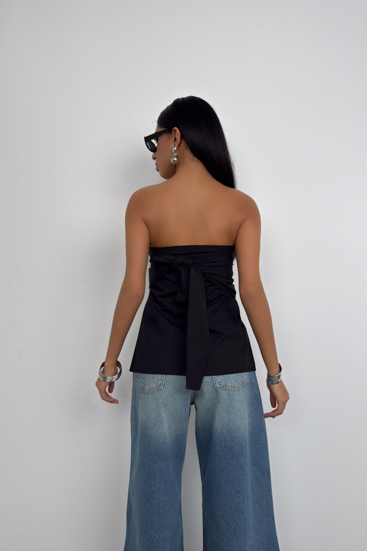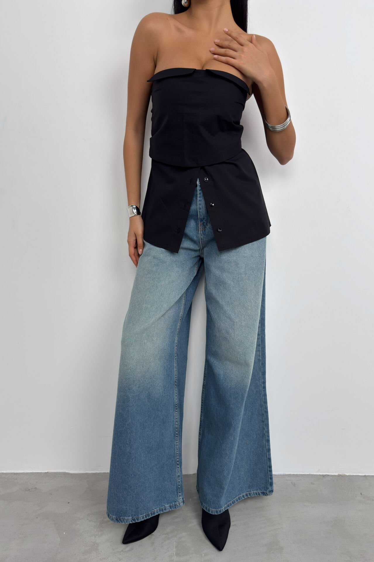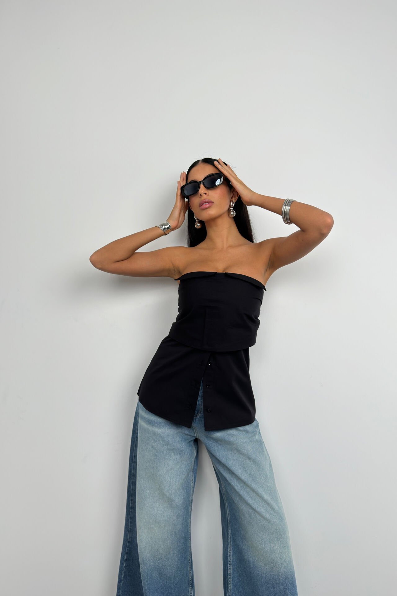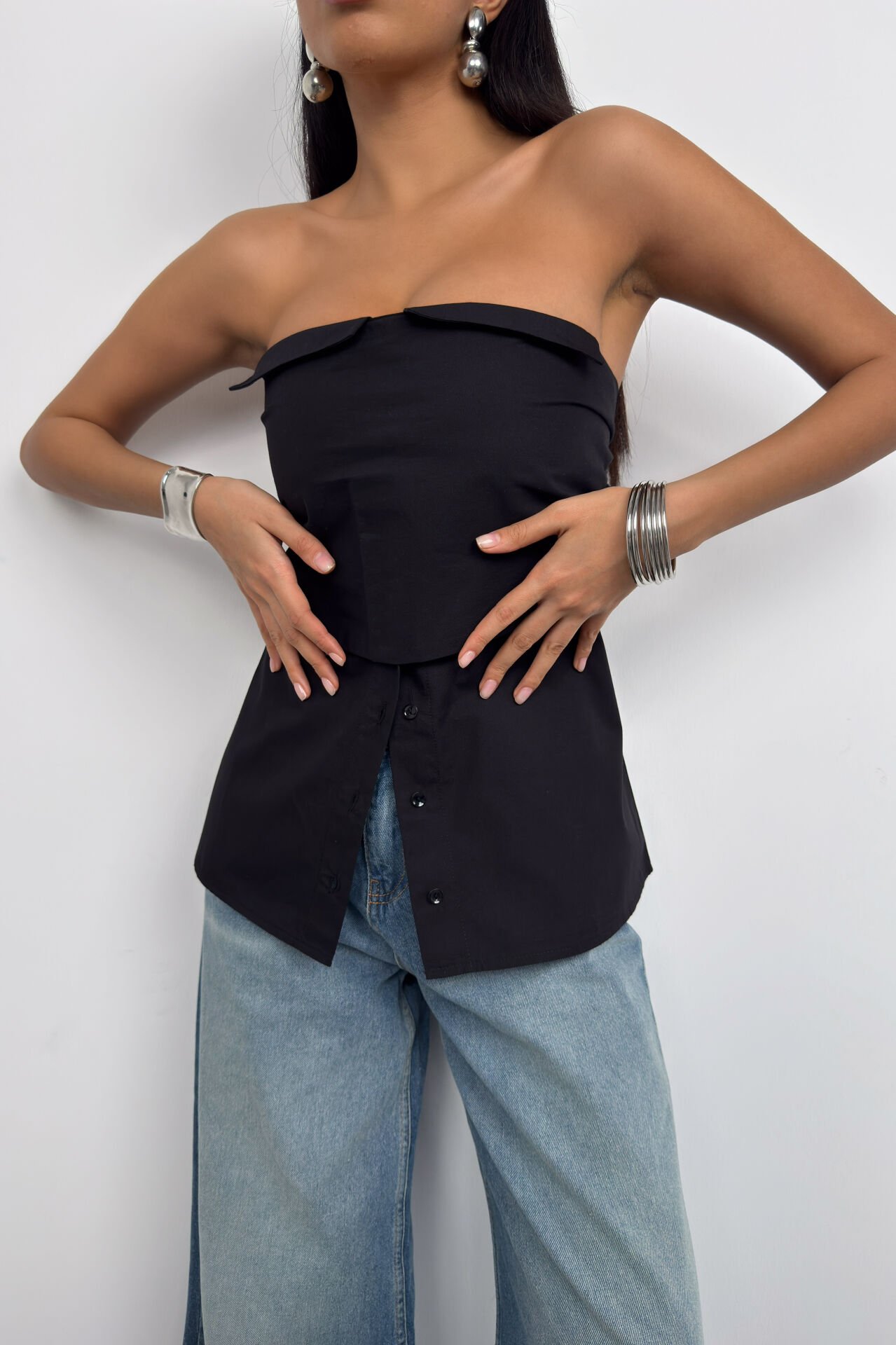 Düğme Detay, Yırtmaçlı, Katlamalı Yaka, Straplez, Gömlek, Kolsuz Bluz