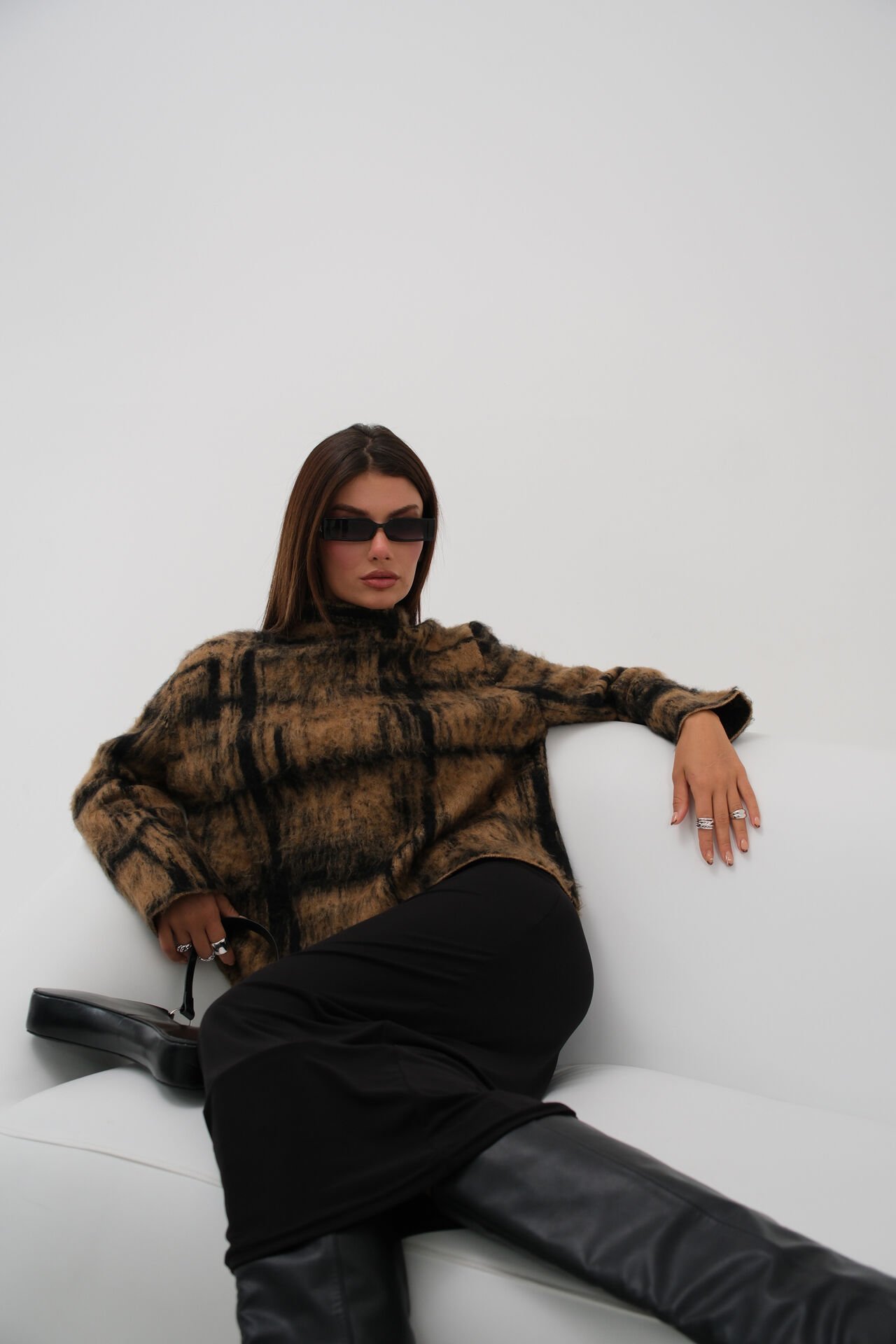 Sakallı İplik, Ekose Desen, Trend, Kazak, Oversize, Casual