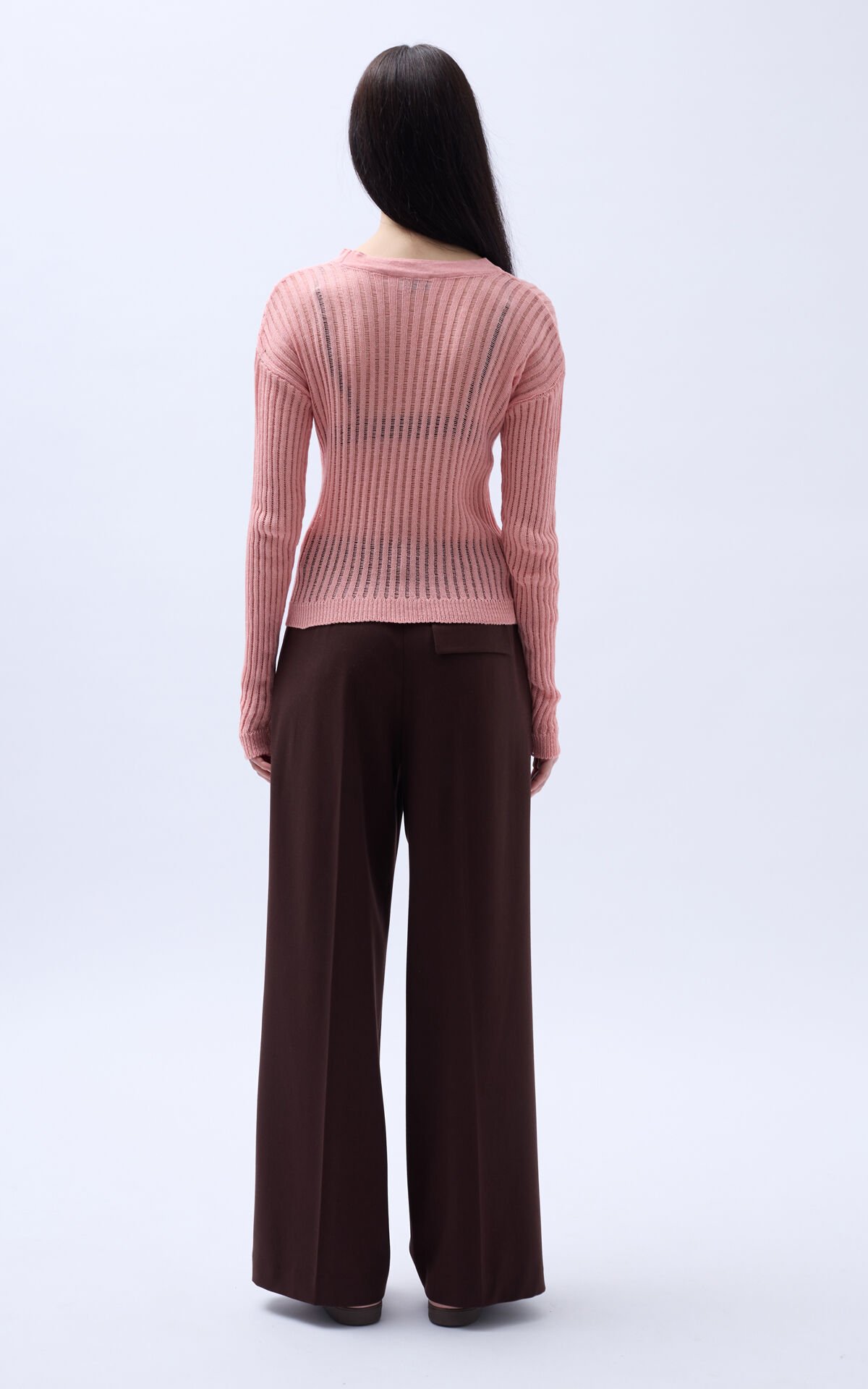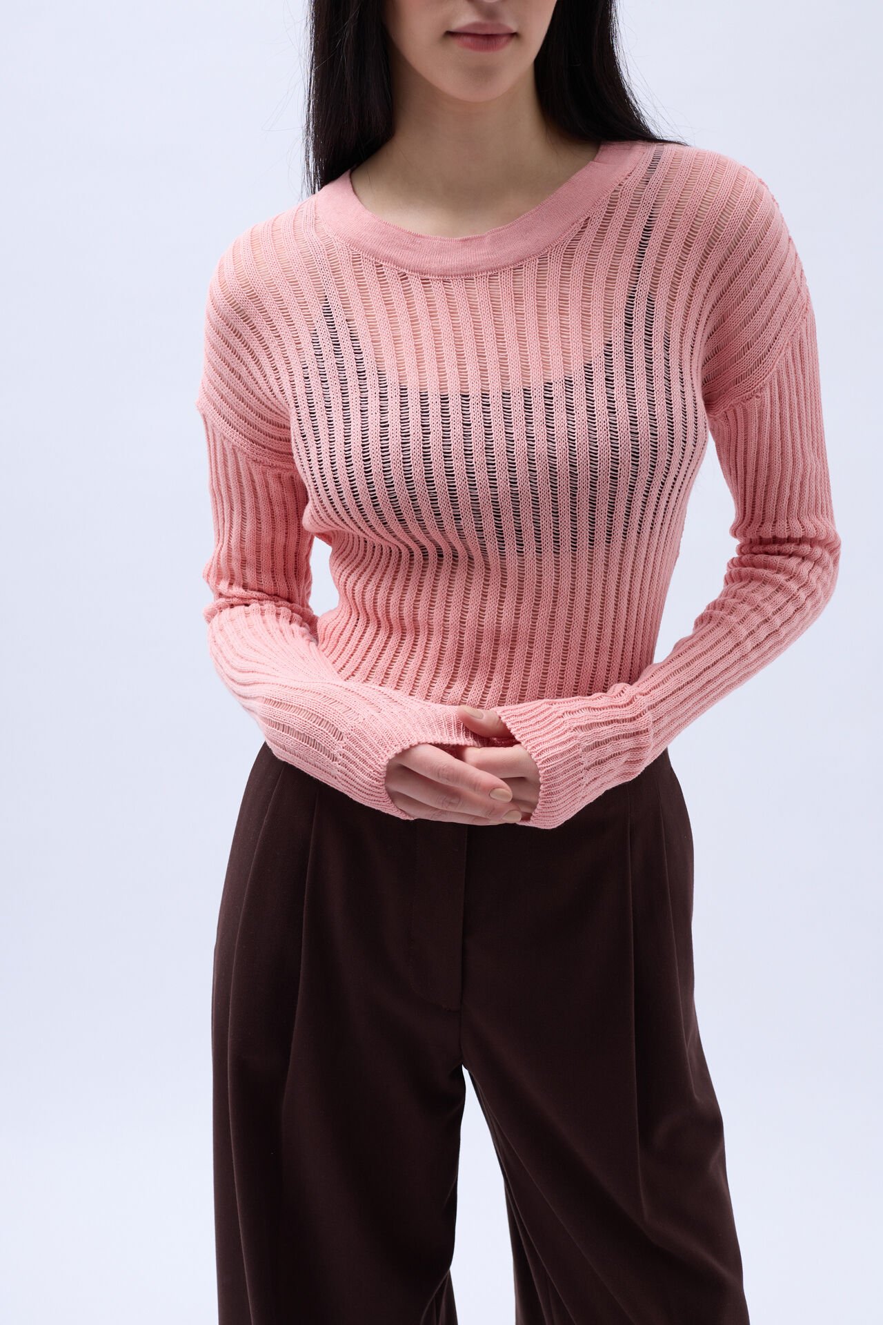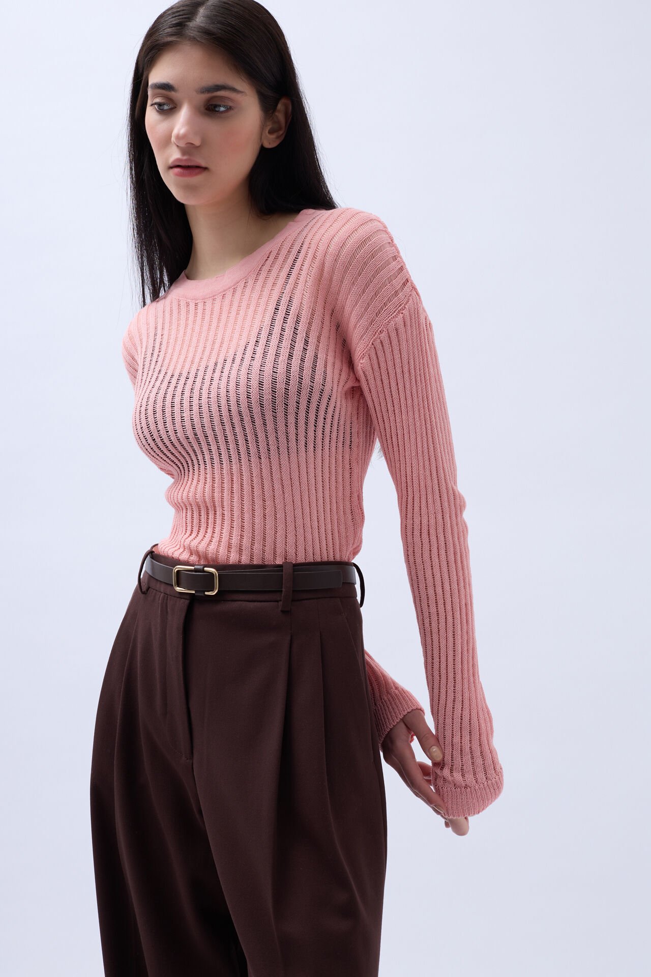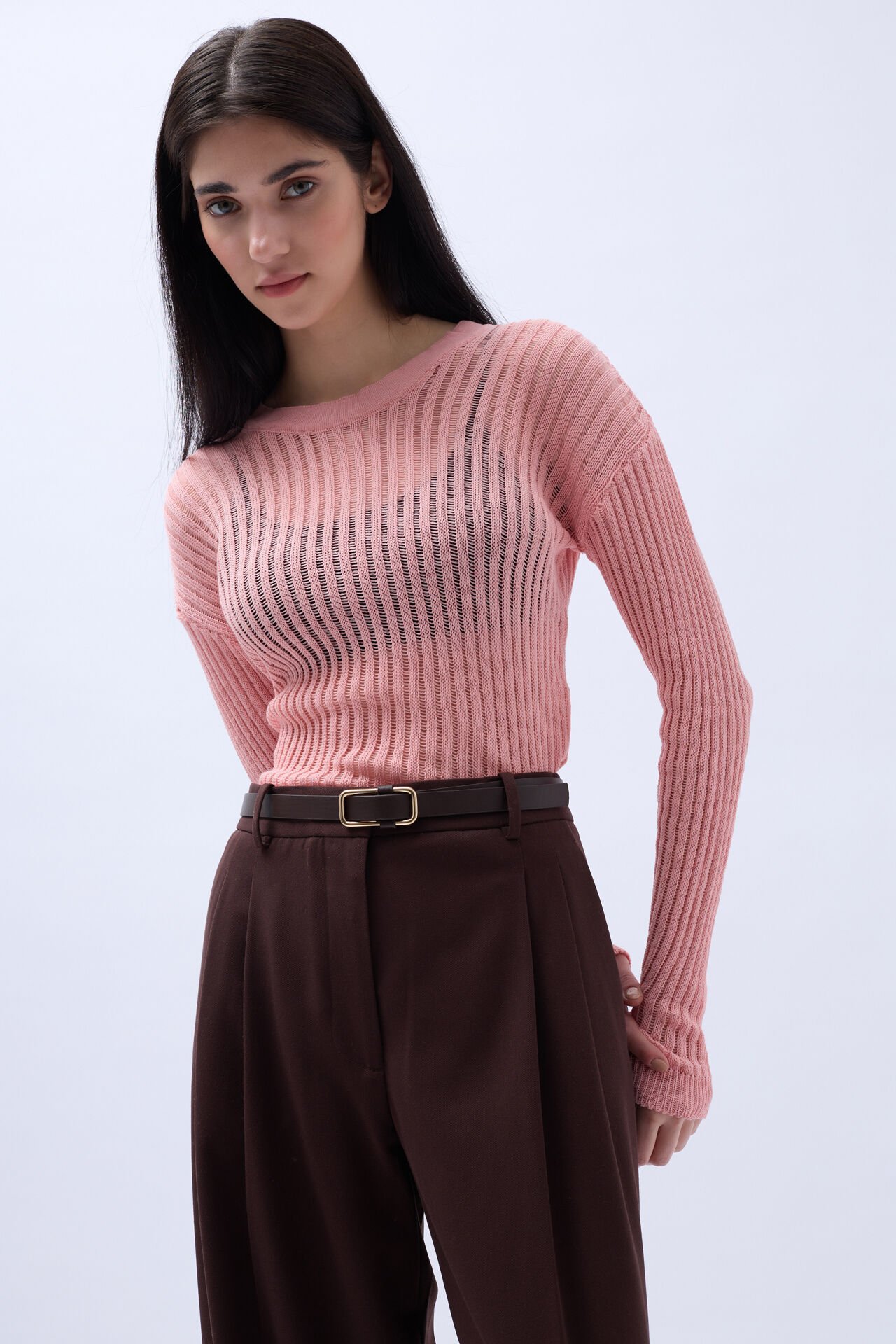 Fitilli Triko Örgü, Dokulu Bluz, Uzun Kol Bluz, Sıfır Yaka, Transparan Bluz