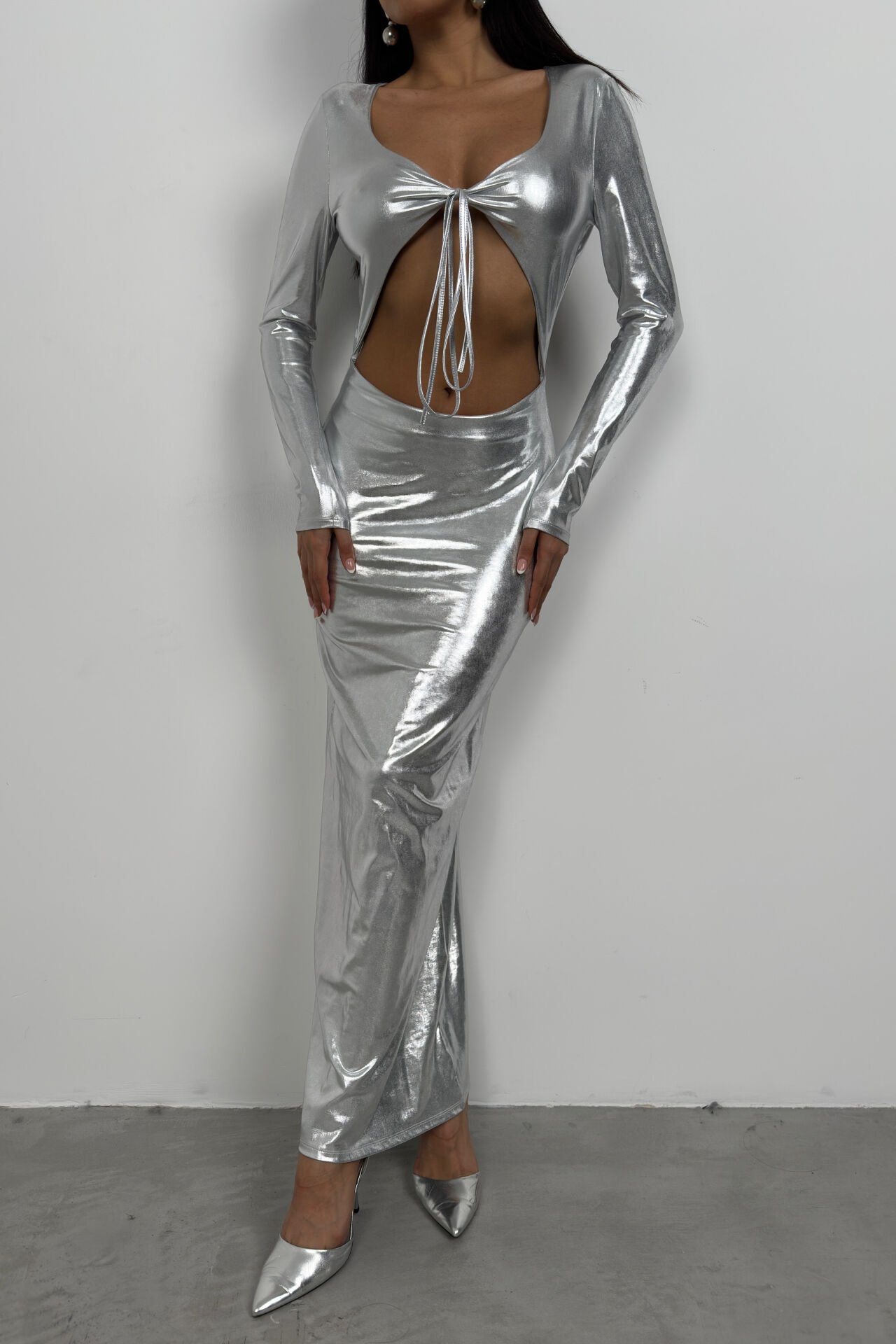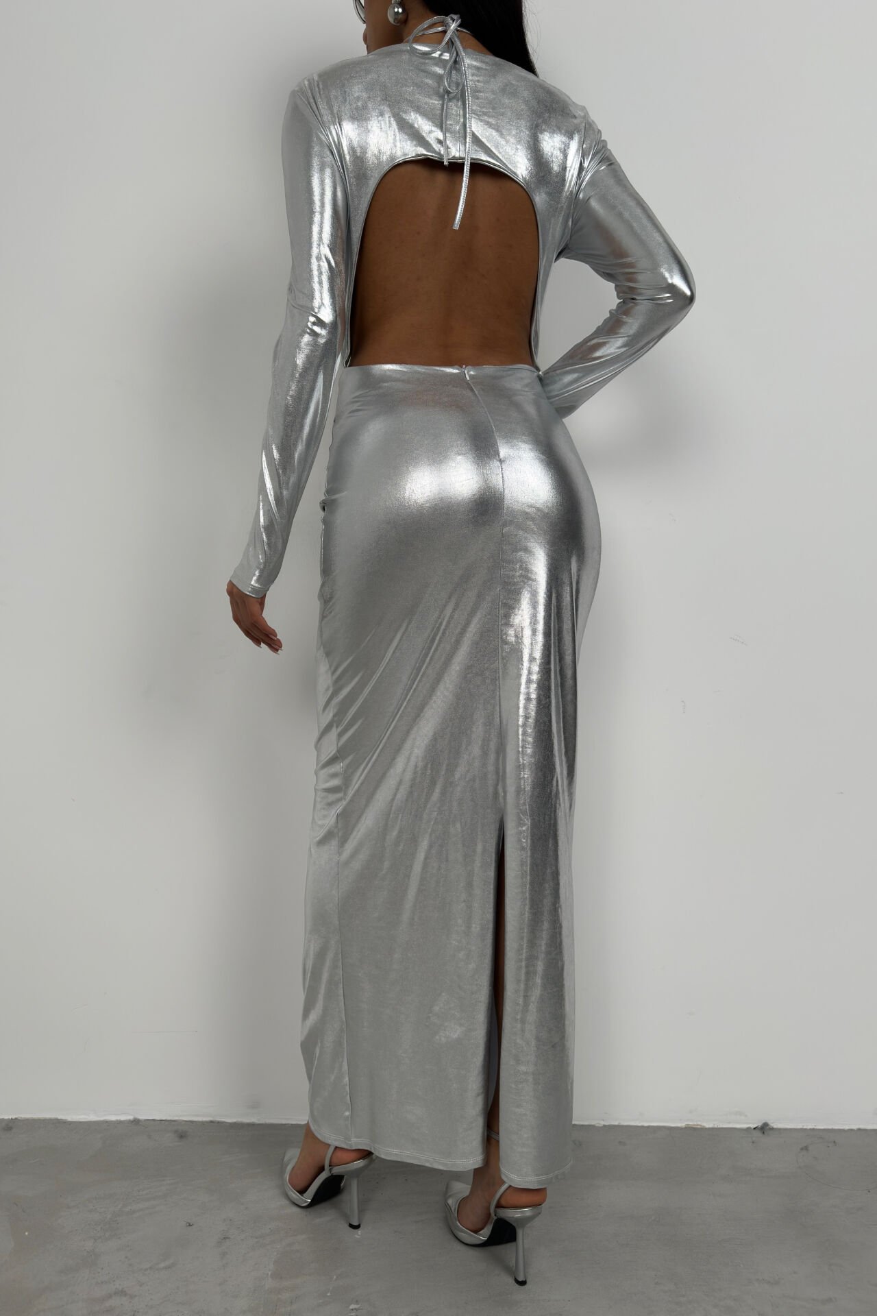 Toptan Göğüs Bağlamalı Sırt Dekolteli Gümüş Elbise