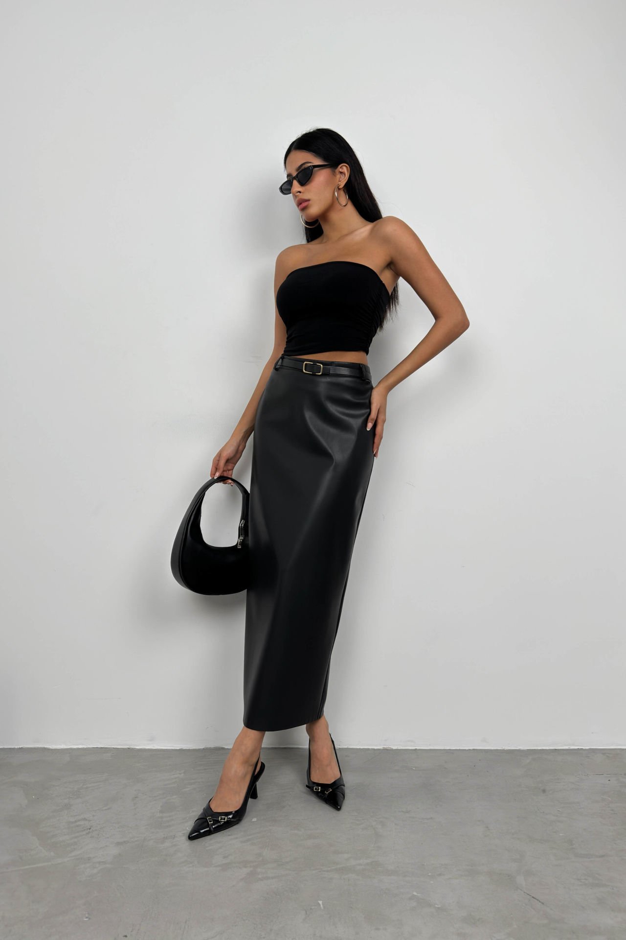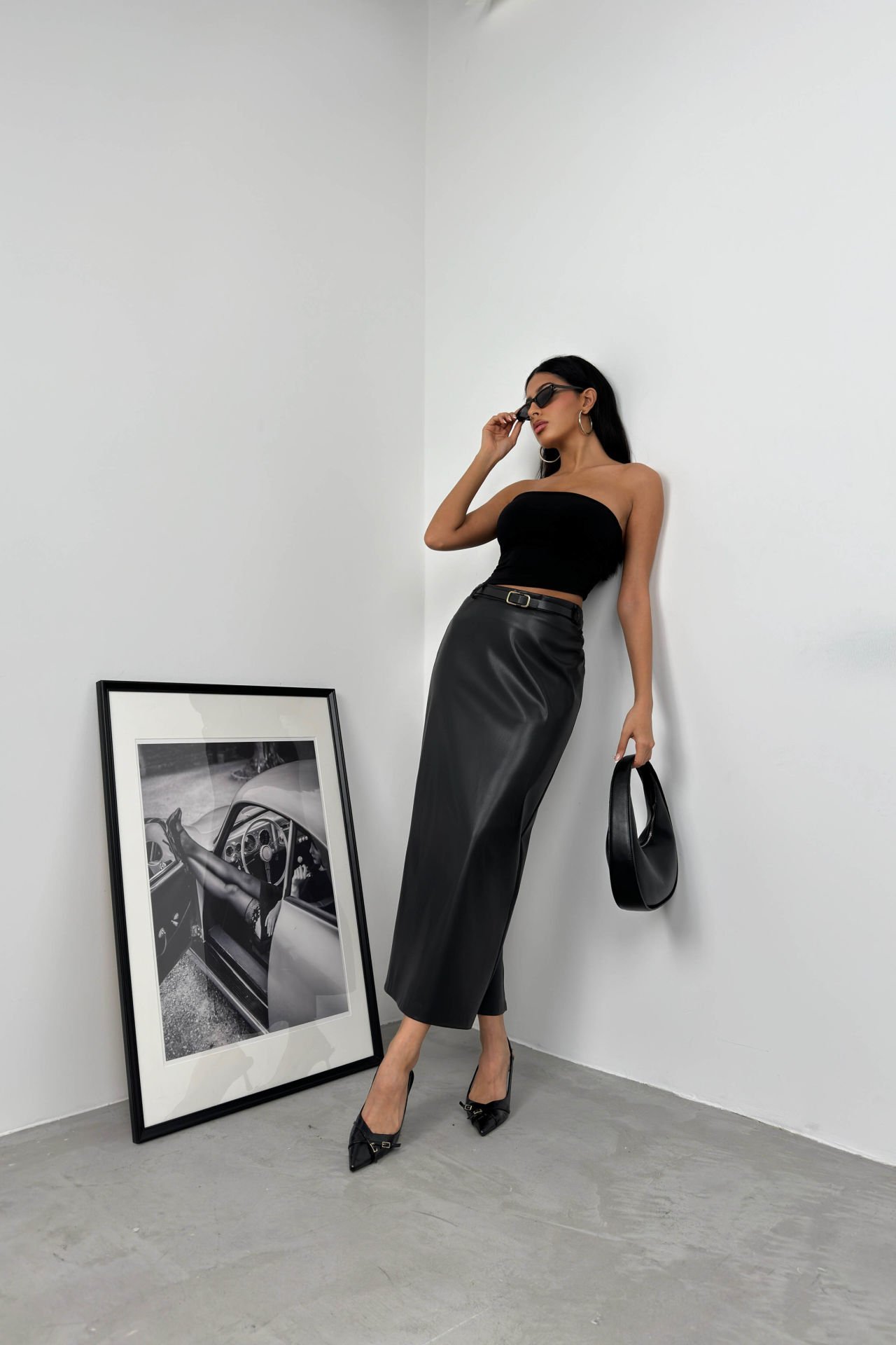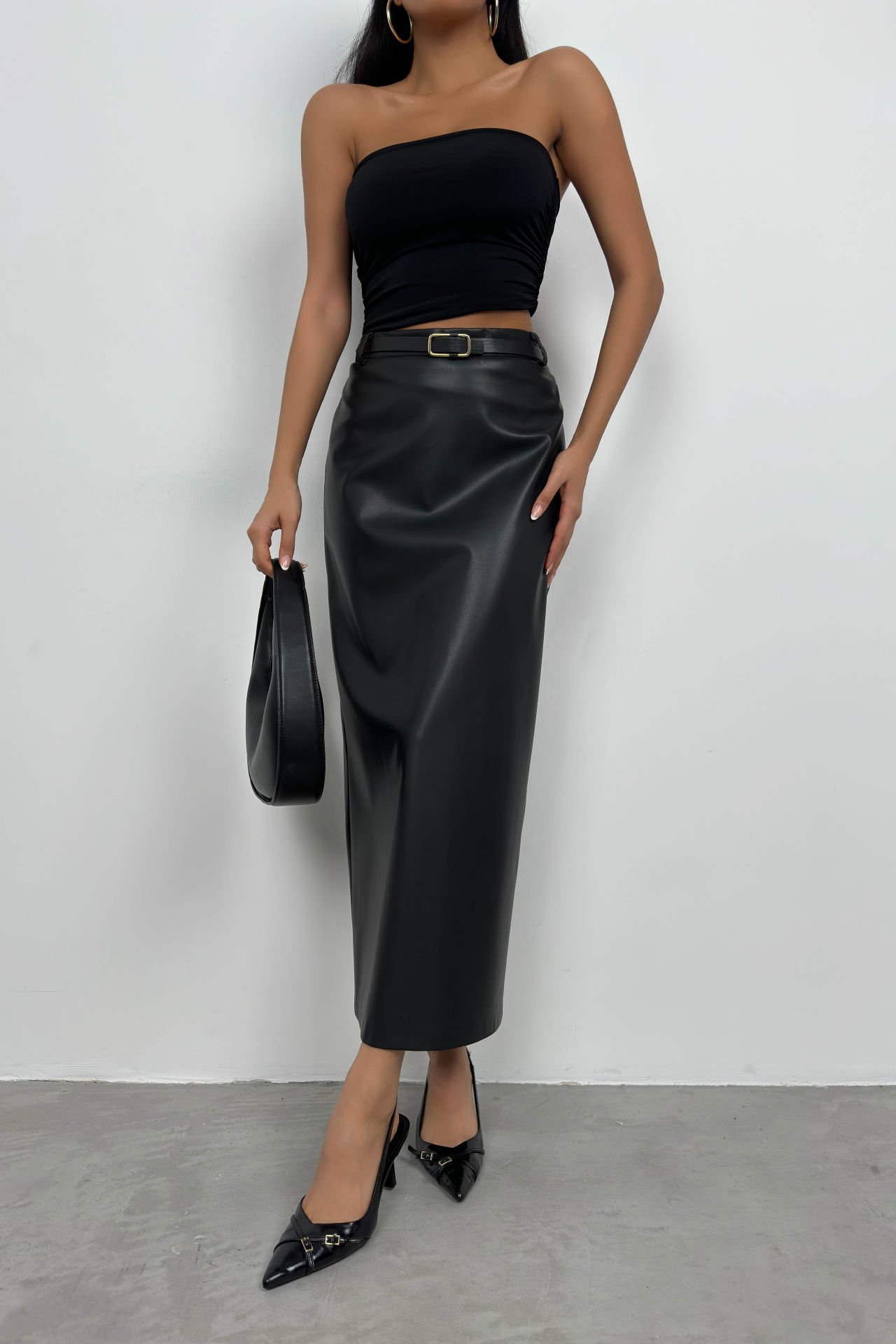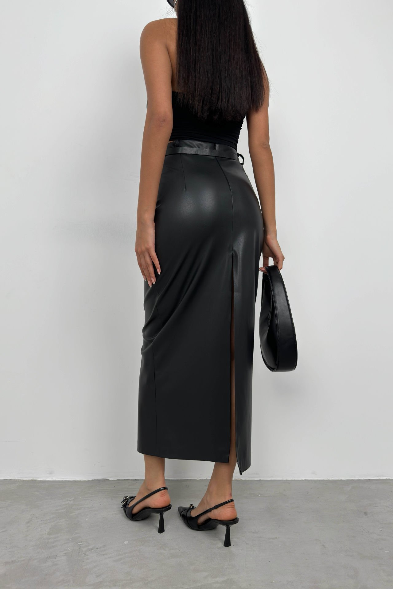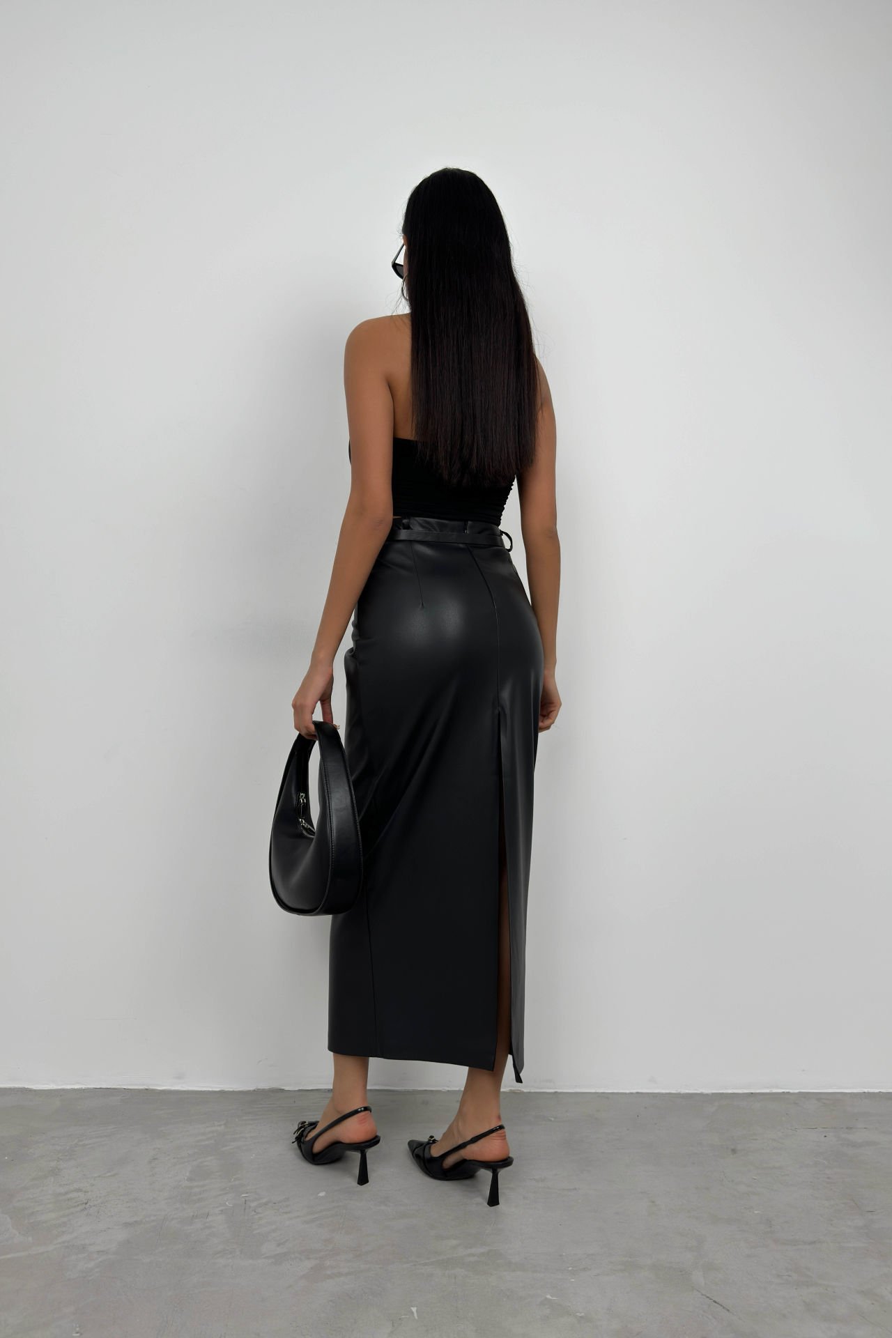 Yüksek Bel, Fermuar Detaylı, Yırtmaçlı, Maxi Boy, Deri Etek