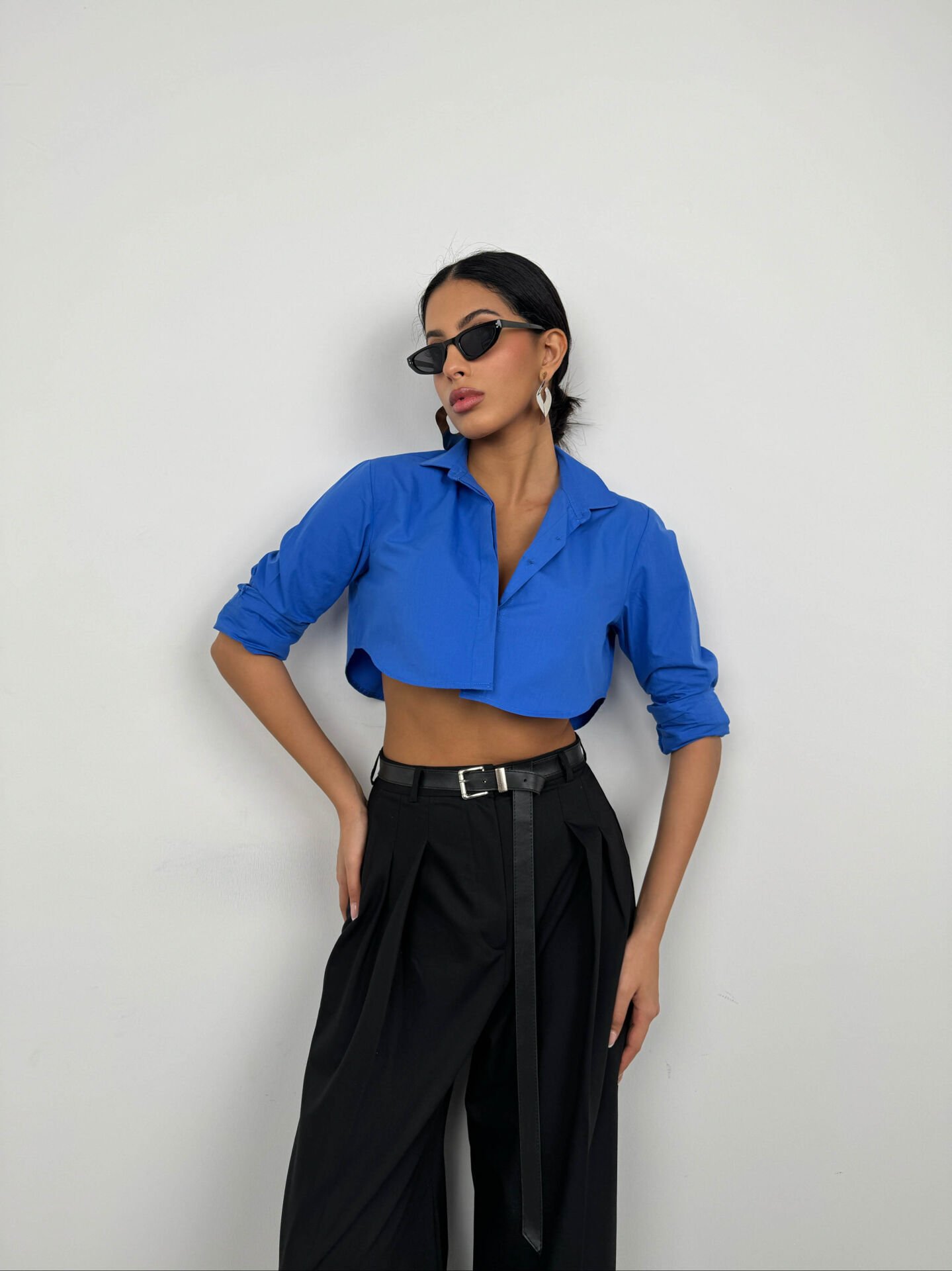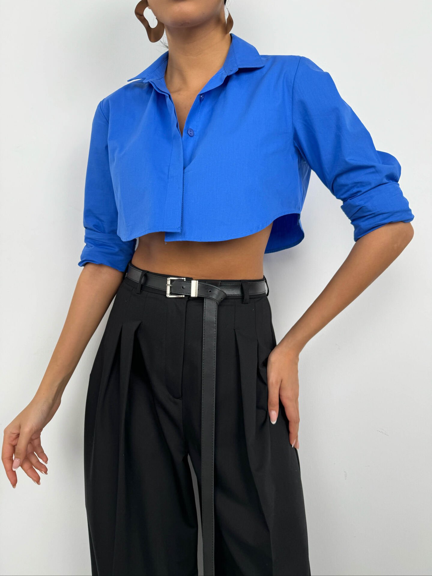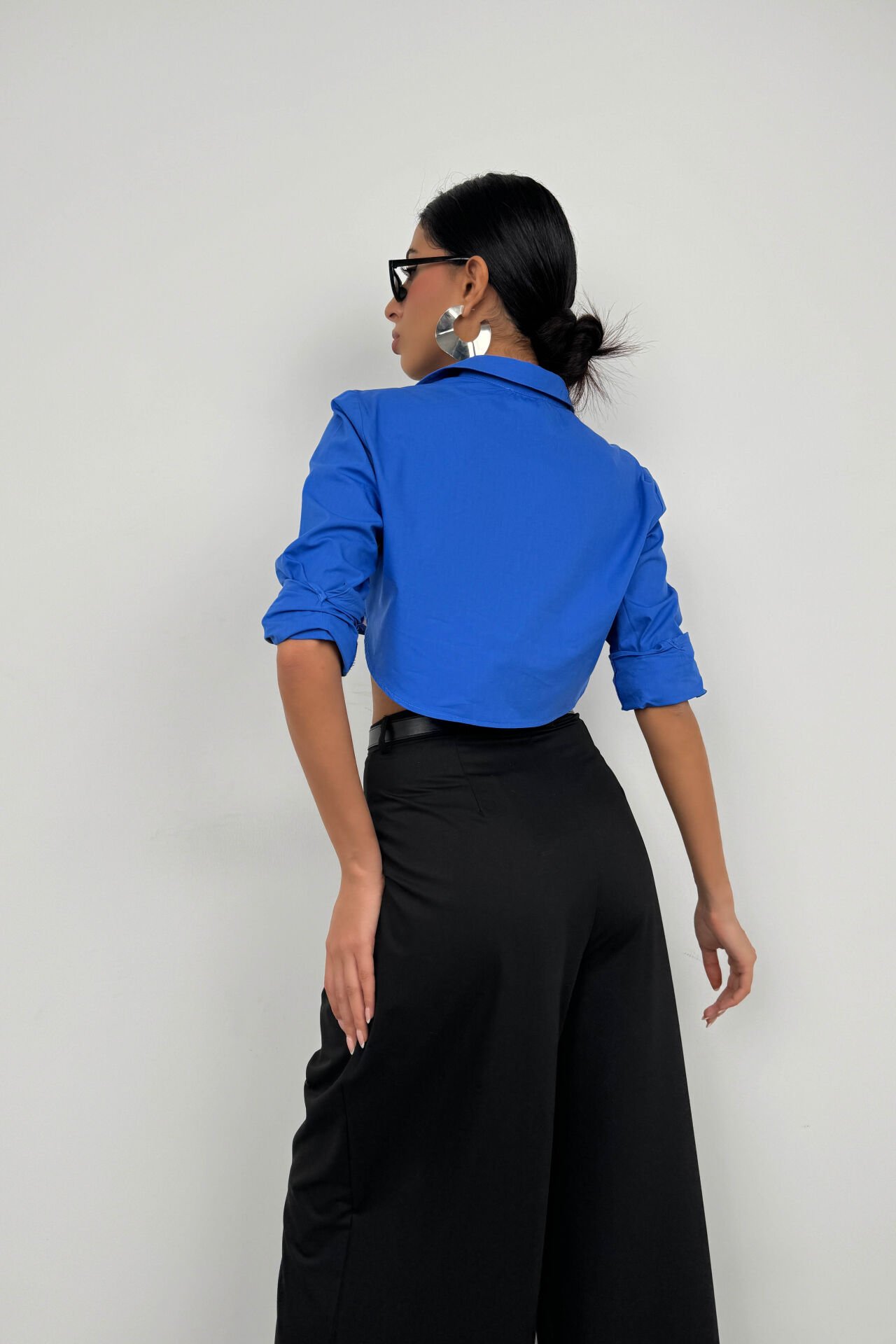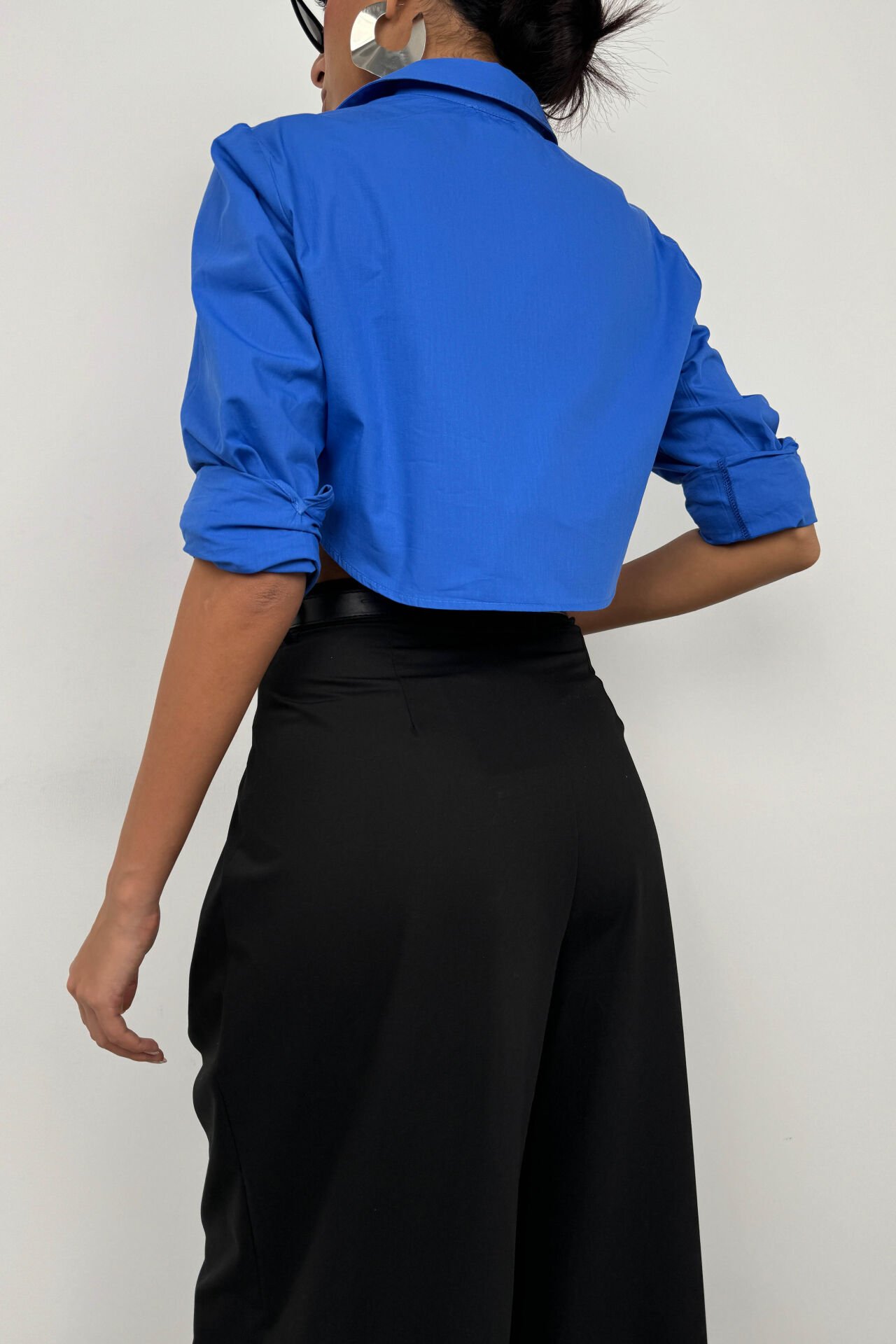 Uzun Manşet Detaylı, Uzun Kollu, Crop, Düğmeli, Gömlek Yaka, Katlamalı Yaka Sırtı Oval Bitişli Gömlek