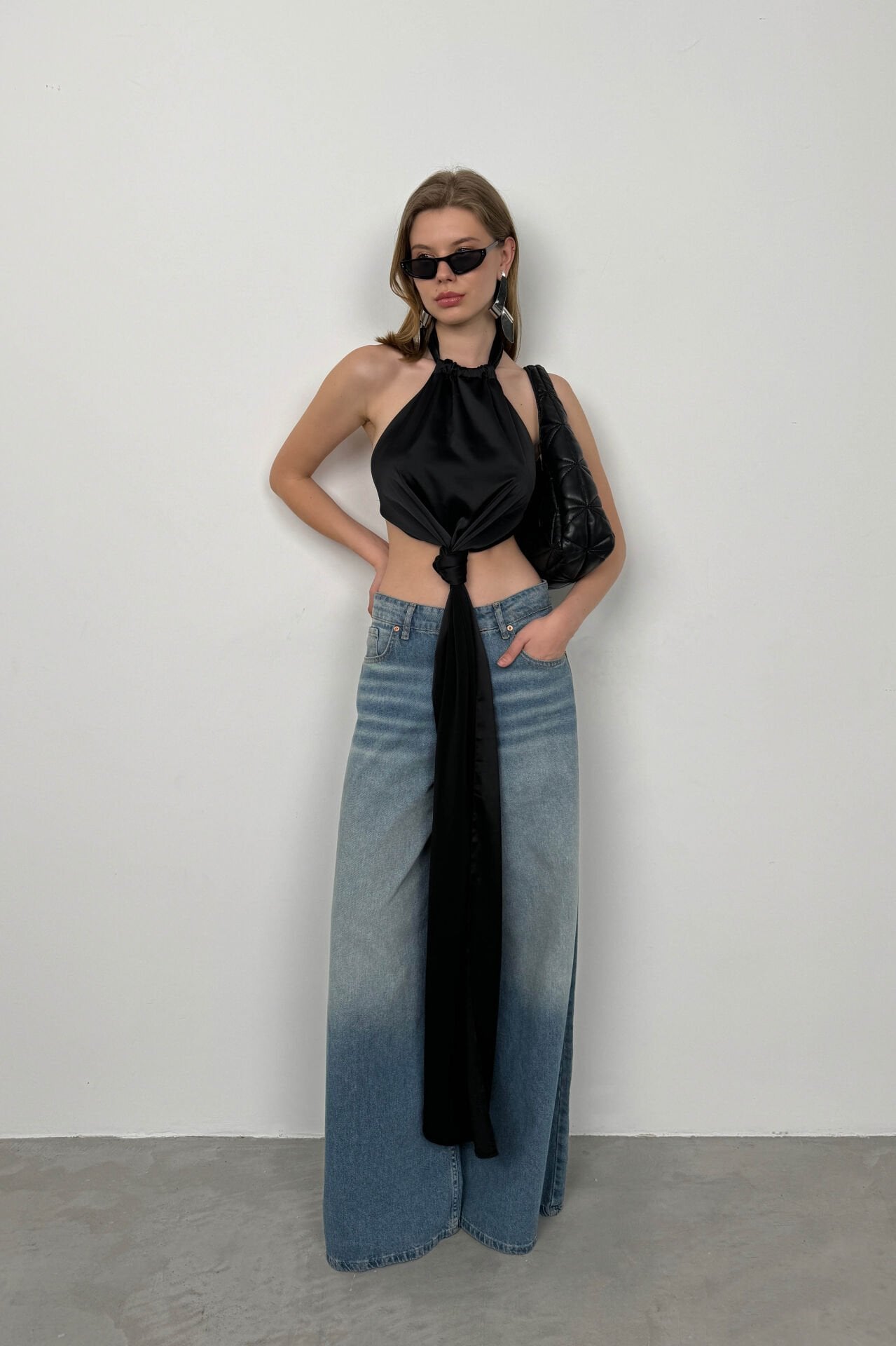 Toptan Önden Bağlamalı Siyah Saten Bluz