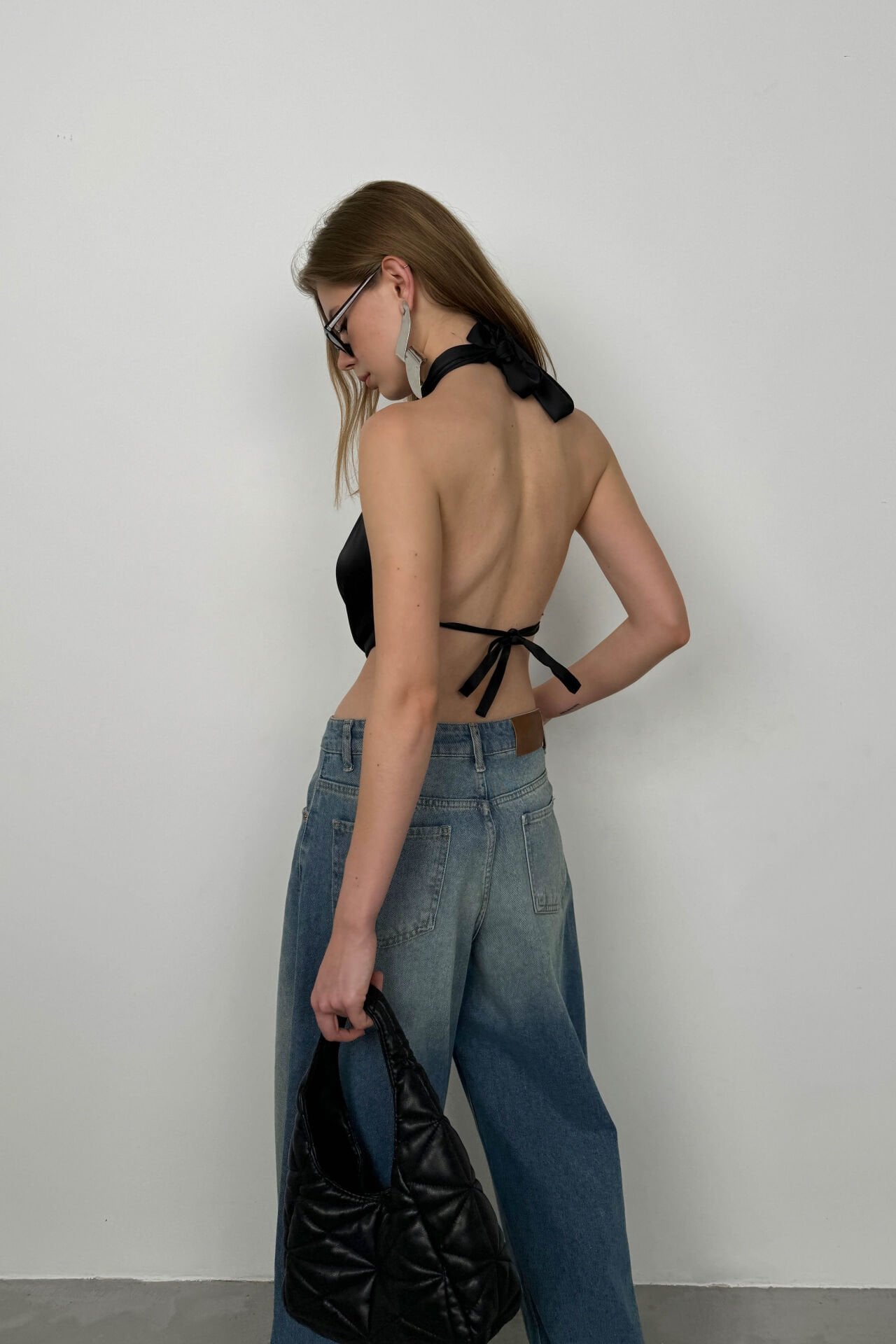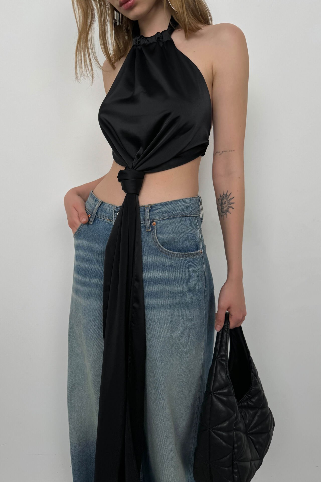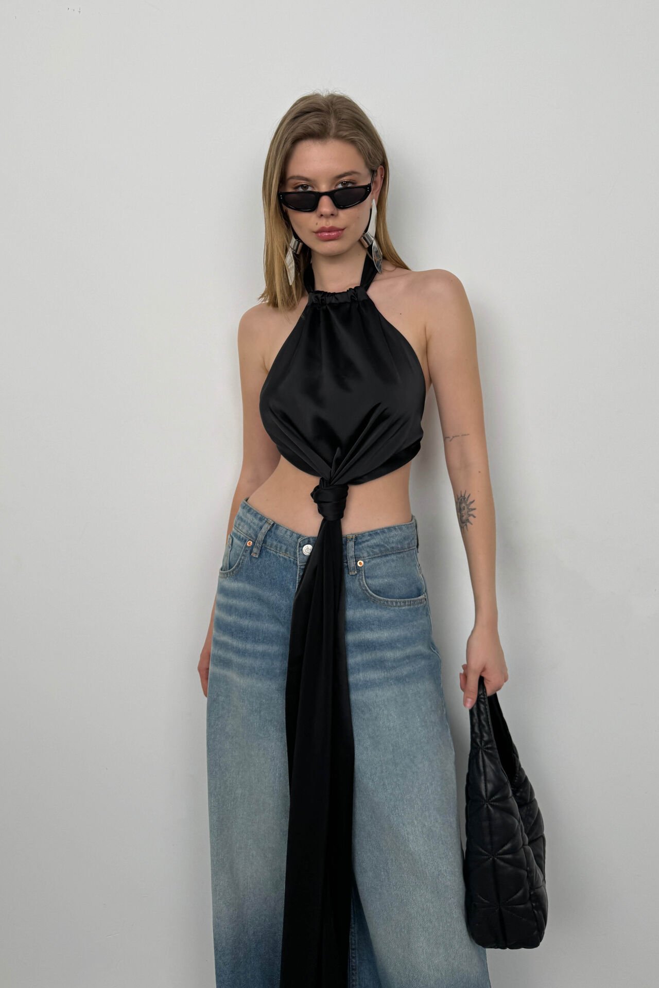 Önden Bağlamalı, Sırt Dekolteli, Boyun Bağlamalı, Kolsuz, Saten Kumaş, Bluz