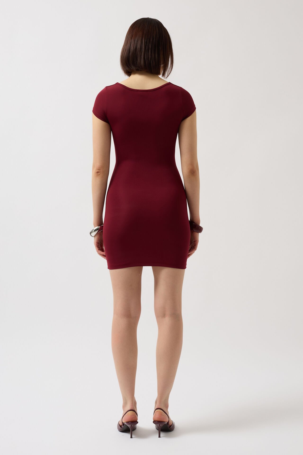 Toptan Pencere Detay Mini Dekolte Bordo Elbise