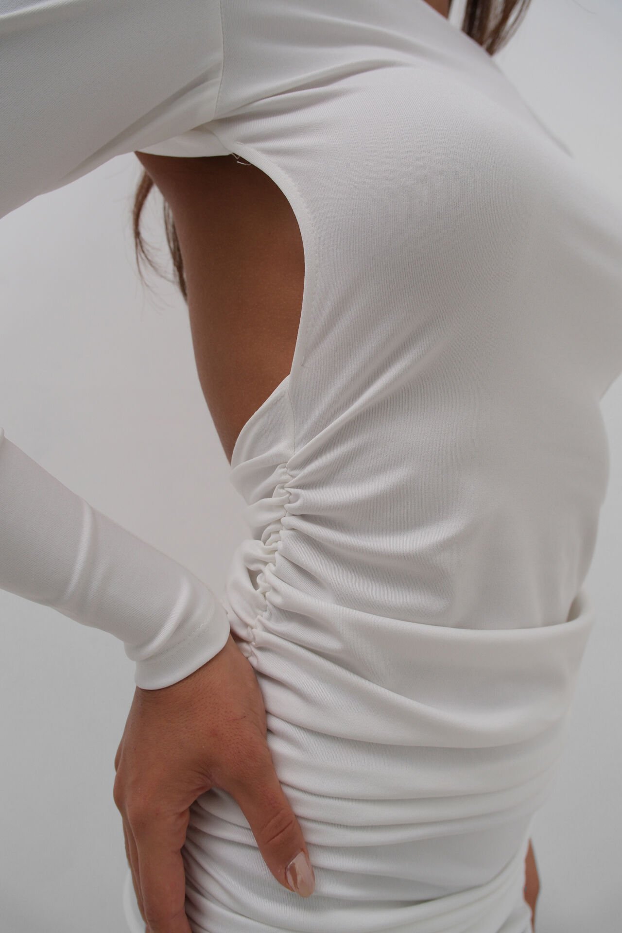 Sırtı Taş Detaylı Ve Dekolteli, Yanı Büzgülü, Likralı Kumaşlı Mini Elbise