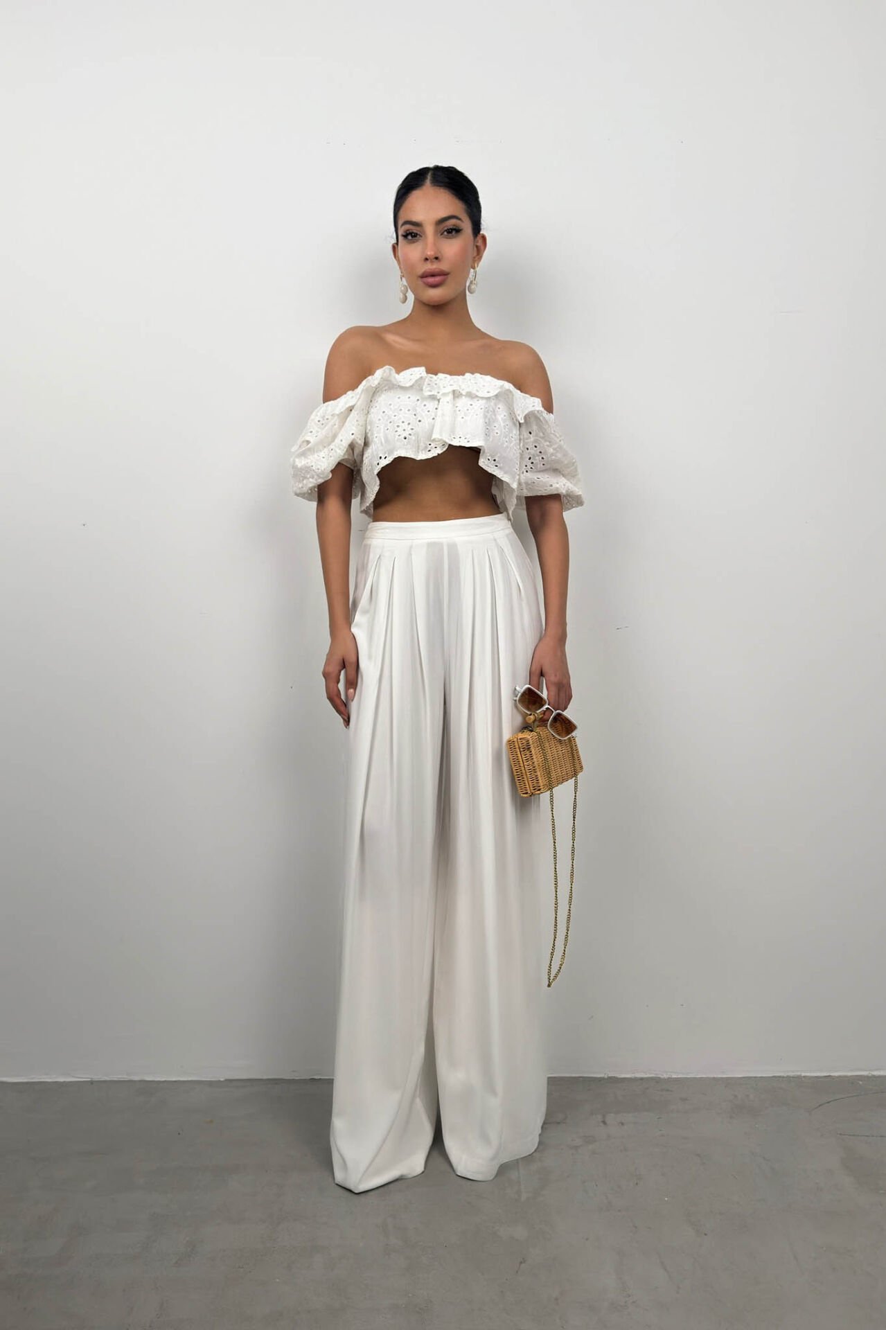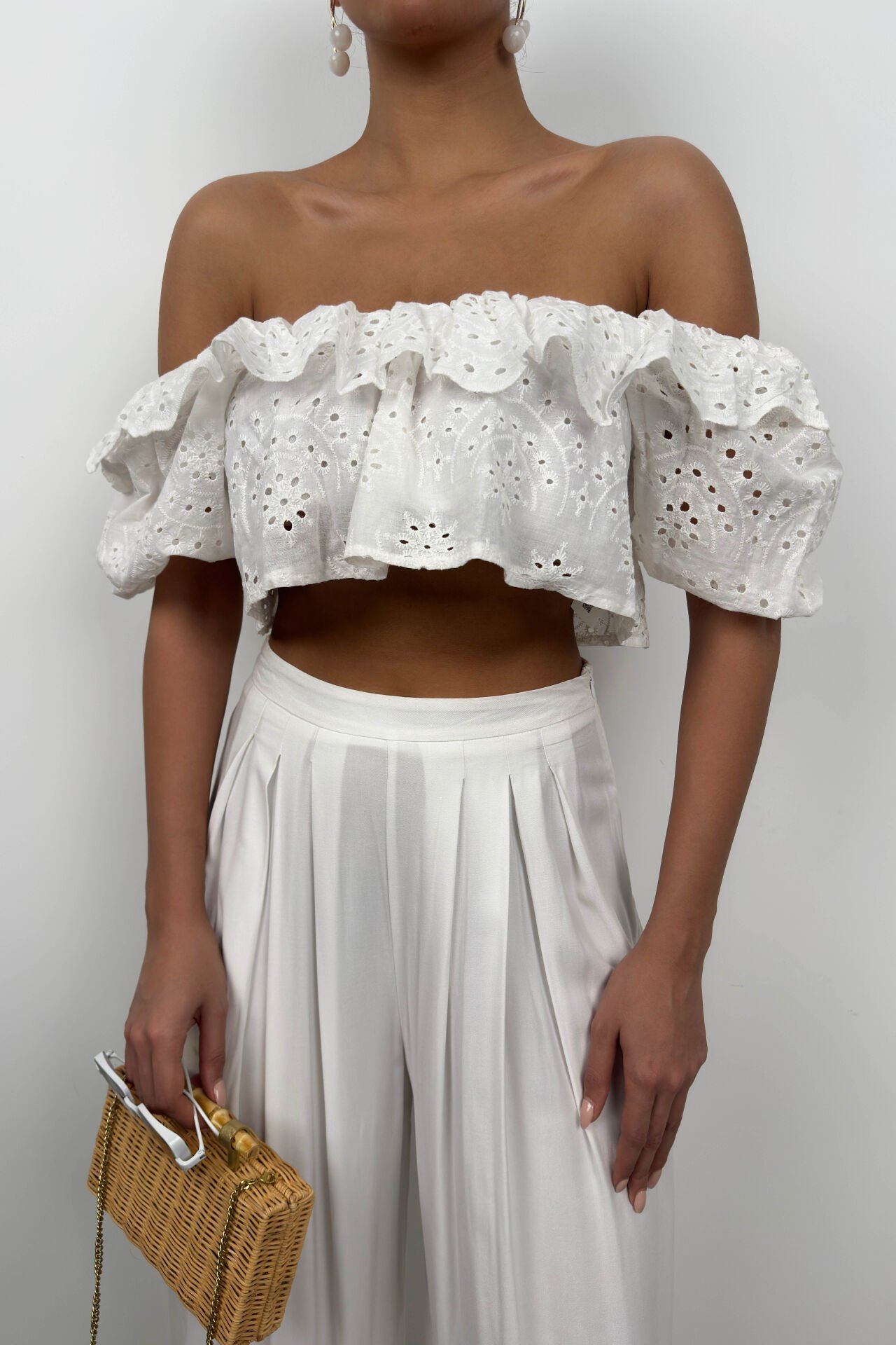 Straplez, Kol Dökümlü, Brodeli, Crop Bluz Fırfırlı, Şifon