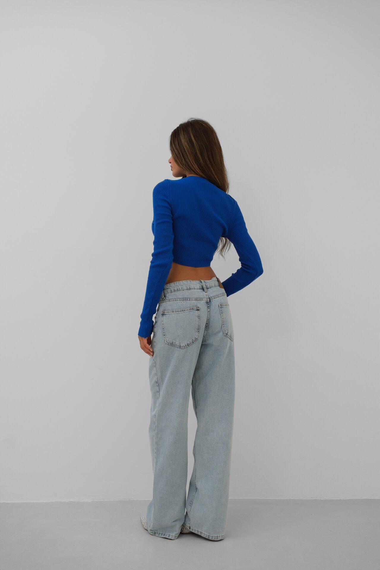 Toptan Taş Detay Triko Yaka Mavi Crop Bluz