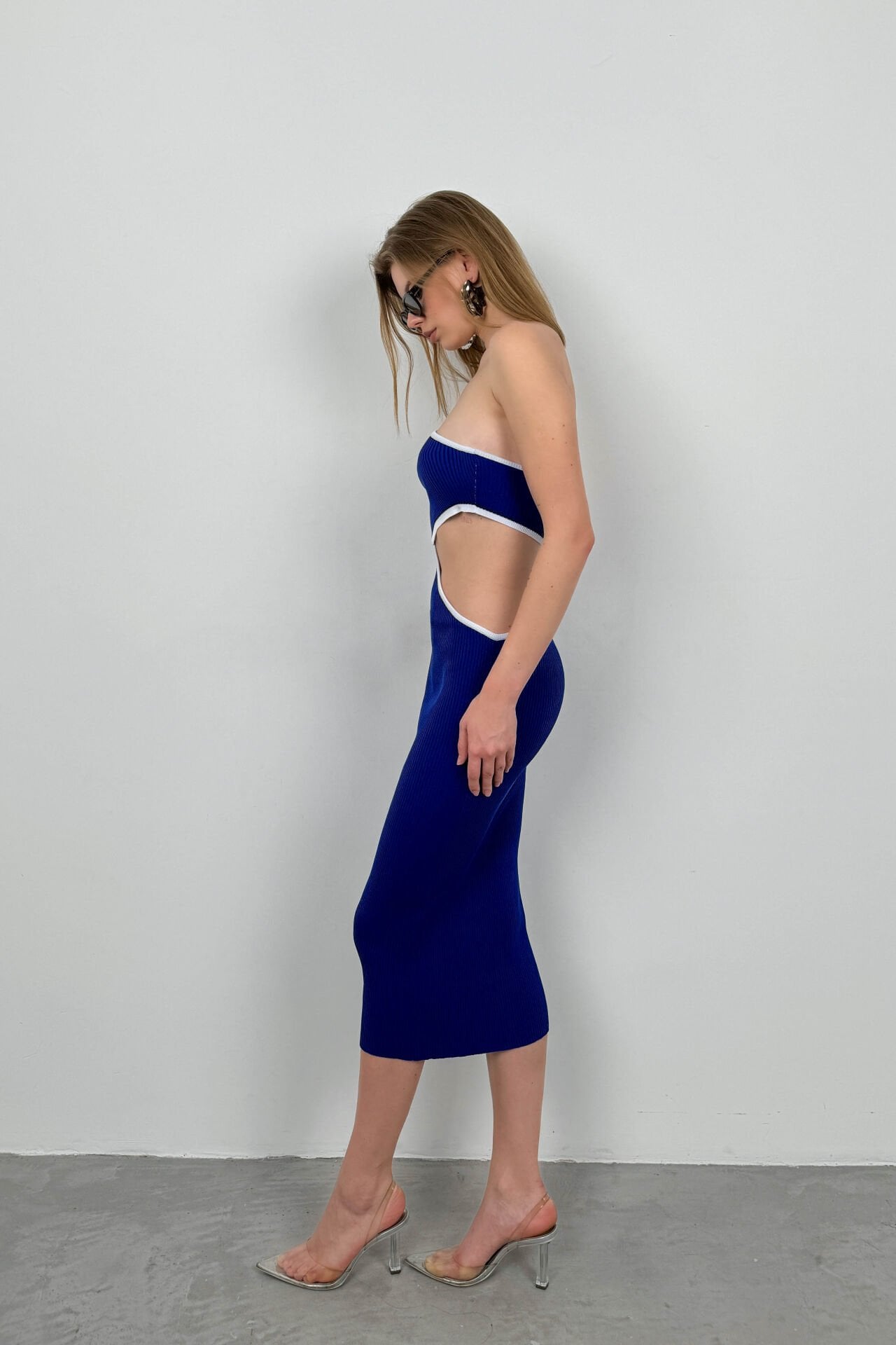 Tek Omuz Çift Askı, Karın Dekolteli, Asimetrik Görünümlü, Triko Örgü, Midi Boy, Slim Fit, Yırtmaçlı Elbise