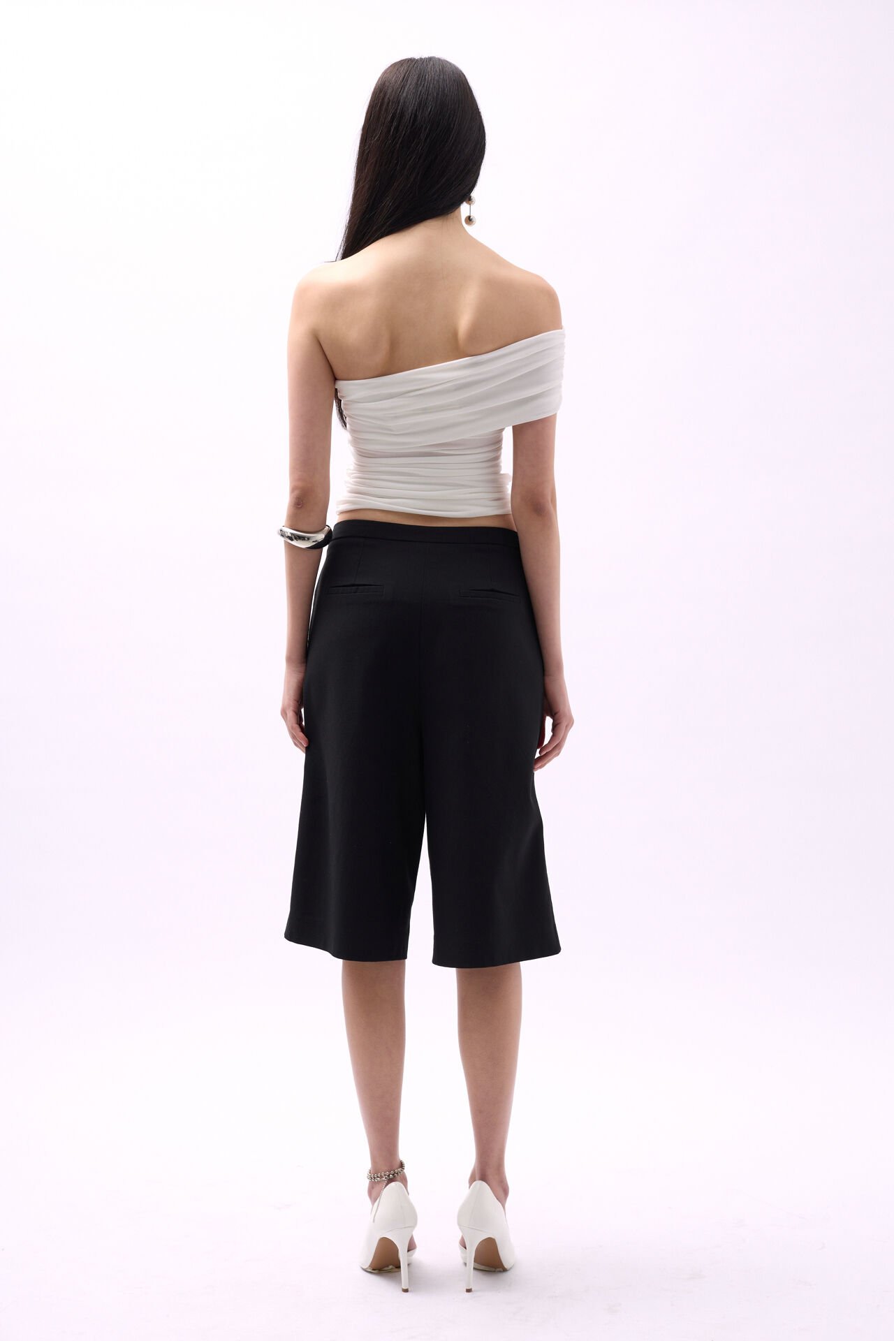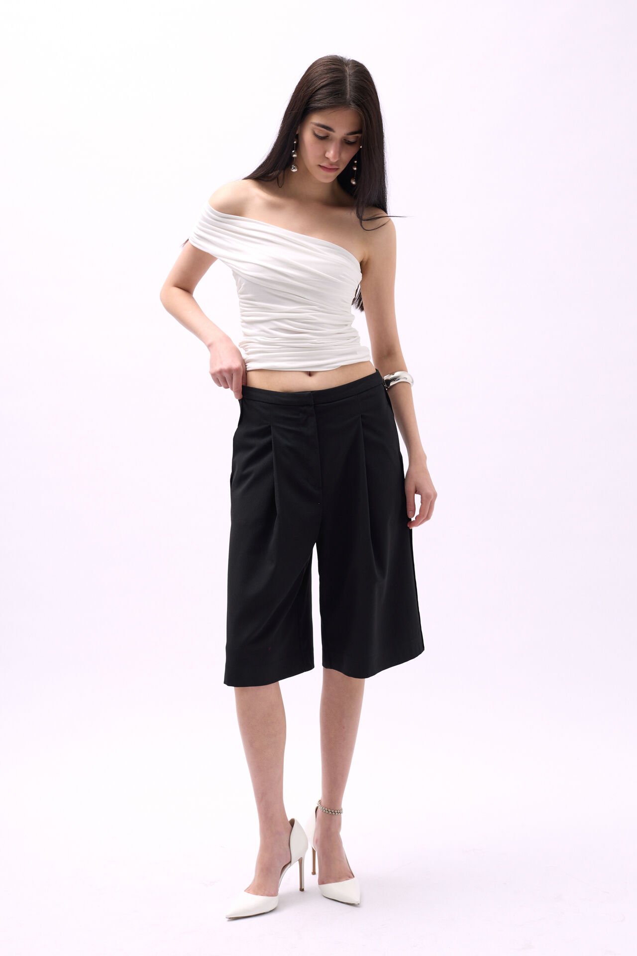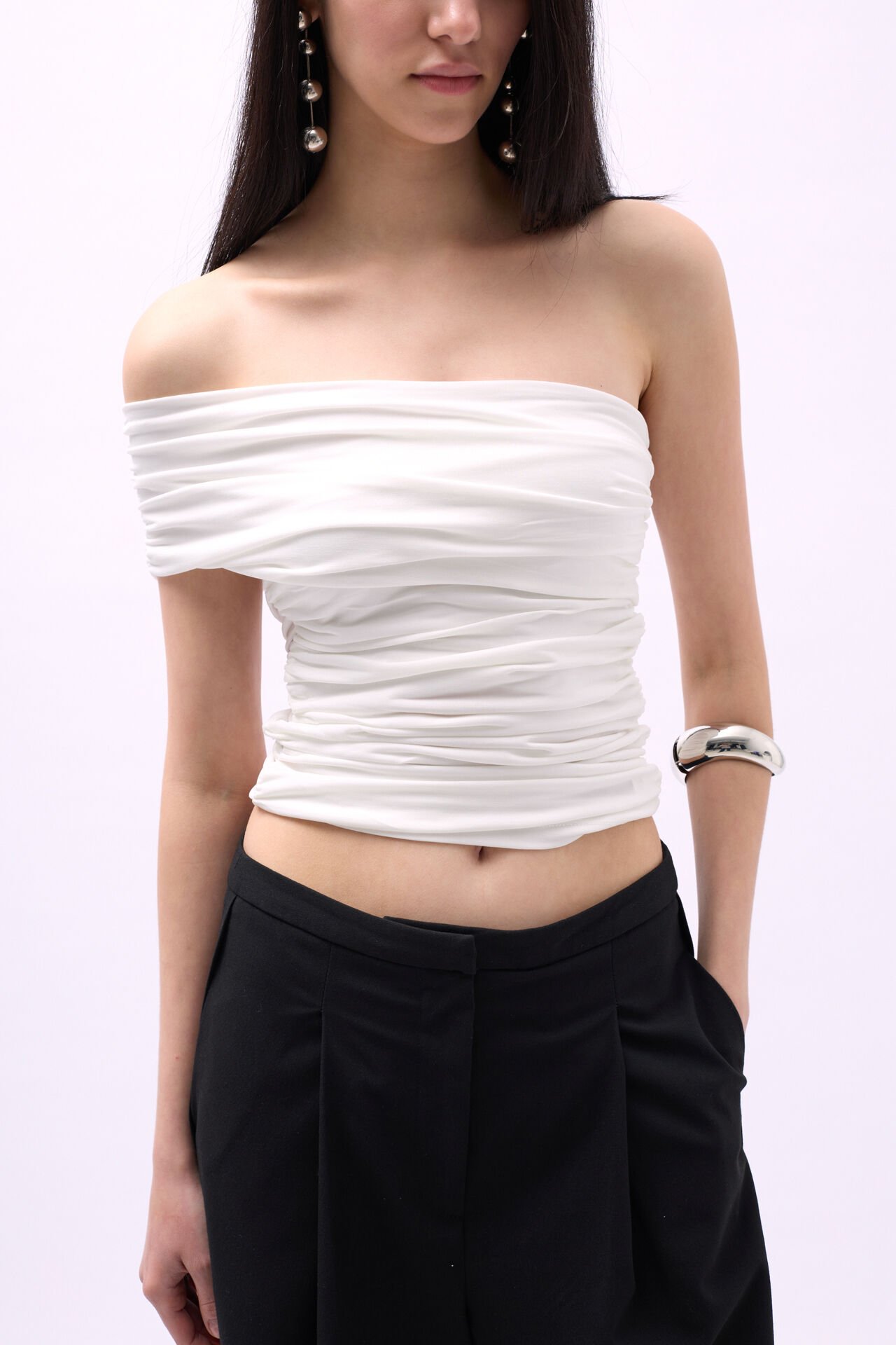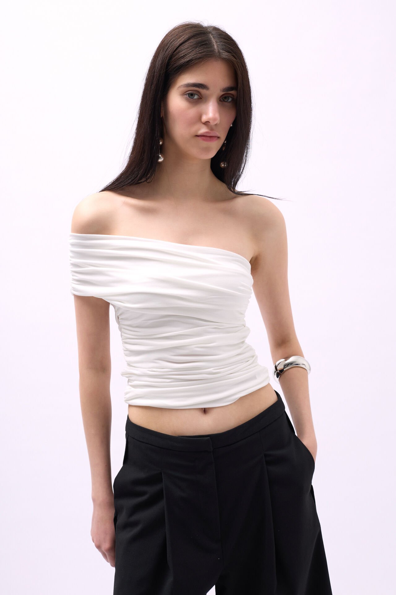 Toptan Tek Omuz Büzgülü Beyaz Bluz