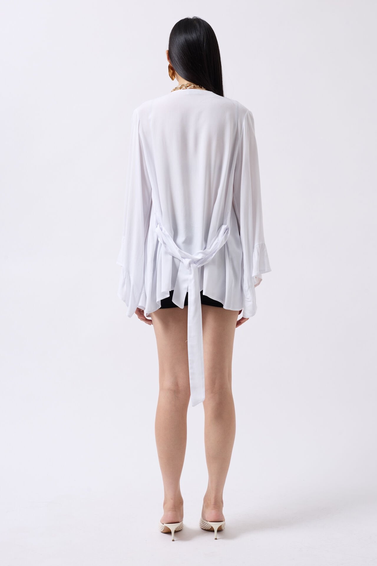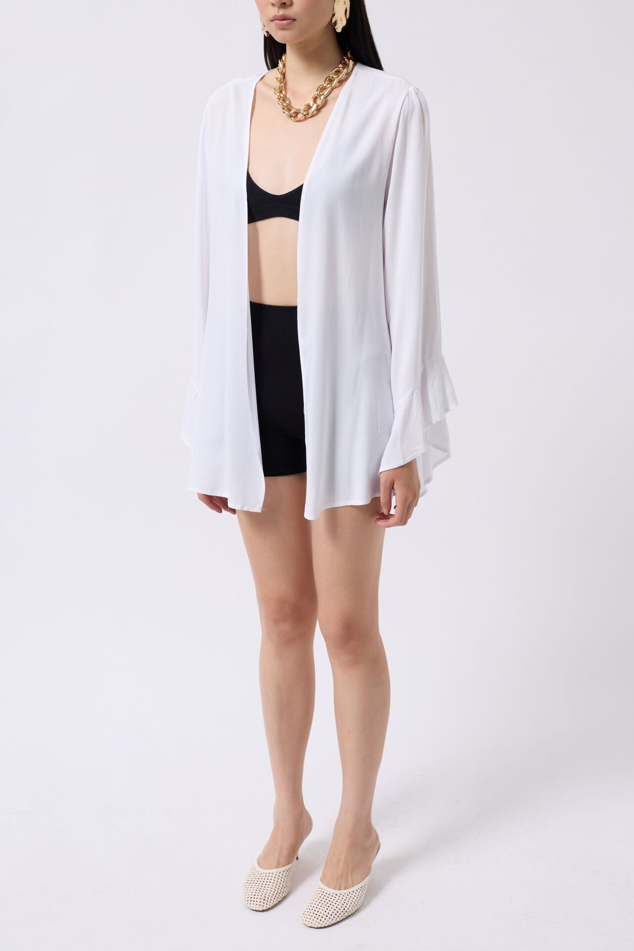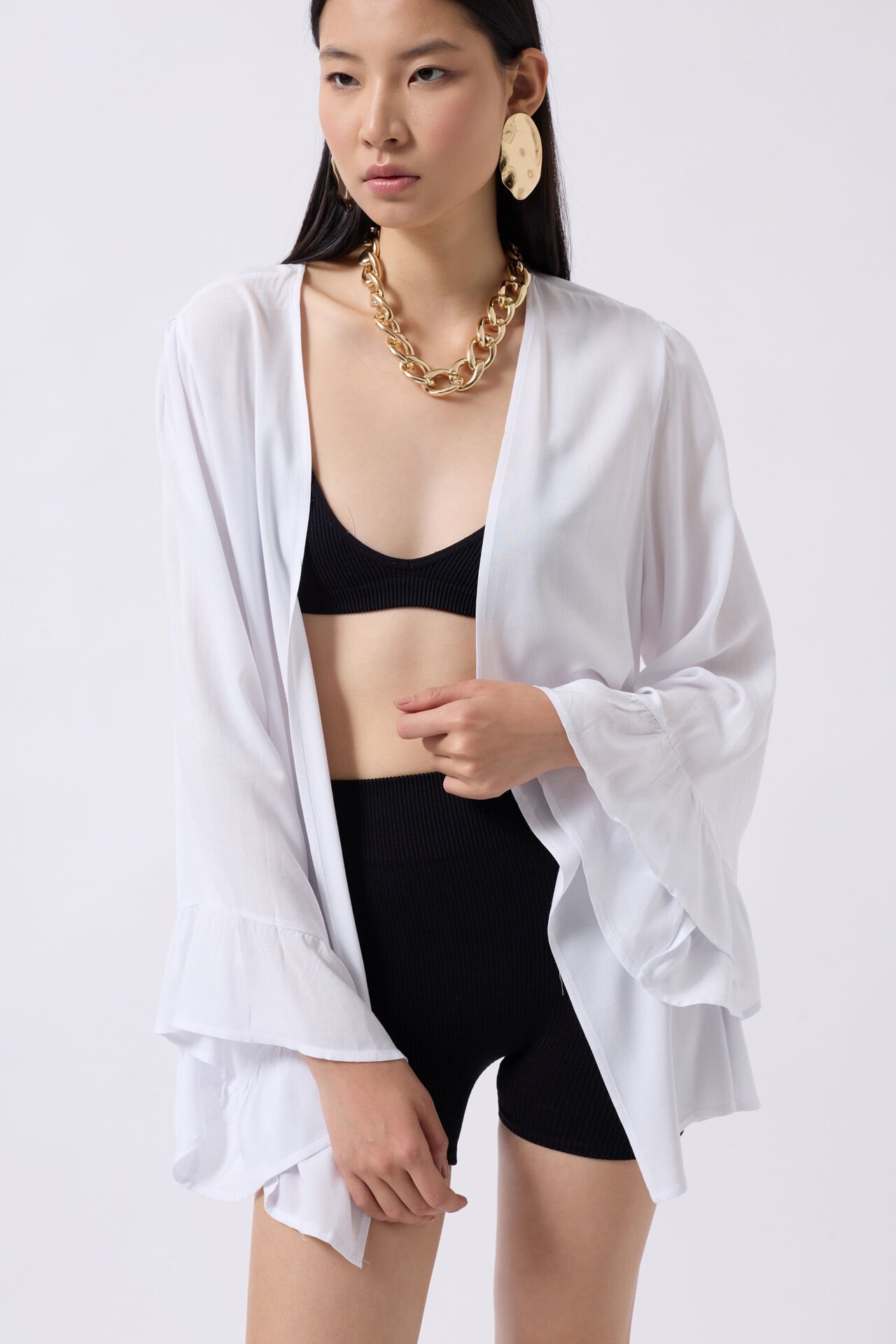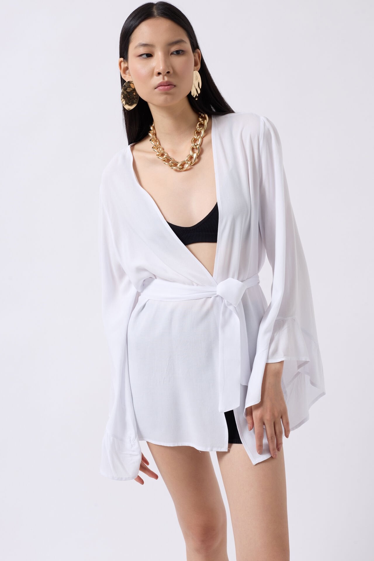 Toptan Volan Kol Bağcıklı Beyaz Kimono