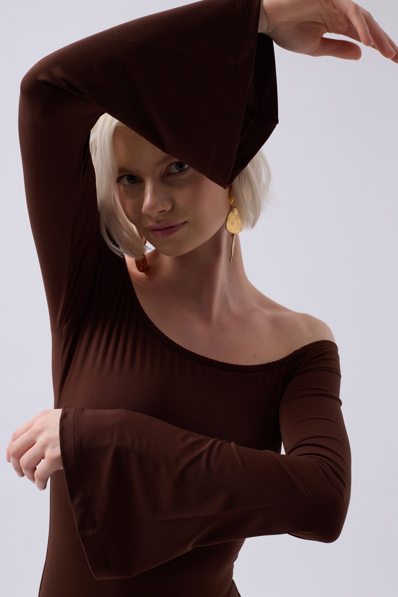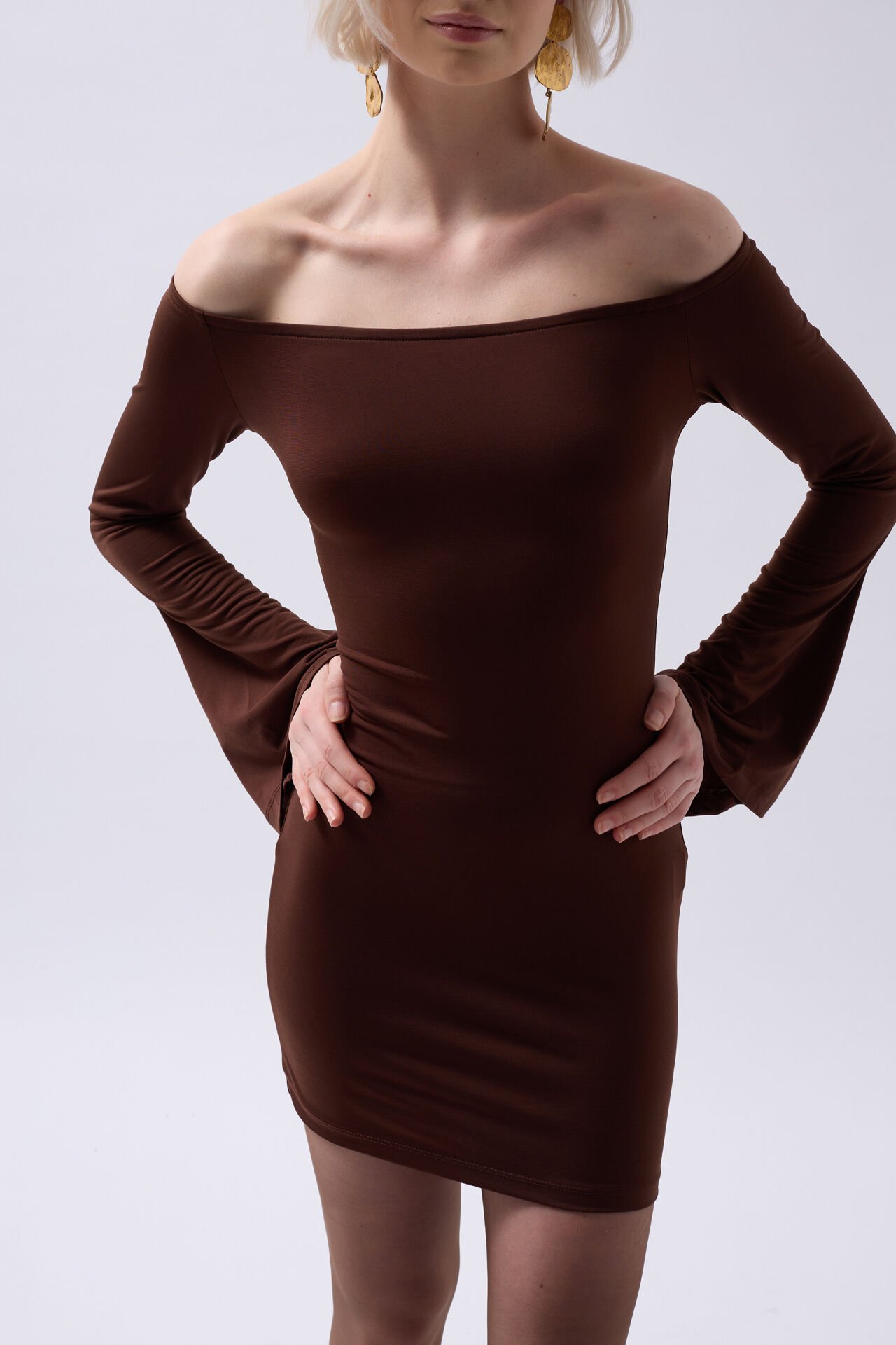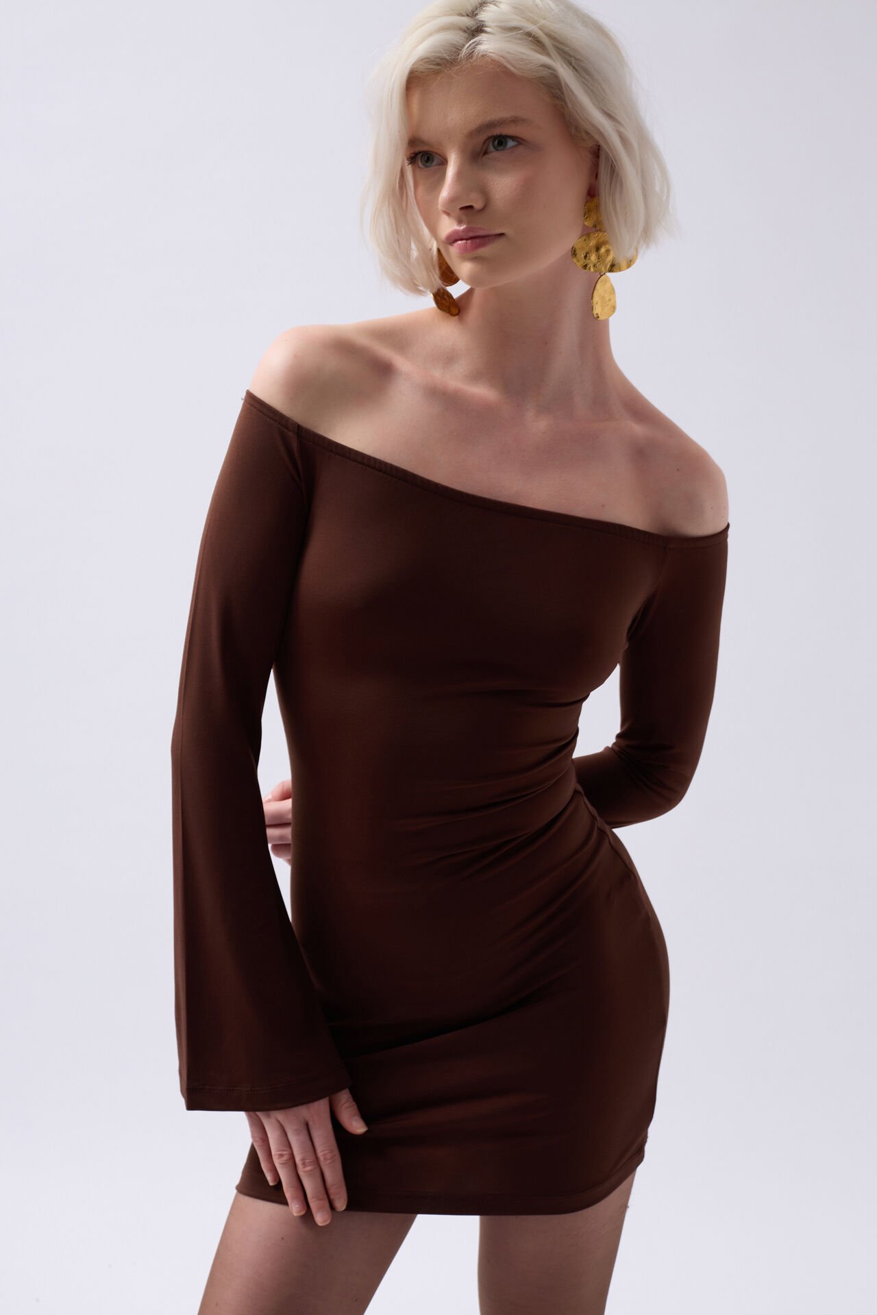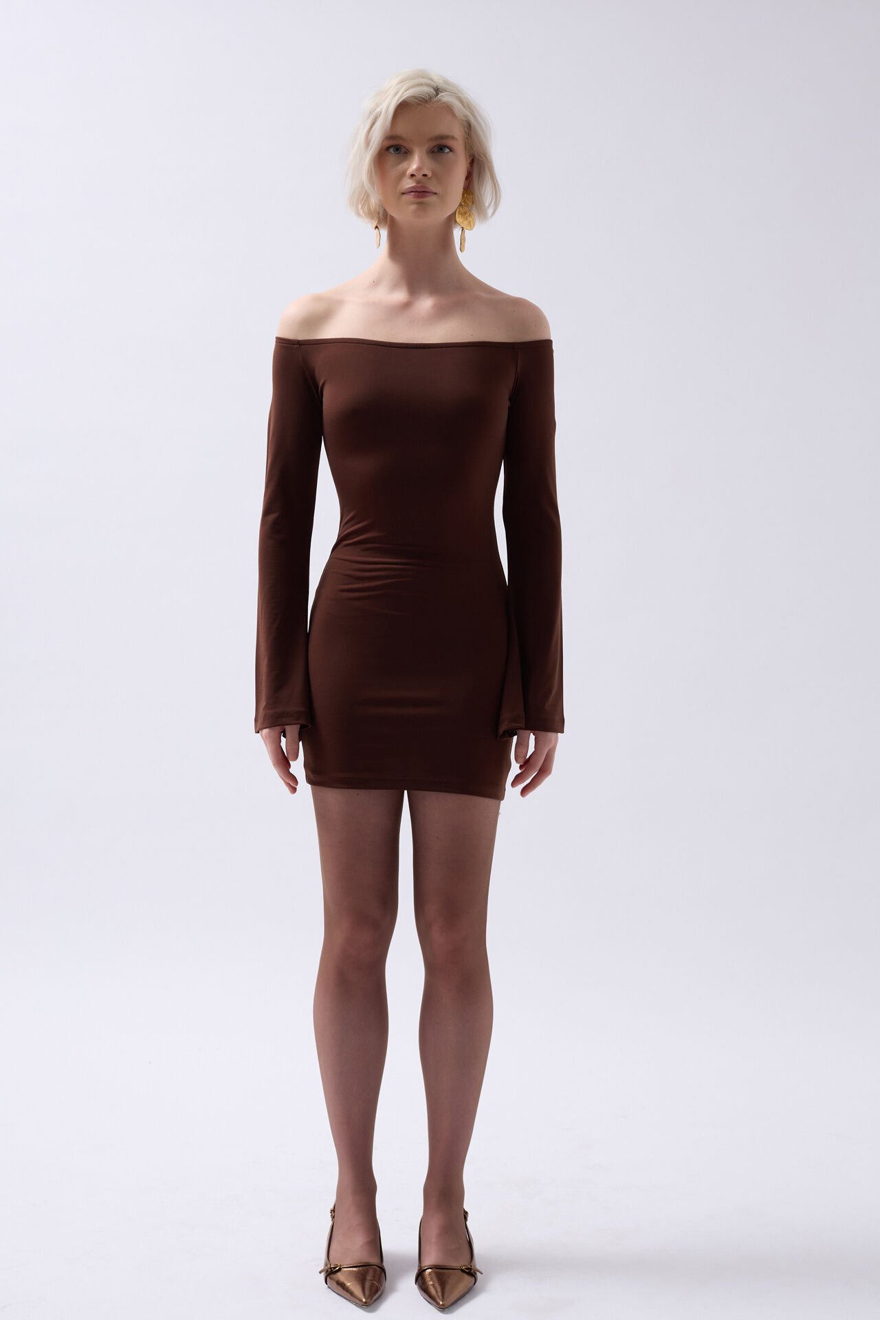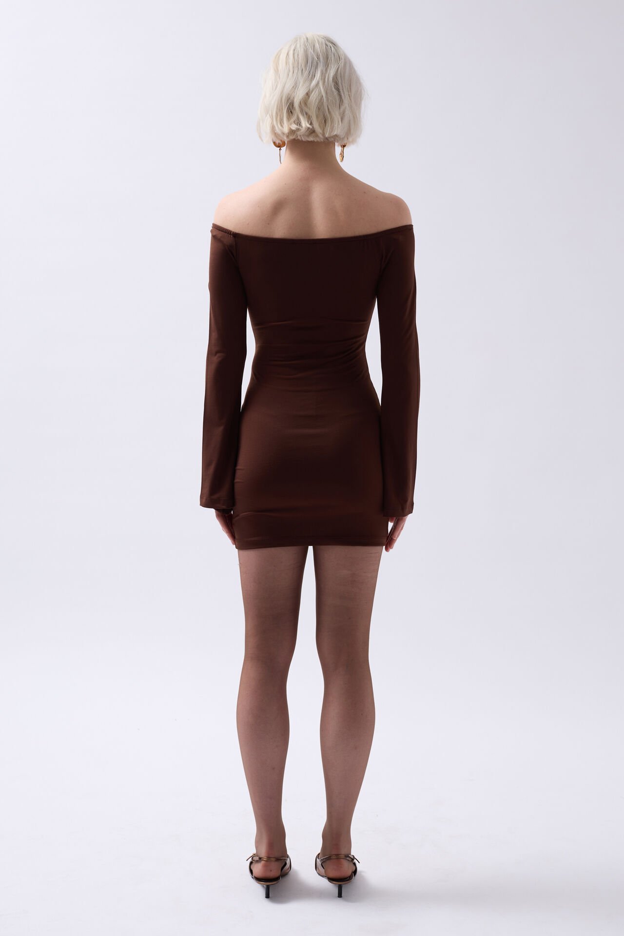 Toptan Volan Kol Straplez Mini Kahverengi Elbise