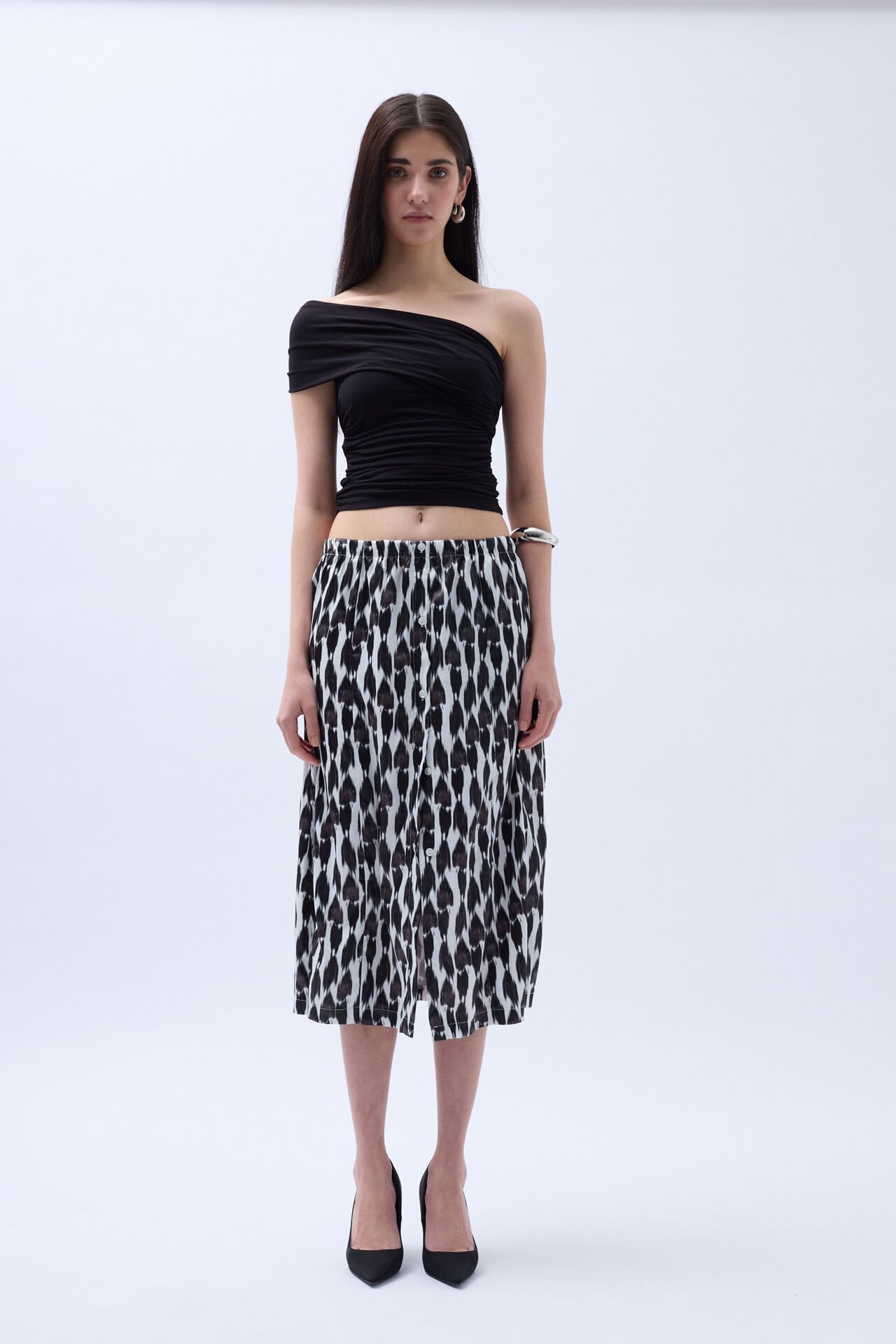 Yanı Yırtmaçlı, Düğmeli, Yüksek Bel, Maxi Boy, Desenli Etek