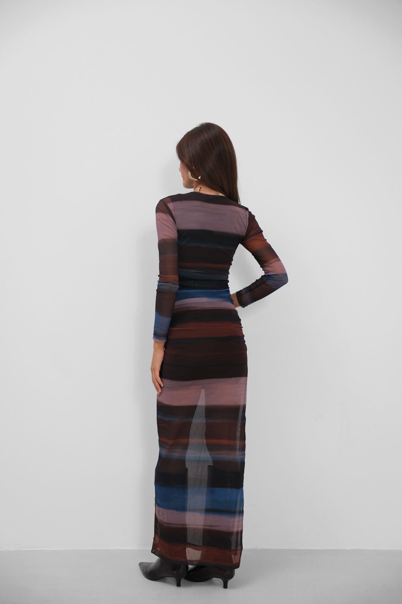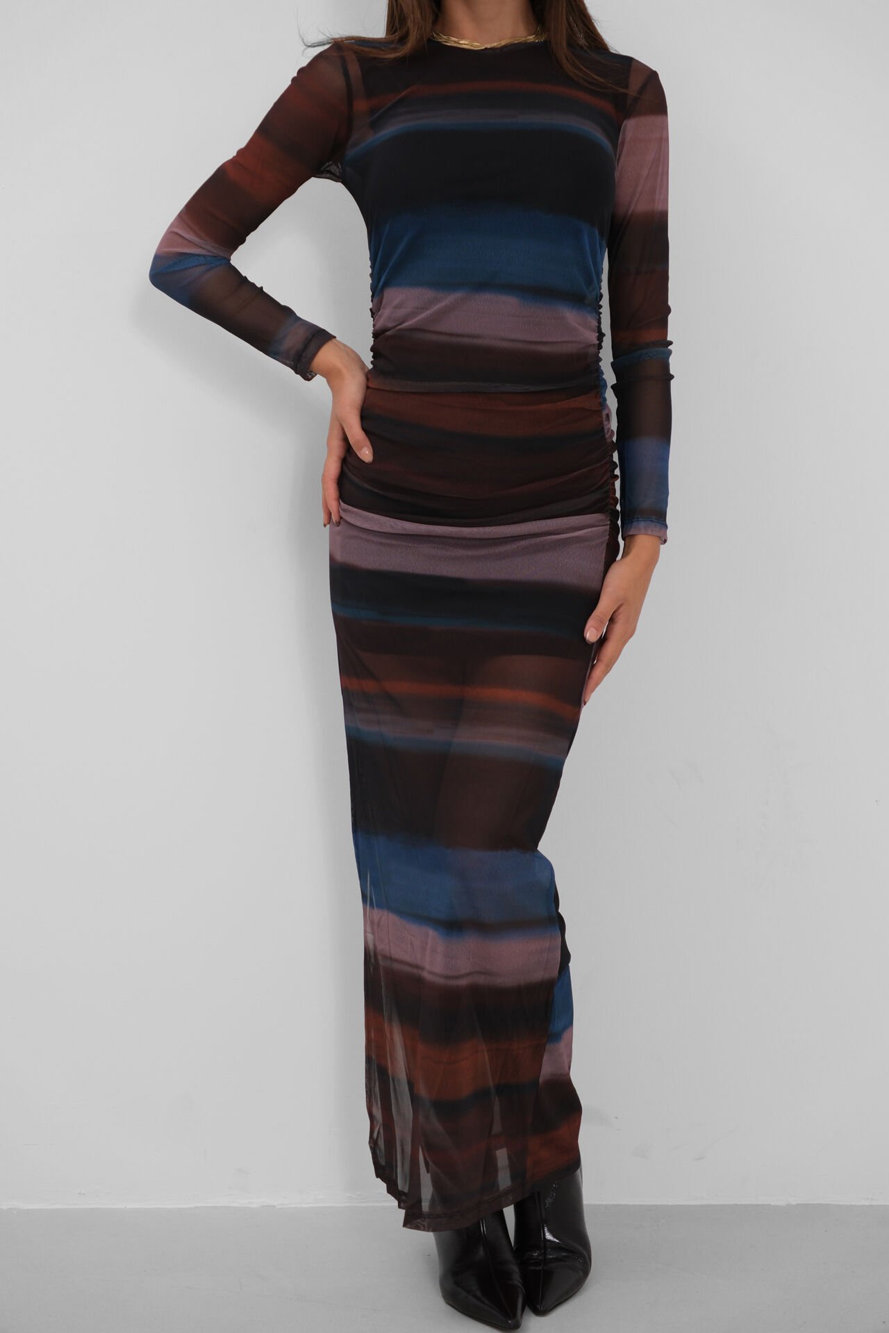 Tül Detaylı, Elbise, Fashion, Yırtmaçlı, Digital Baskılı, Uzun Kollu, Maxi