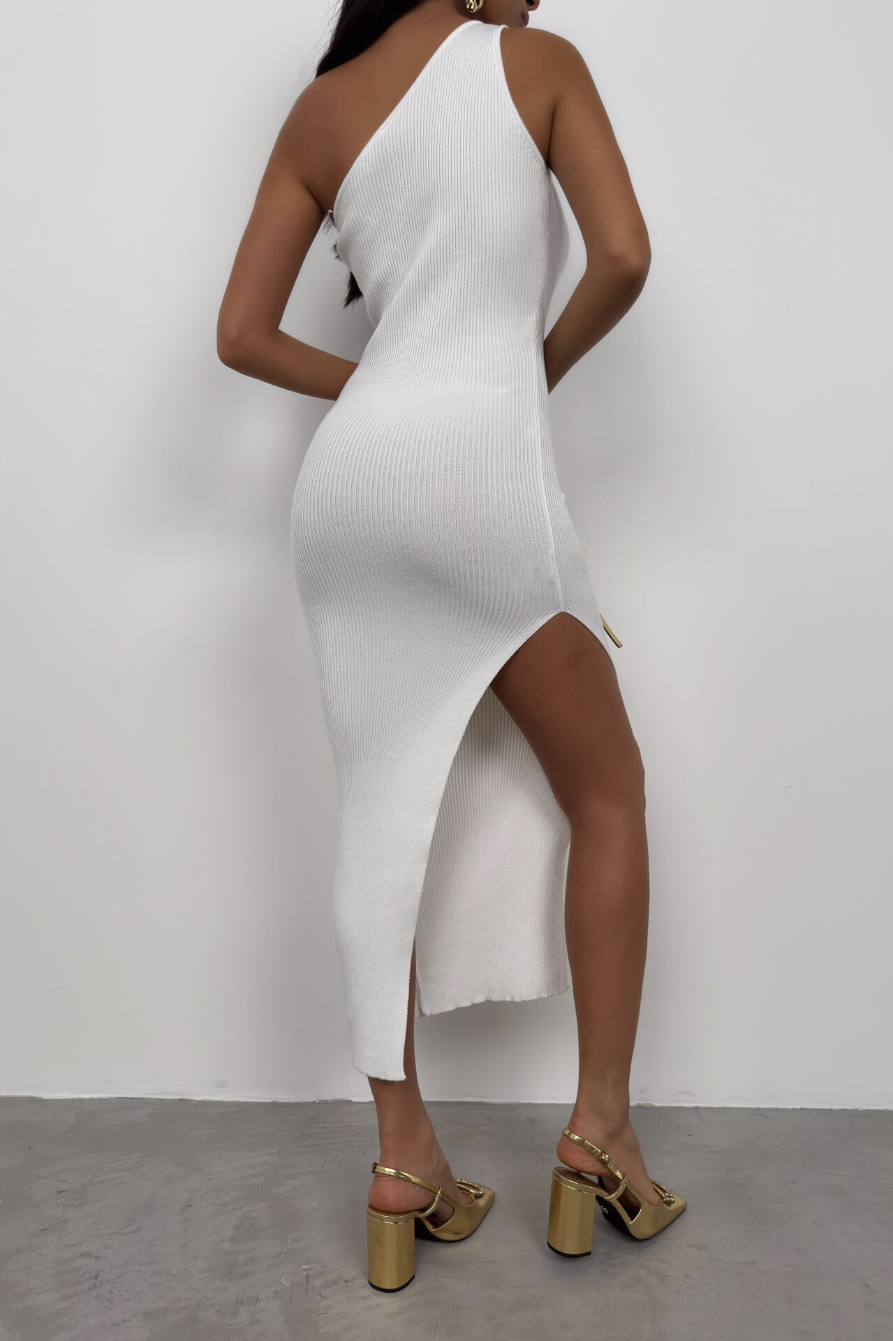 Toptan Yırtmaç Detay Tek Omuz Beyaz Elbise
